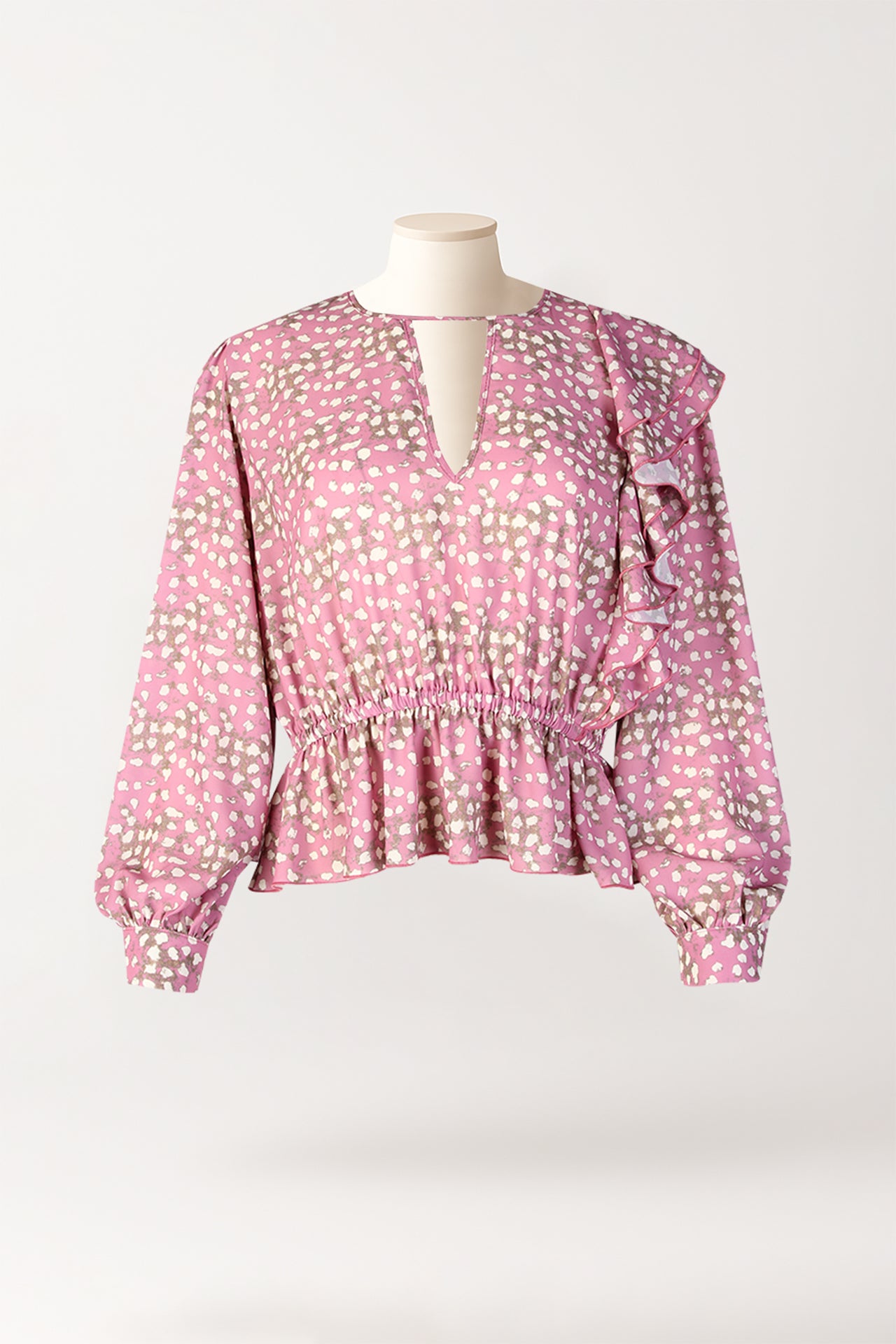 Blusa Sahoco em tecido fluido com estampado abstracto. O decote em V com abertura discreta e o detalhe de folho lateral conferem feminilidade e movimento. Com cintura marcada e mangas compridas, é uma peça versátil que pode ser usada em ocasiões casuais ou formais, sempre com elegância.