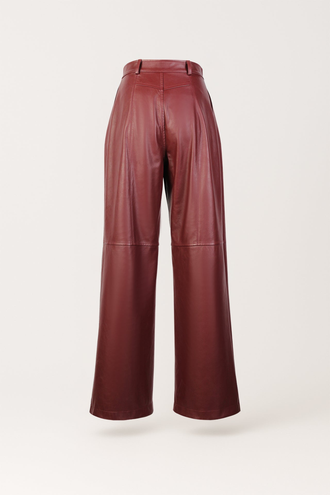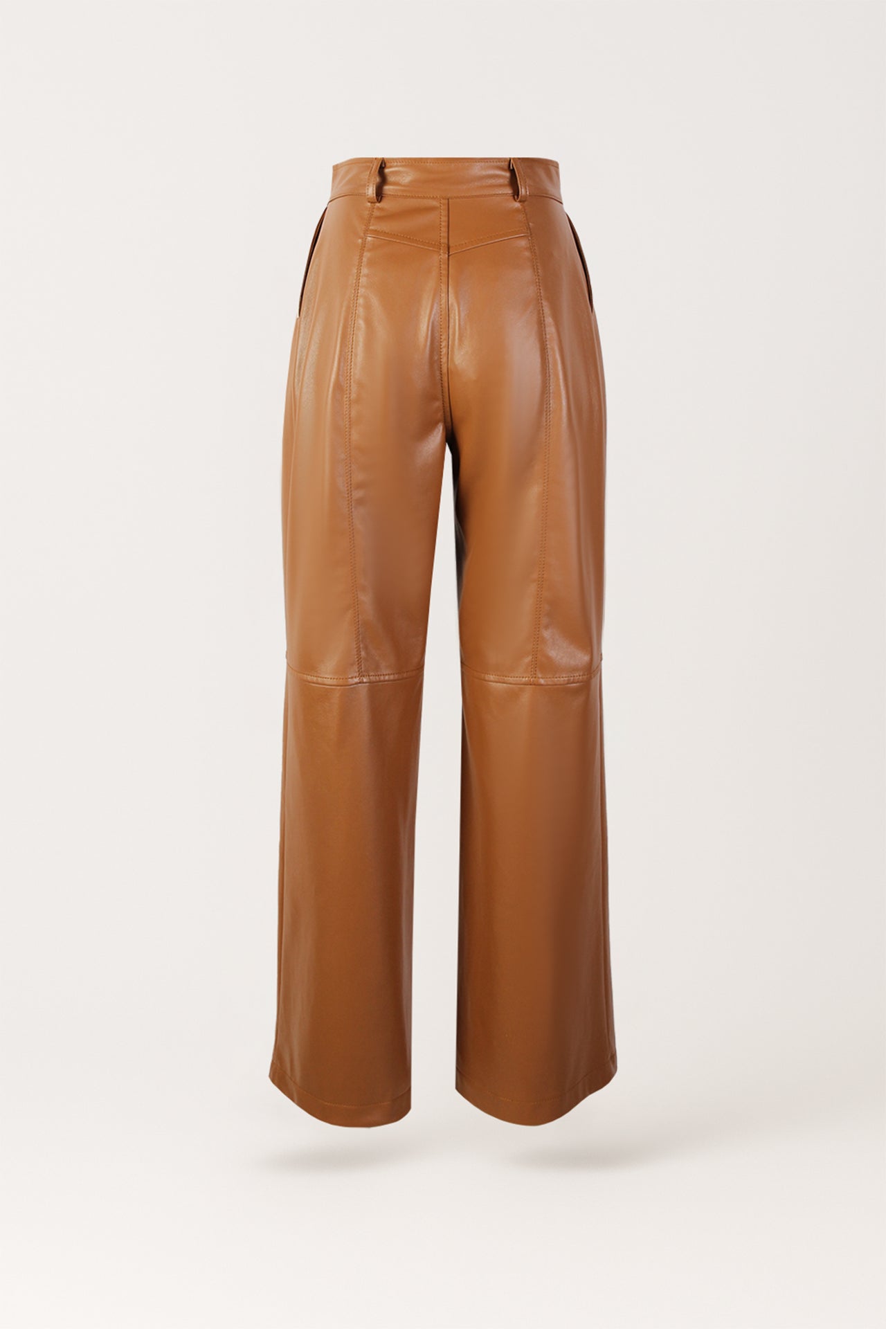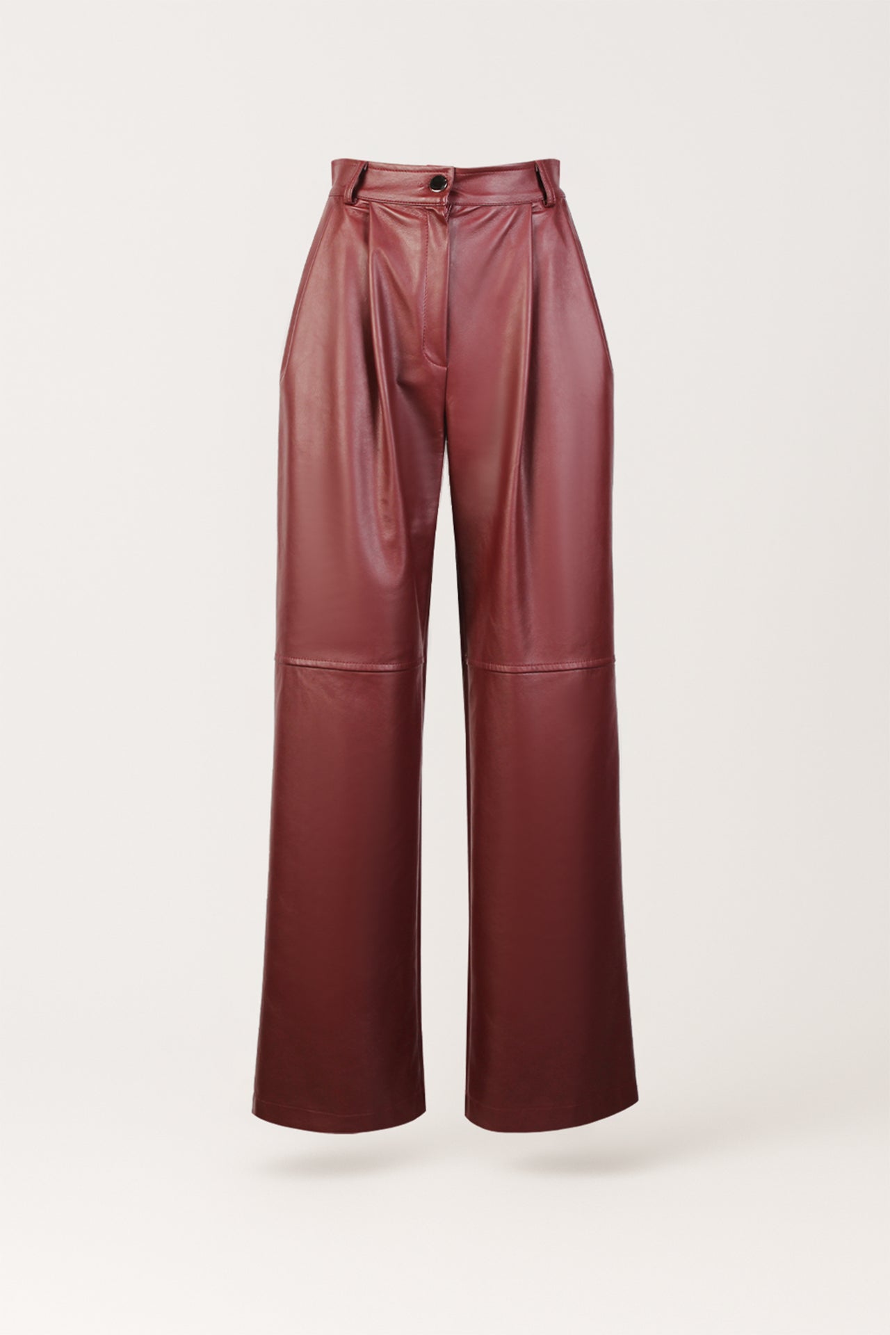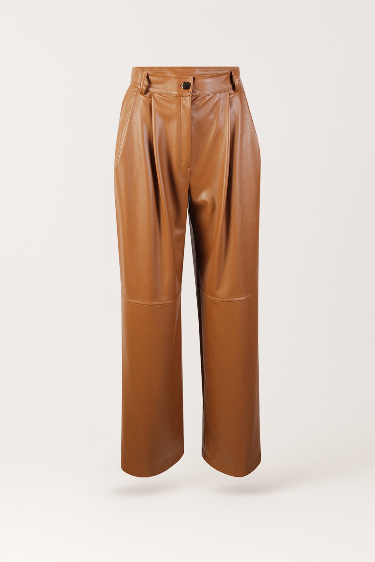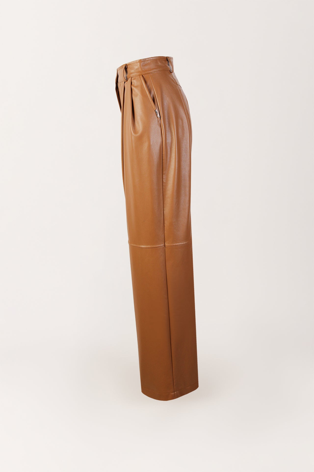 Calças de corte largo em eco pele macia, com acabamento mate e textura flexível. A cintura média e as pregas frontais criam estrutura e volume equilibrado, mantendo conforto e movimento. Fecho frontal com botão e passantes de cinto completam uma construção precisa, pensada para coordenados de linhas limpas ou combinações de contraste.