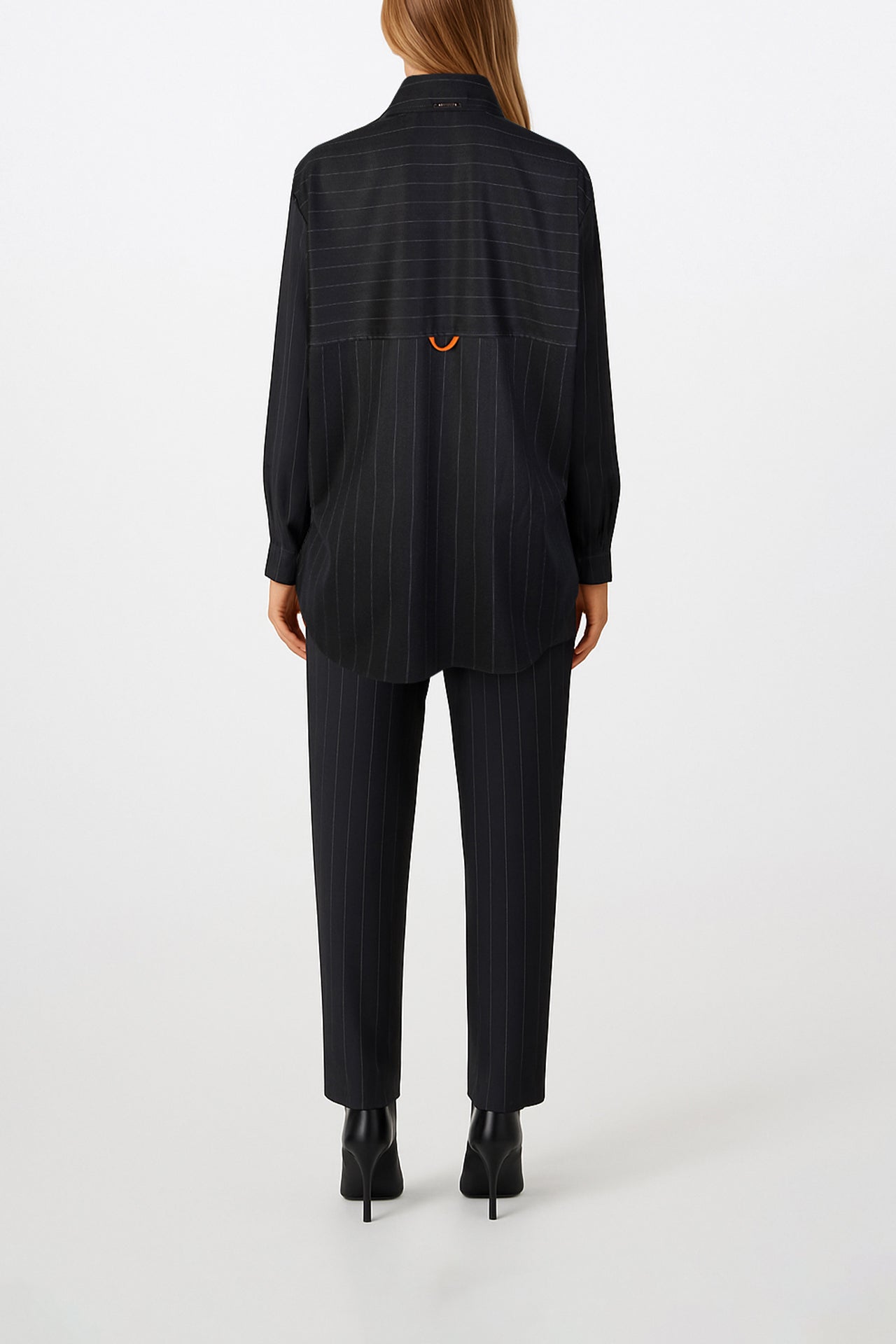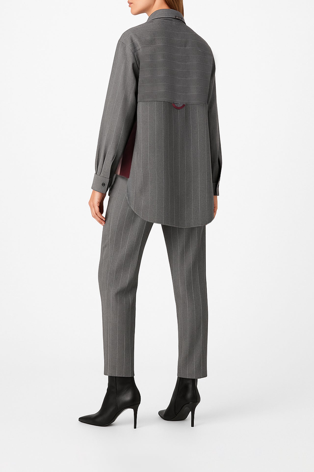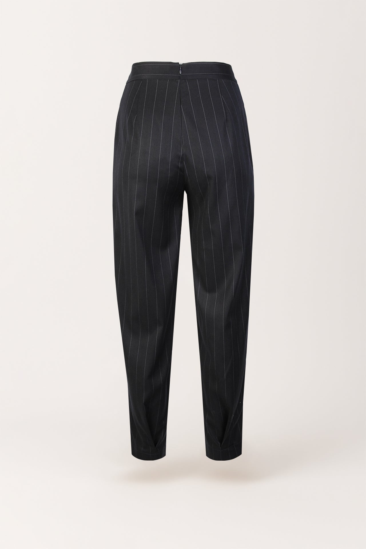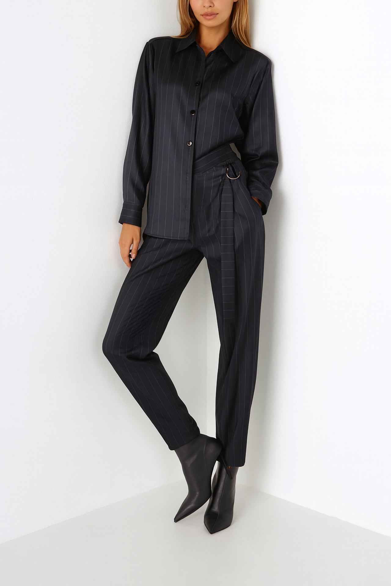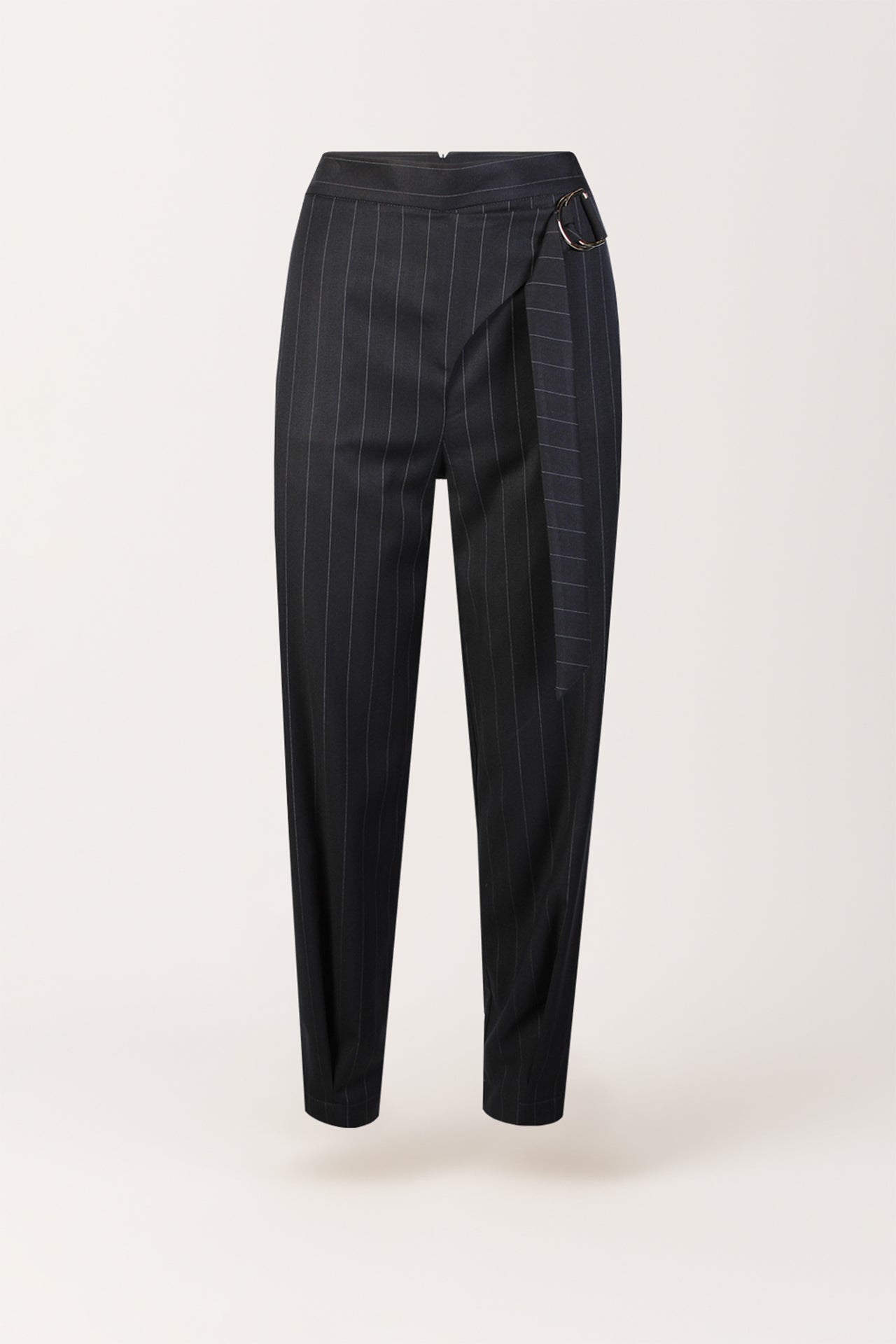 Calças em tecido de alfaiataria com padrão risca de giz. O modelo de cintura subida apresenta pala lateral com fivela metálica, que define e estrutura a silhueta. O corte afunilado confere um equilíbrio entre rigor e fluidez, alongando a perna com elegância natural. Um essencial contemporâneo que traduz o novo olhar sobre a alfaiataria feminina.
