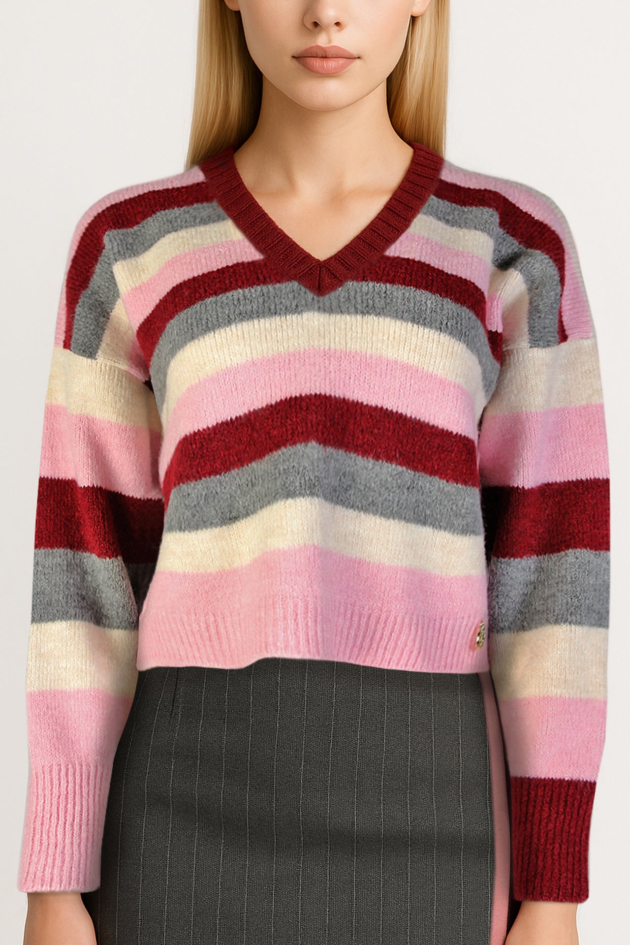 Camisola de malha leve com riscas largas em tons contrastantes. Decote em V, base e punhos em canalé. A estrutura curta e o ombro descaído trazem proporção e descontração medida.