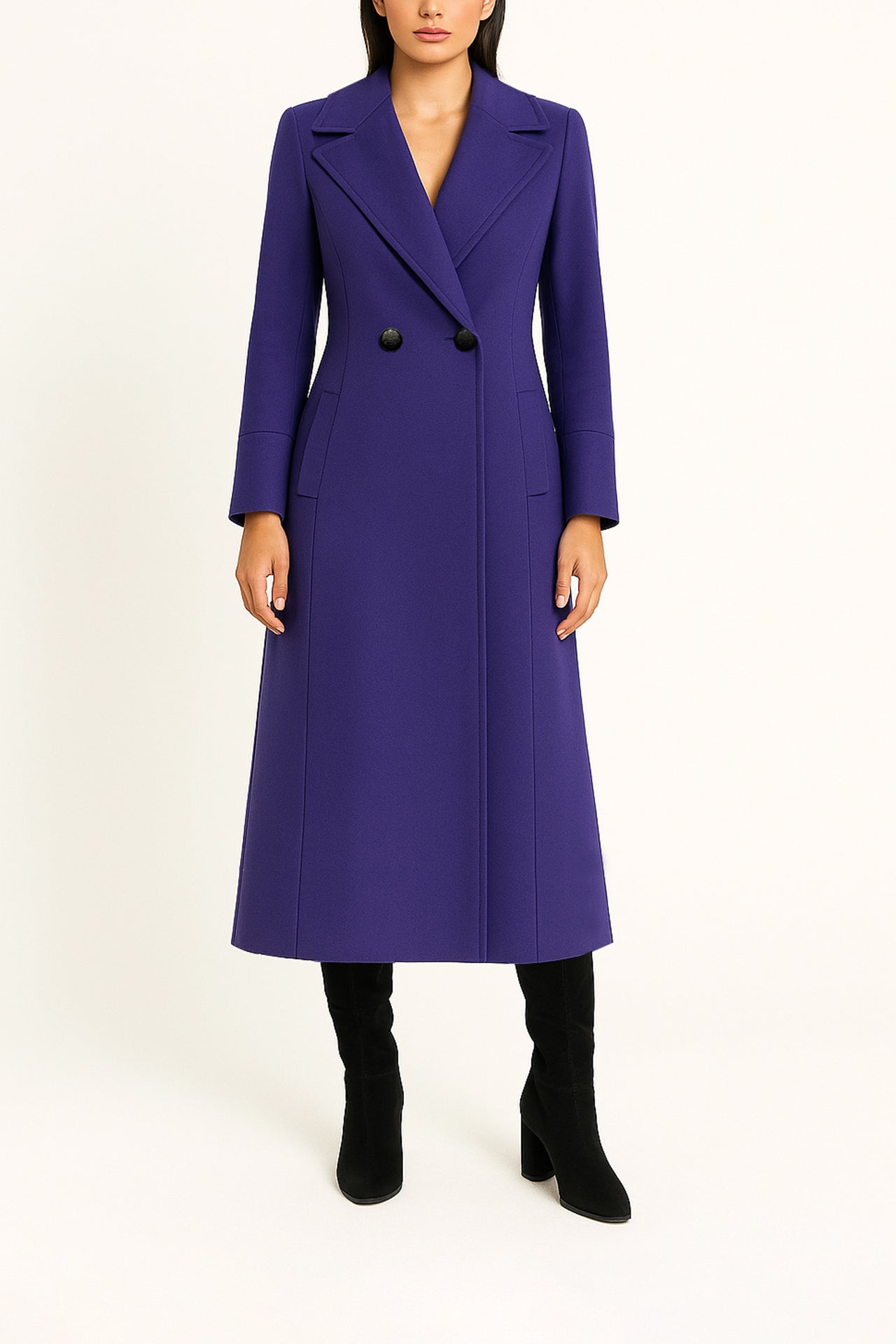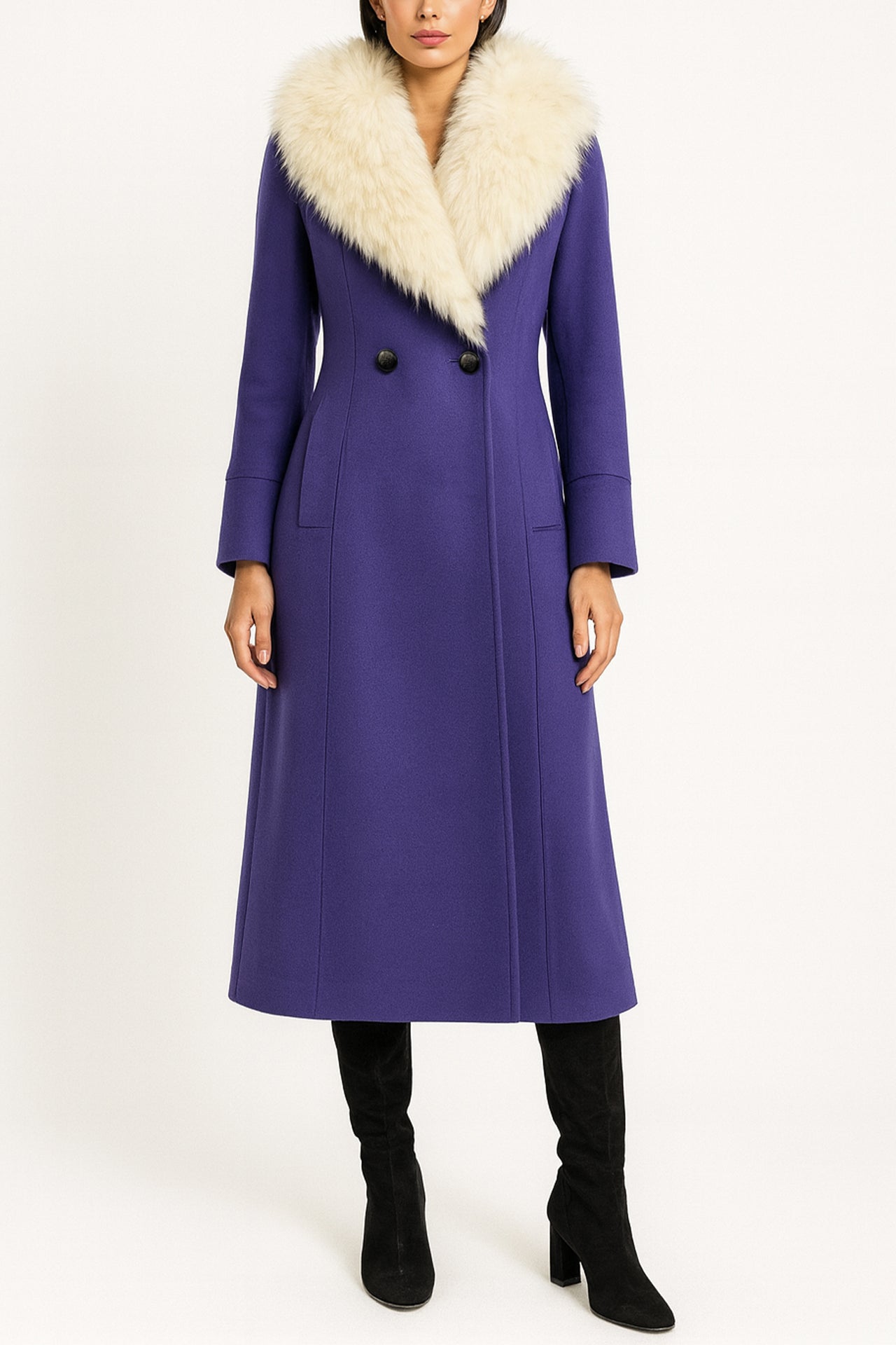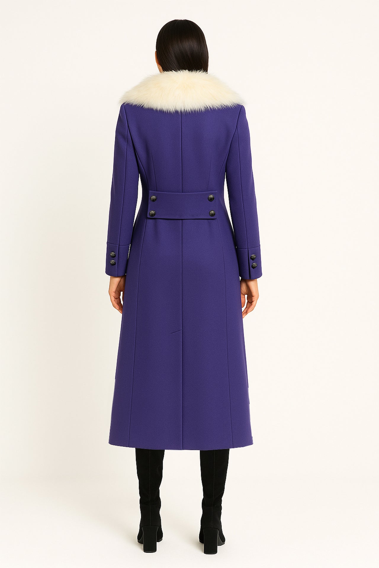 Casaco comprido com gola de lapela pormenor de aplique de pelo sintético removível. Manga comprida com botões no punho. Fecho à frente com botões em relevo. Bolsos laterais. Forro interior combinado no tom.
