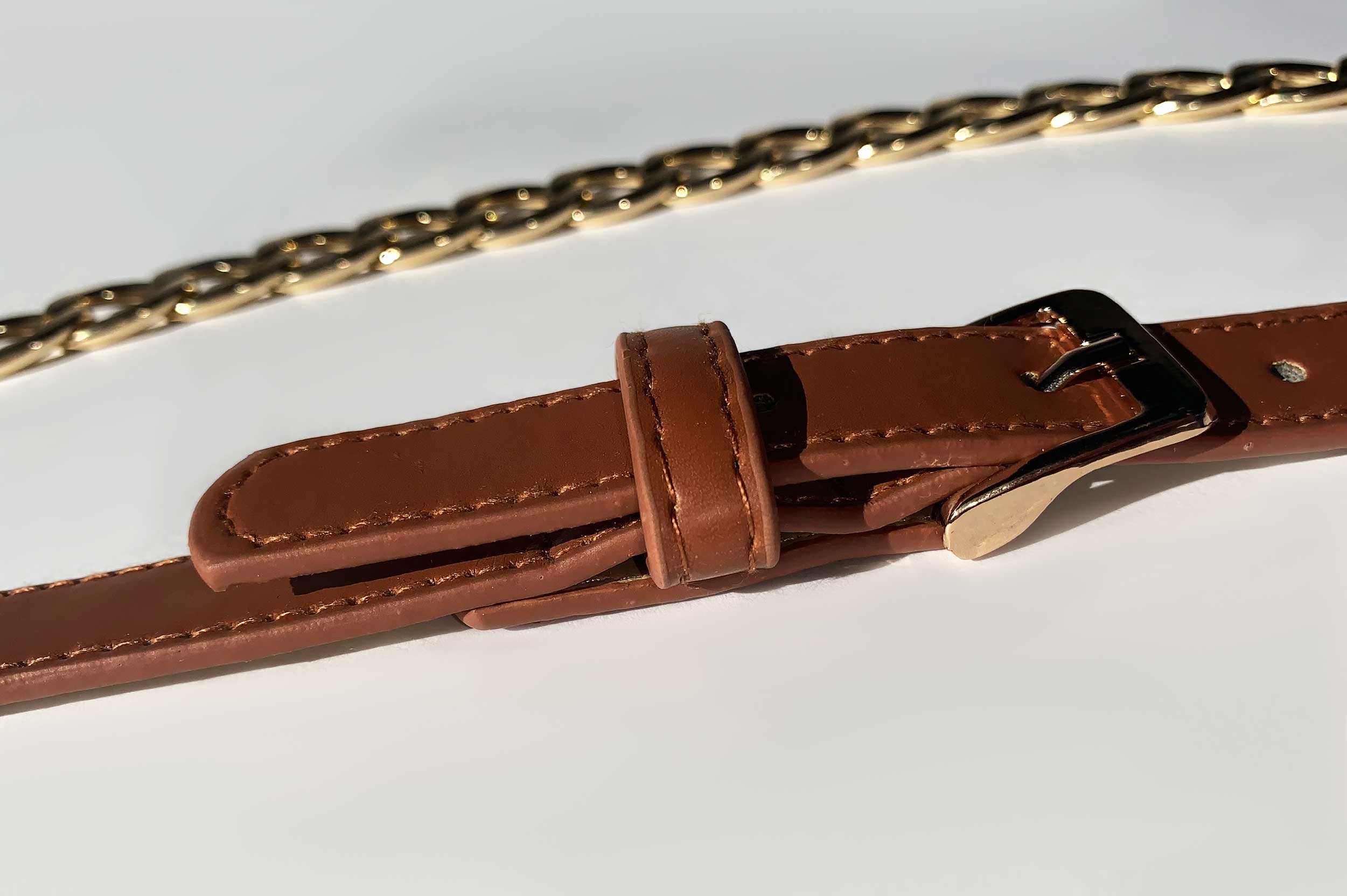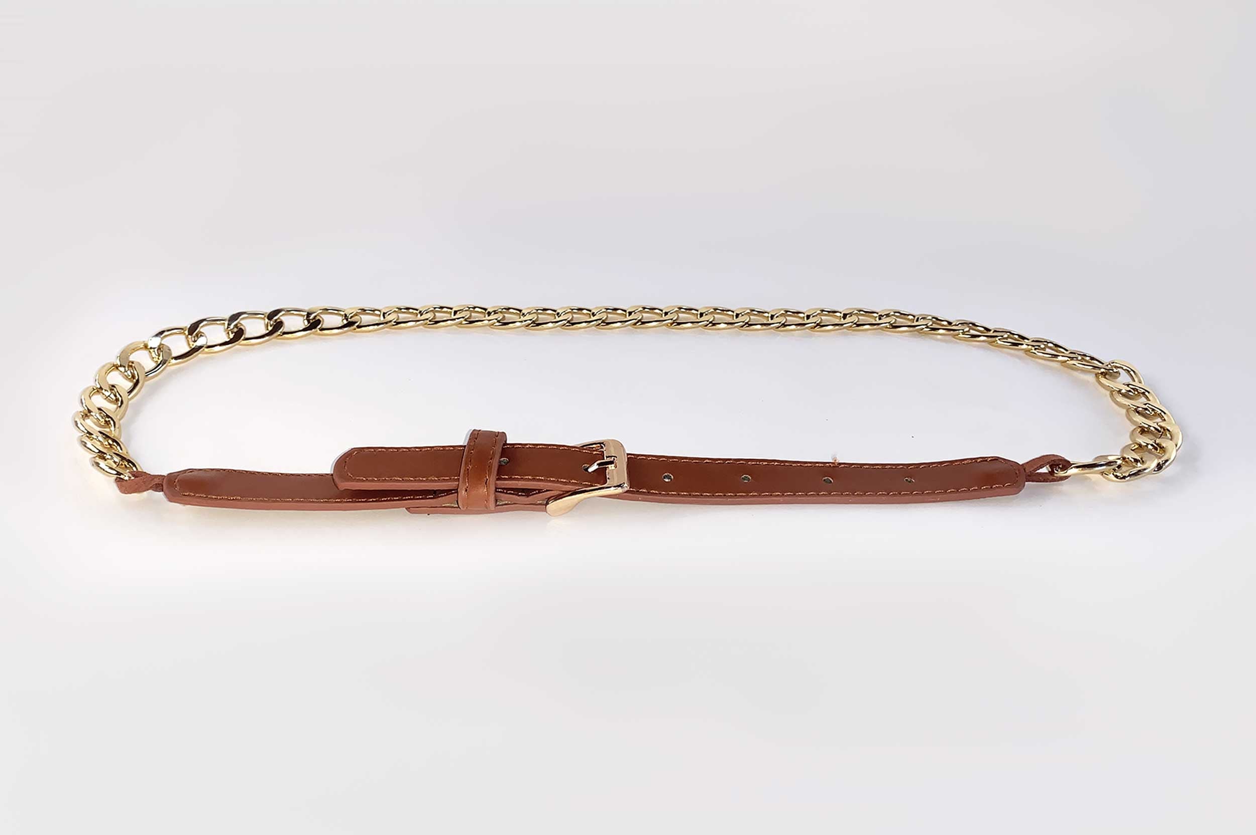 Cinto fino confeccionado em material sintético com corrente. Fecho mediante fivela metálica.