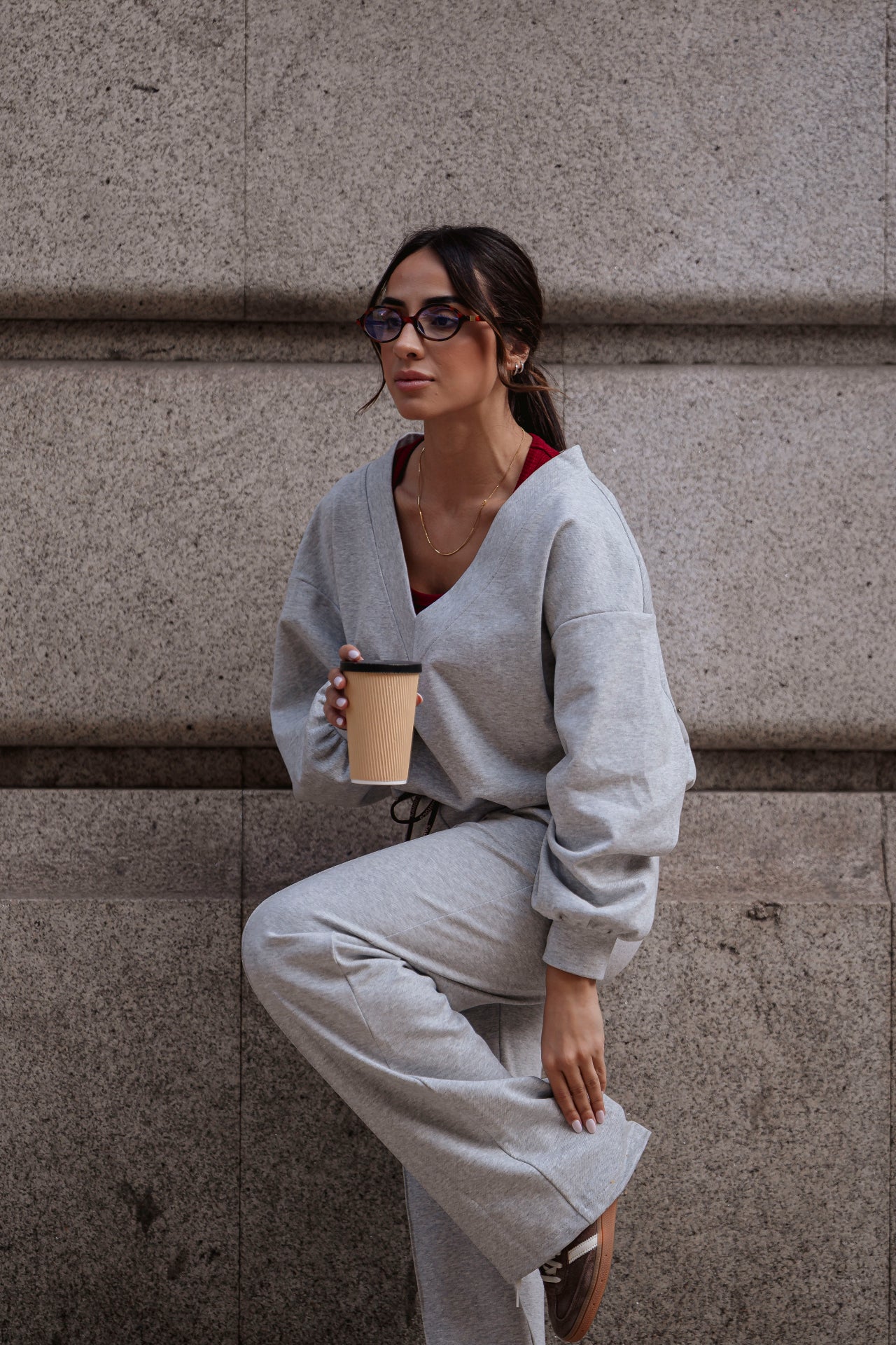 Sweatshirt cropped Sahoco em cinzento claro, com decote em V e detalhe elástico na bainha. O design moderno e descontraído torna-a perfeita para coordenados urbanos ou casuais. Combine com calças jogger ou skinny para um estilo sporty chic sofisticado.