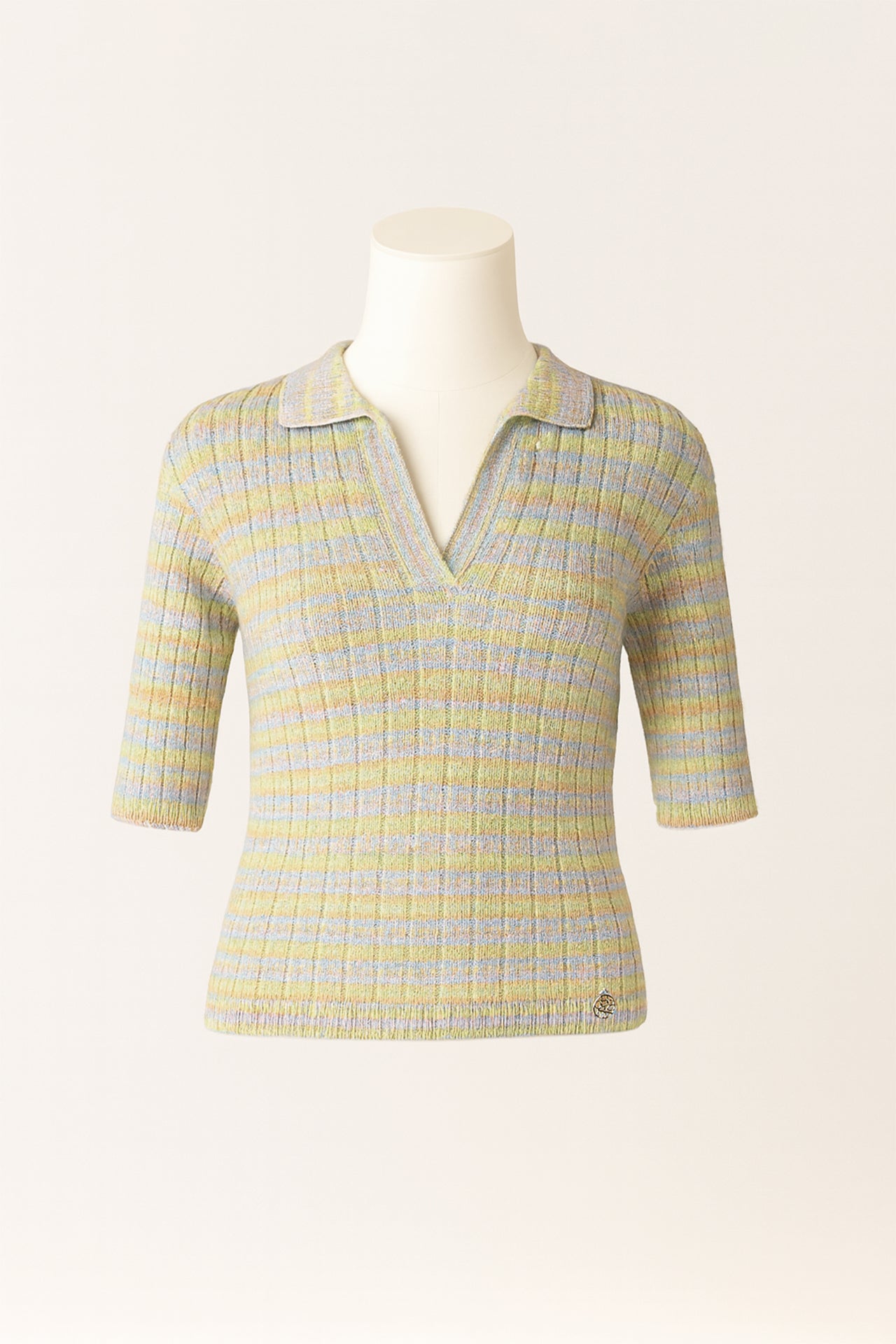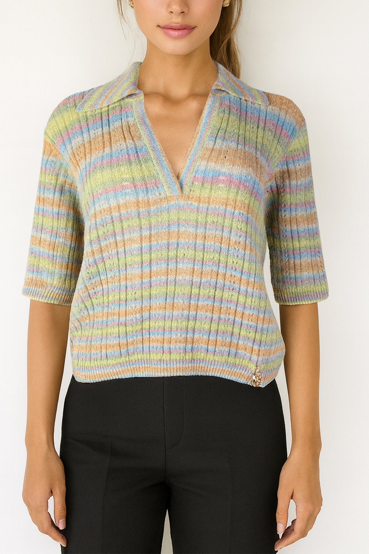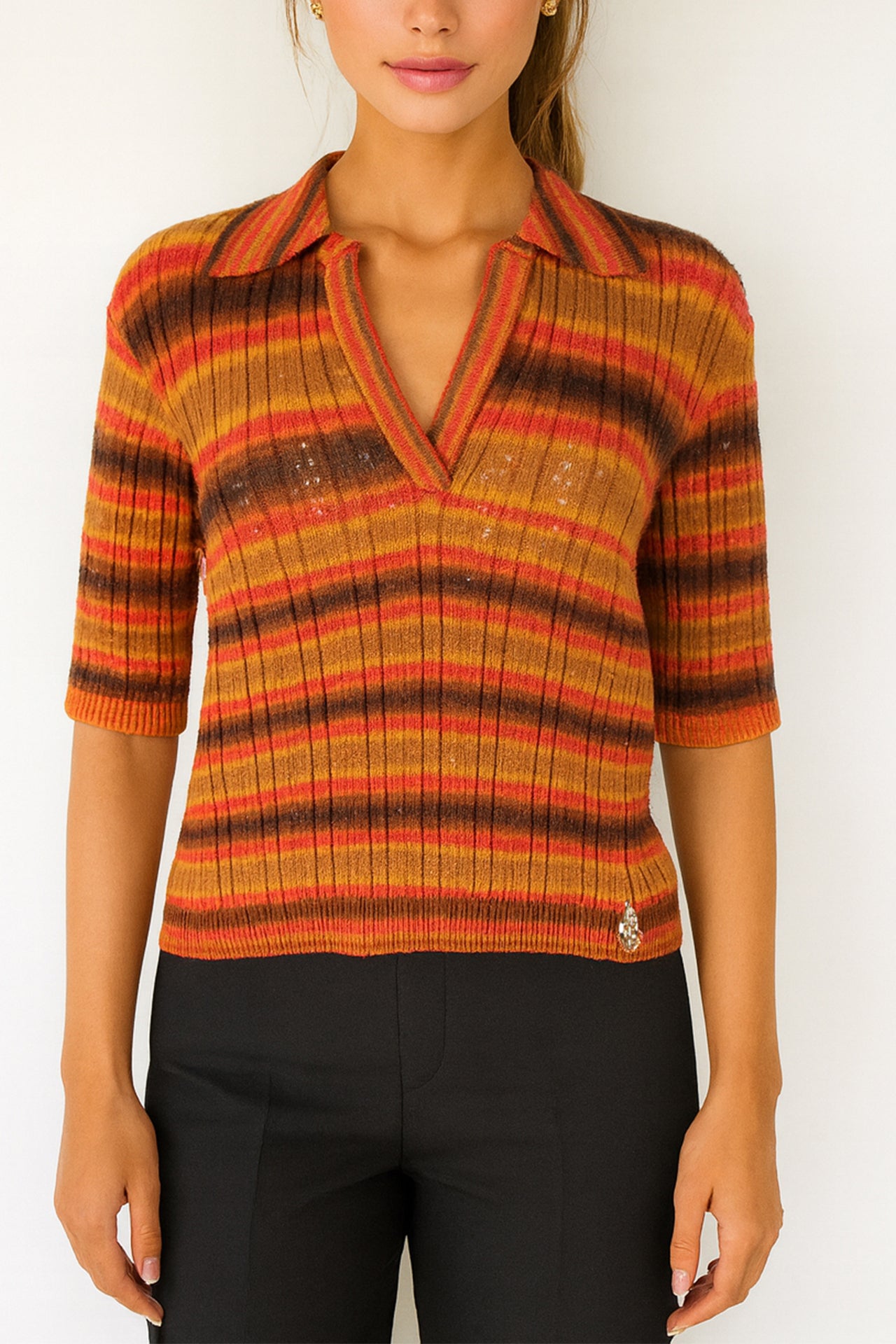 Top de malha canelada com meia manga e gola polo estruturada, apresentado num padrão de riscas com tonalidades ricas e profundas. O decote em V alonga o pescoço enquanto a textura canelada confere conforto e definição ao corpo.