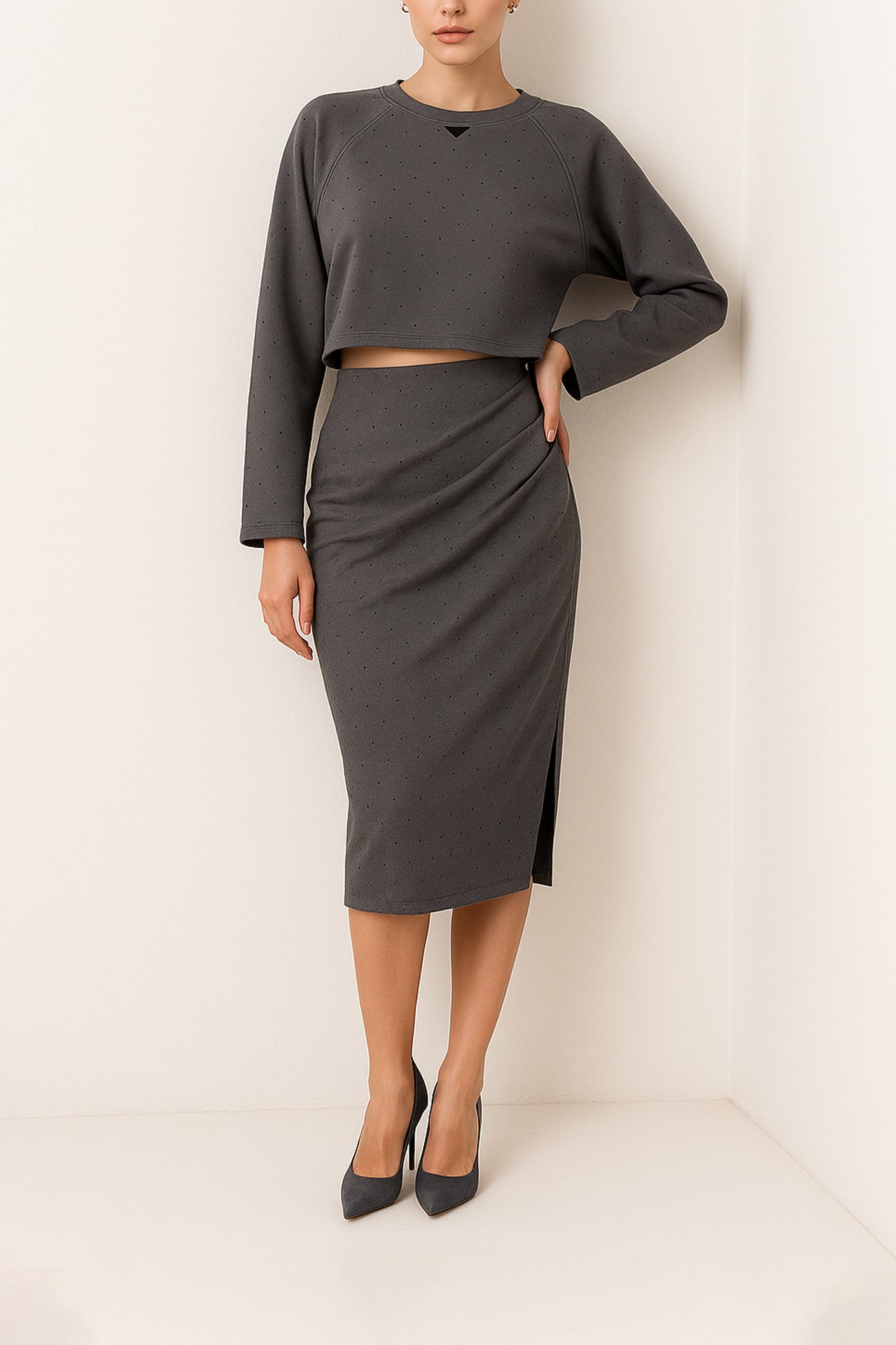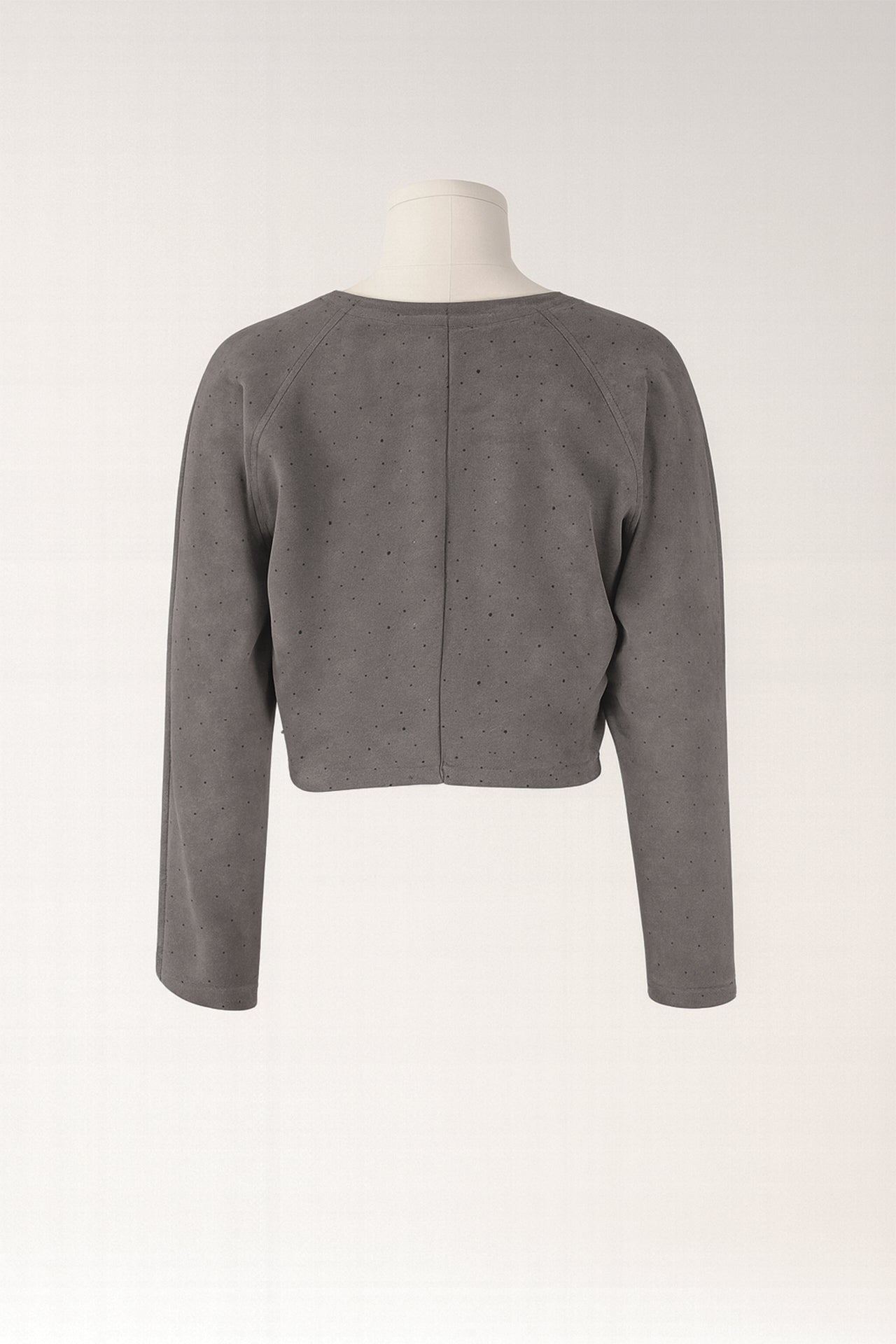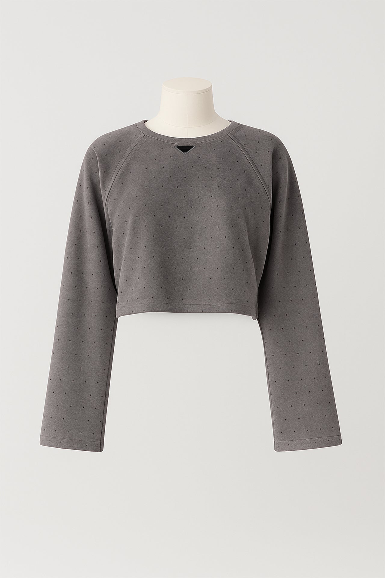 Top curto em tecido de acabamento pele de pêssego, caracterizado pelo toque aveludado e suave. As aplicações brilhantes criam um reflexo subtil e elegante sobre a superfície mate. Apresenta corte reto, mangas compridas e decote redondo.