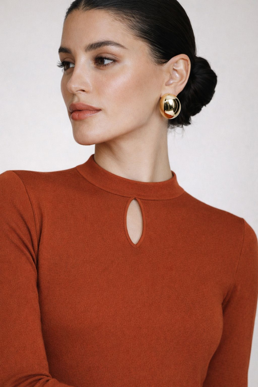 Sweater em malha lisa com gola redonda e recorte em gota na frente. As mangas longas ligeiramente abertas equilibram estrutura e conforto. Um básico de precisão.