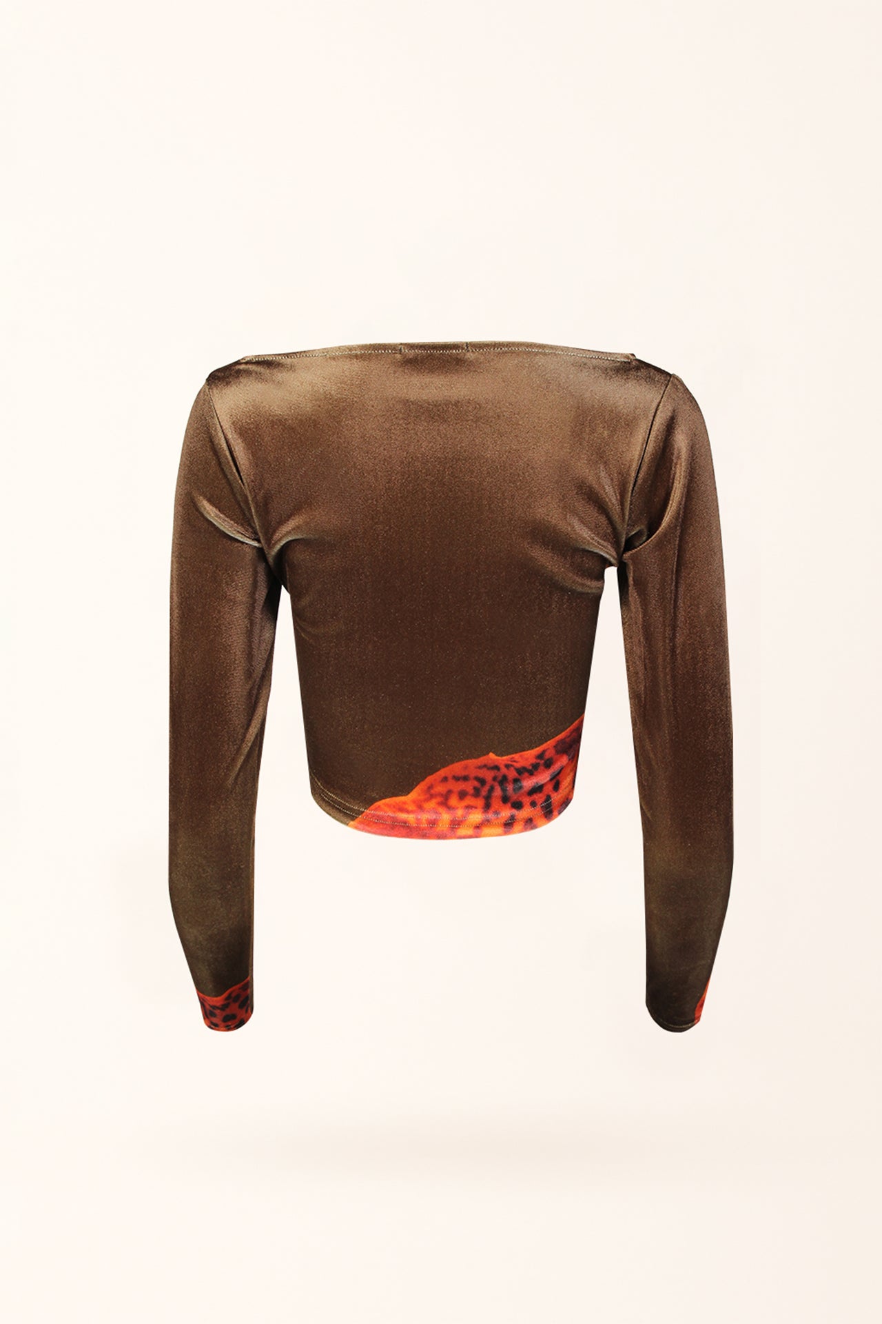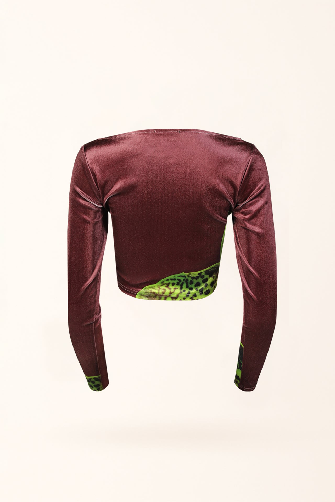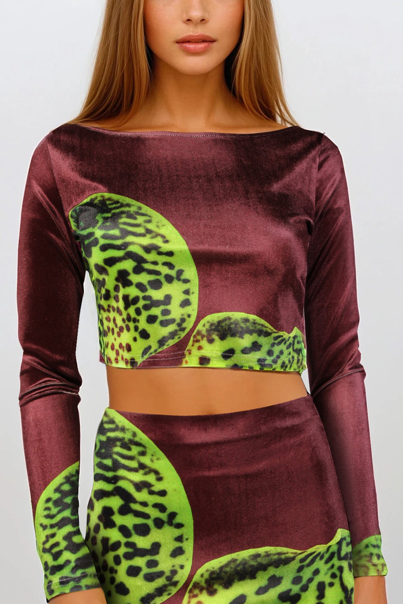 Top em veludo de textura suave, com estampa de orquídea em contraste intenso. O design justo e de linhas puras equilibra sensualidade e modernidade, criando uma peça de impacto visual e refinamento subtil.