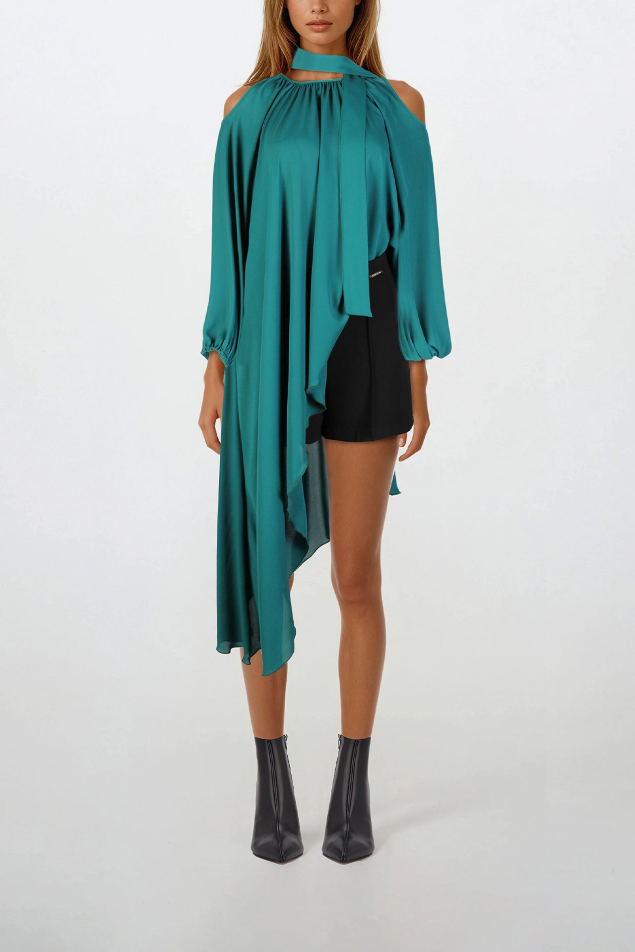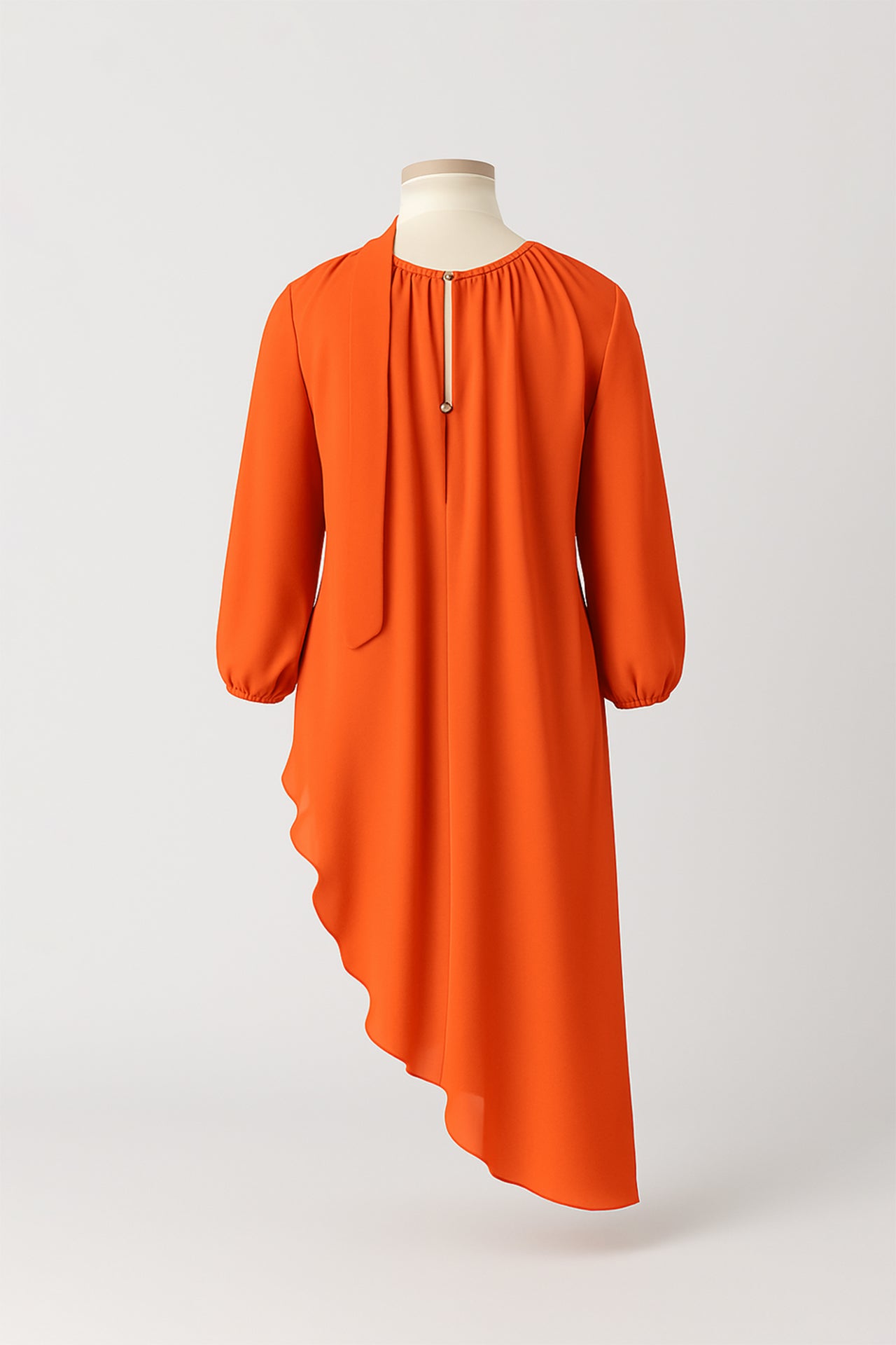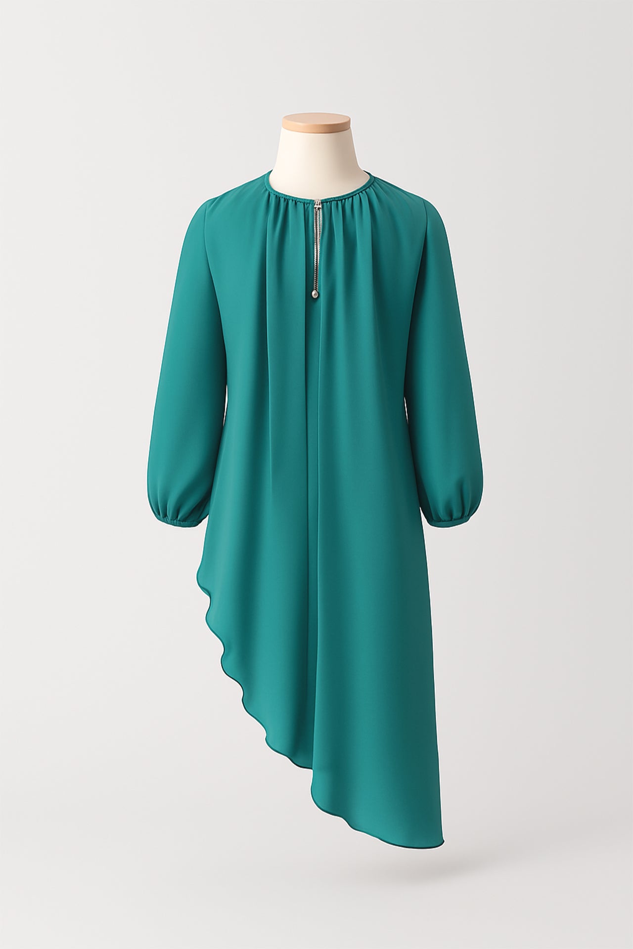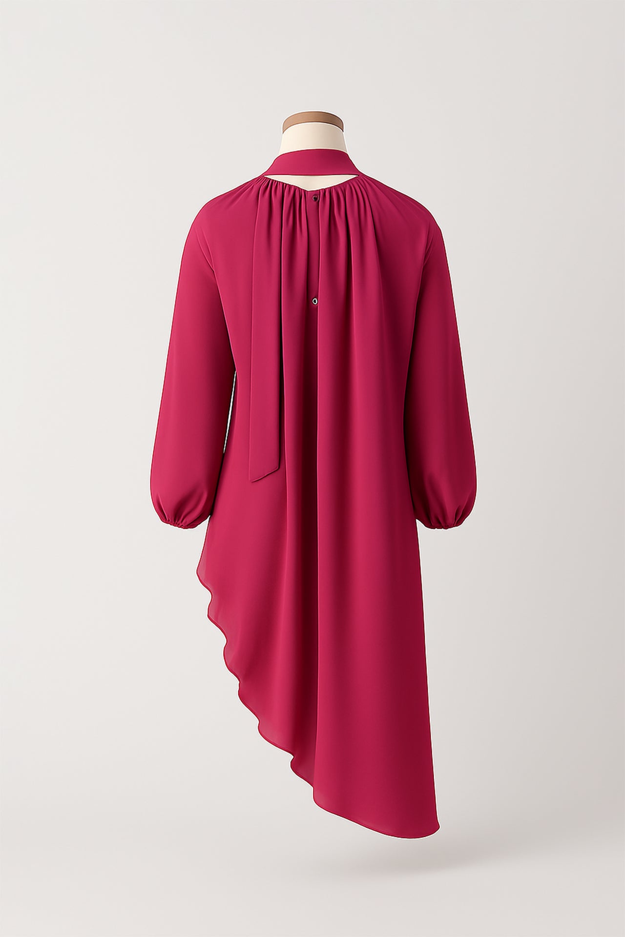 Túnica de corte assimétrico, confecionada em tecido acetinado de toque suave e brilho discreto. Com mangas compridas e decote redondo, esta peça destaca-se pelo detalhe do laço, que acrescenta um toque feminino e sofisticado.