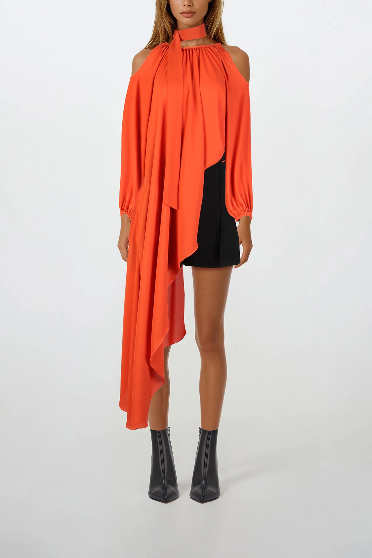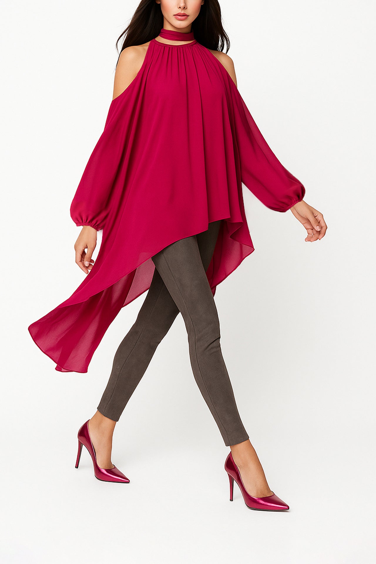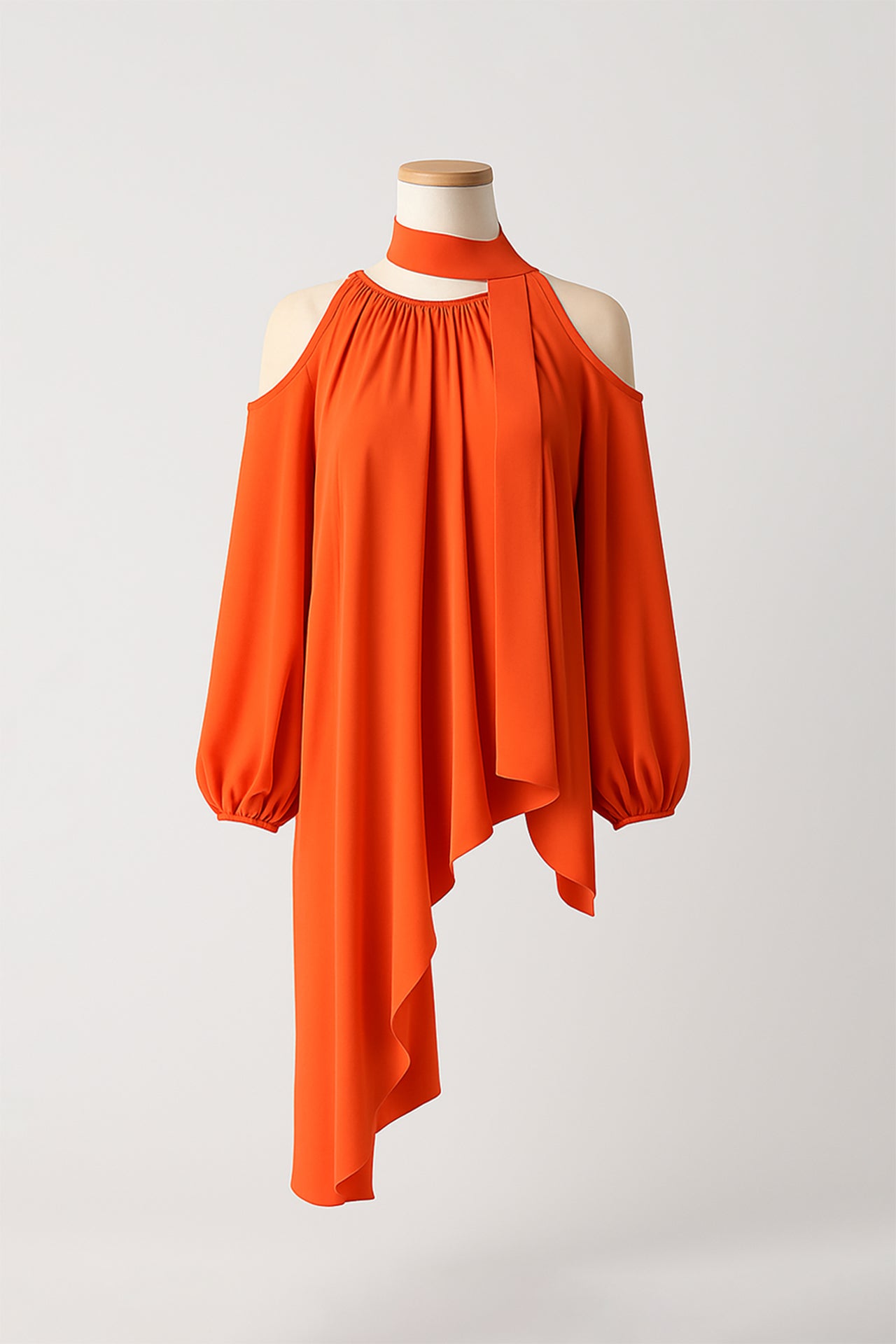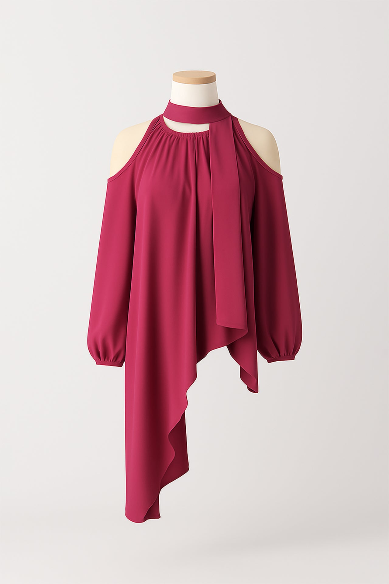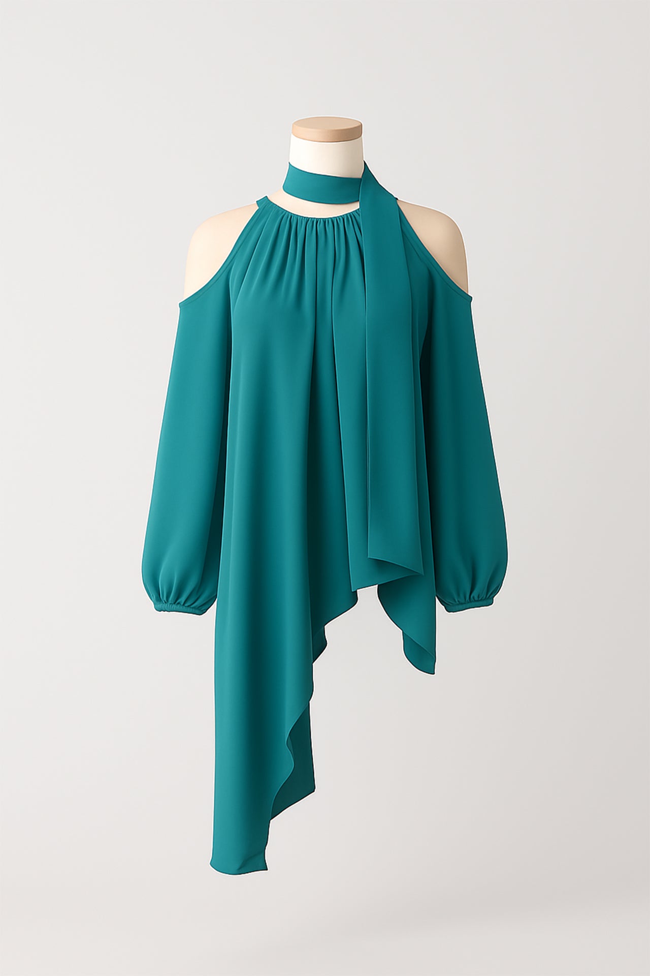 Túnica de corte assimétrico, confecionada em tecido acetinado de toque suave e brilho discreto. Com mangas compridas e decote redondo, esta peça destaca-se pelo detalhe do laço, que acrescenta um toque feminino e sofisticado.