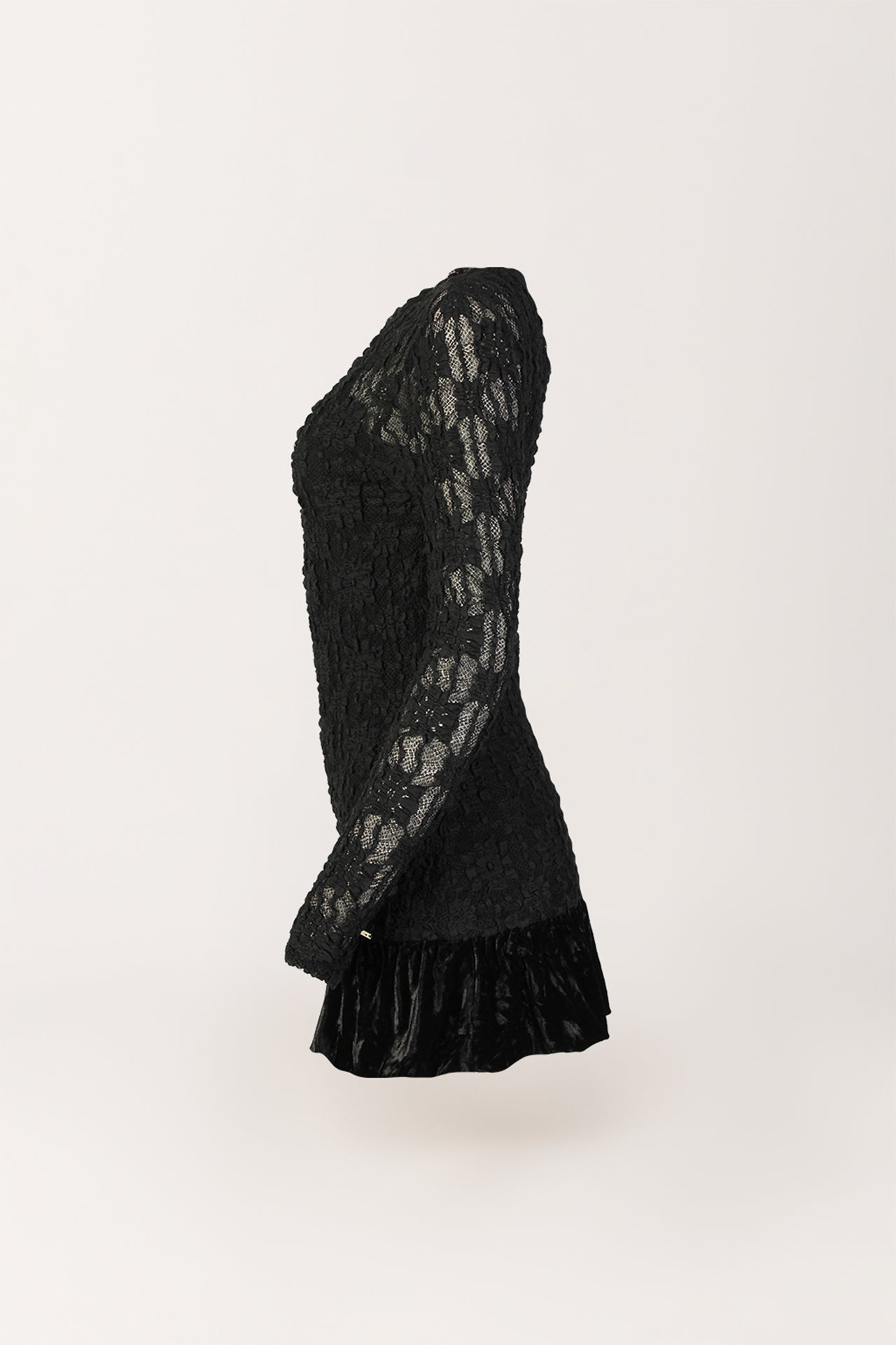 Vestido Curto em Renda com Saia de Veludo Plissado
