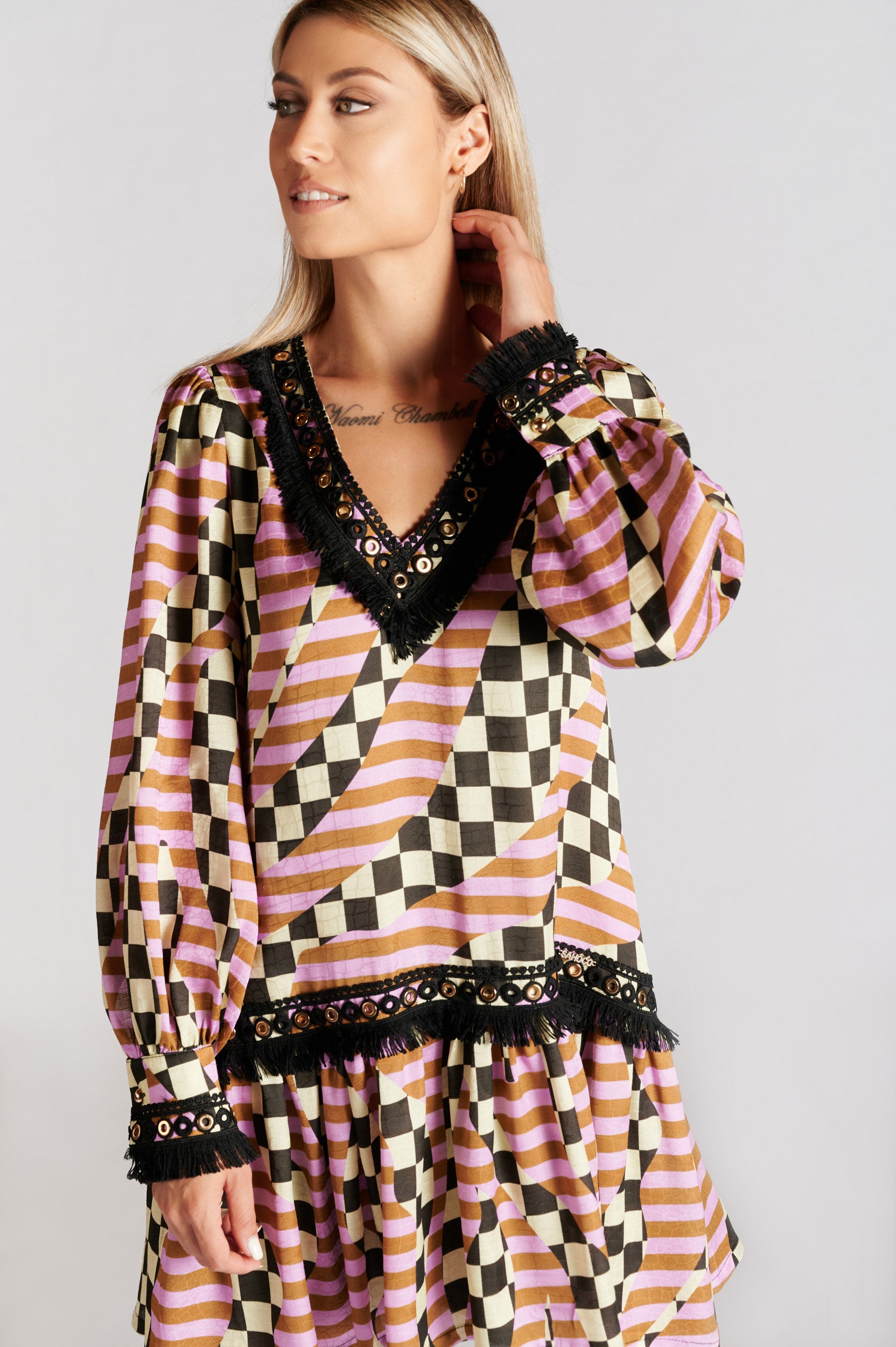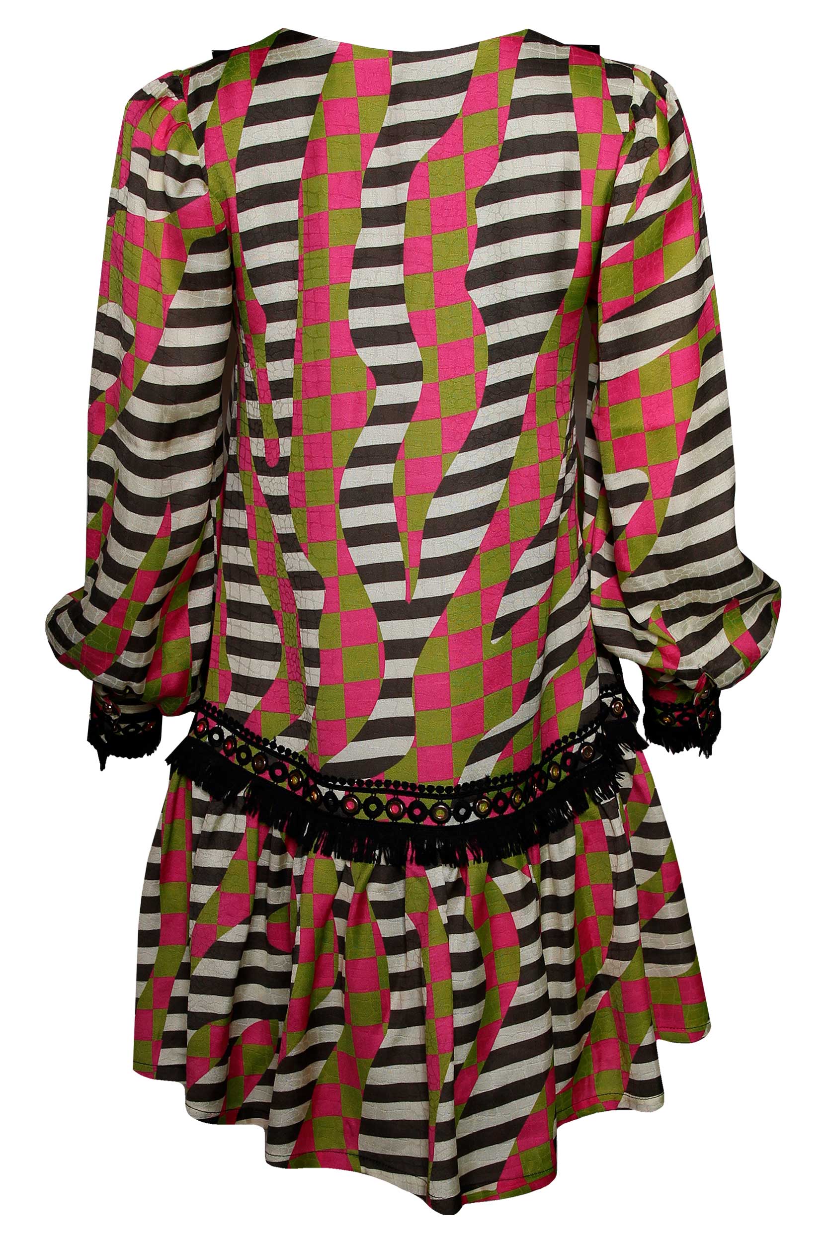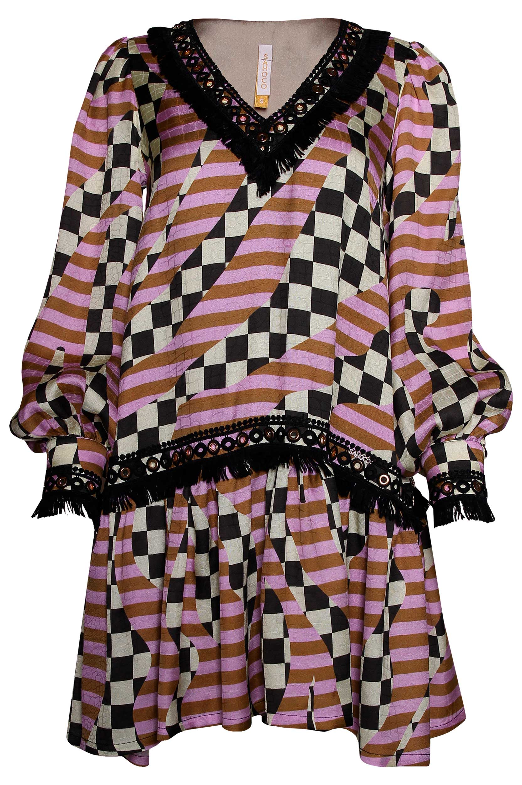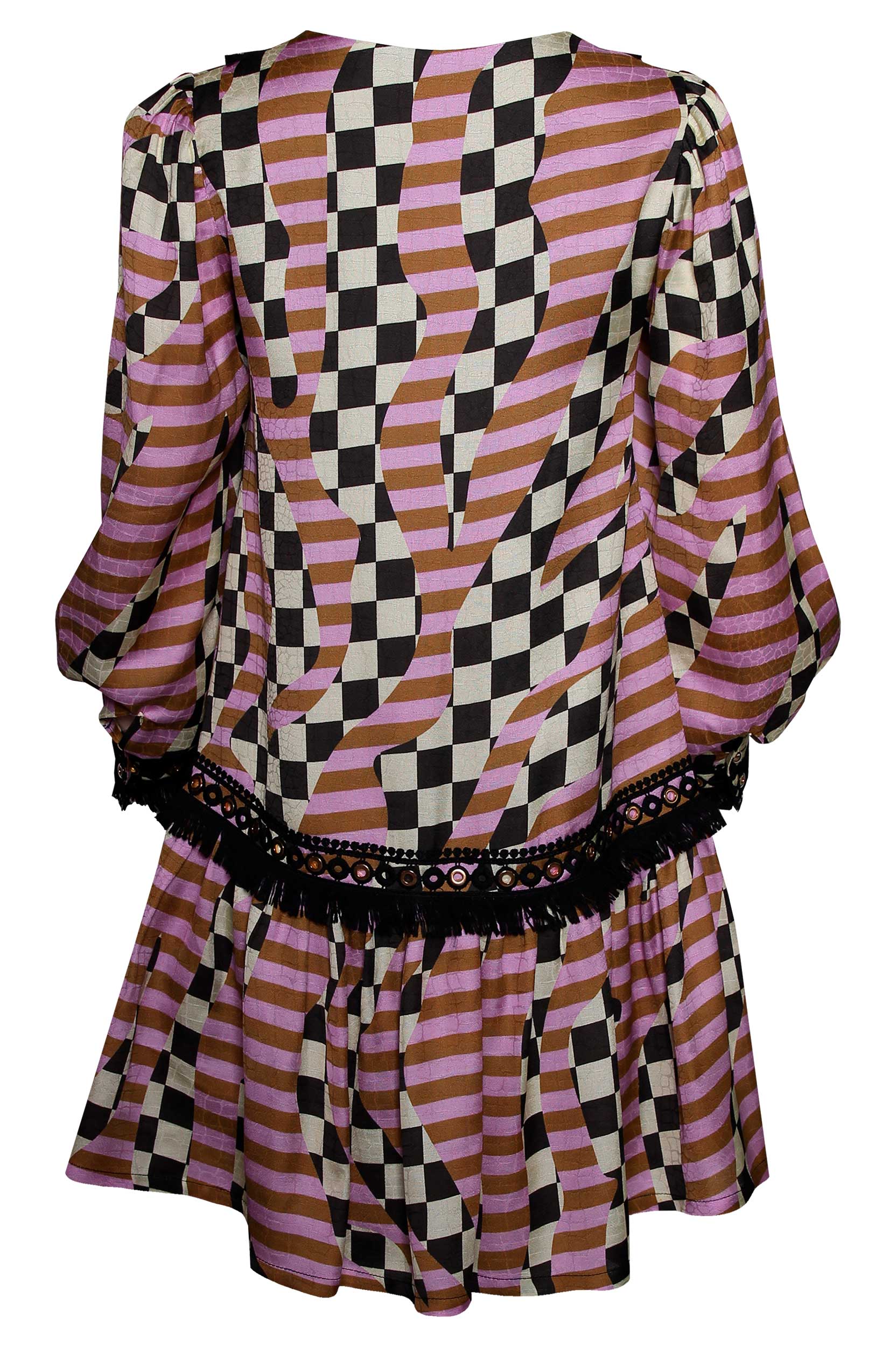 Vestido de decote em bico com manga comprida acabada em punho. Manga abalonada e tecido de faixa com franjas em contraste. Parte inferior acabada em folho.