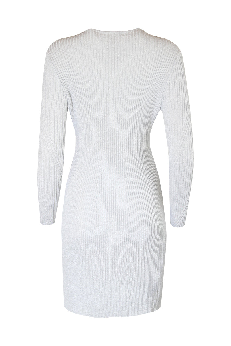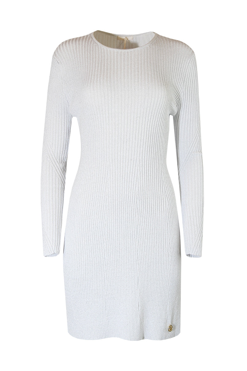 Vestido mini de malha canelada brilhante, com manga comprida e decote redondo. O efeito evasé adiciona leveza e movimento à peça, tornando-a ideal para um visual moderno e cheio de charme.