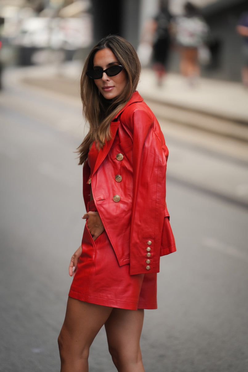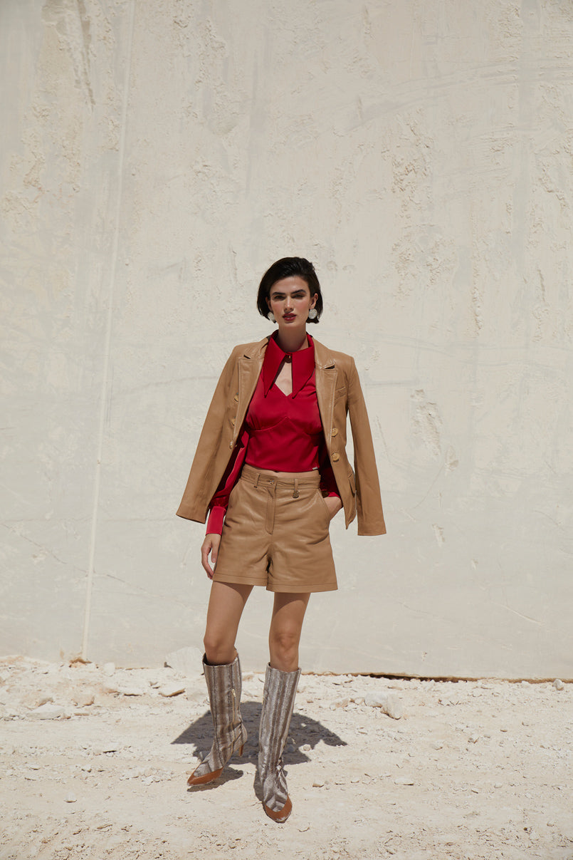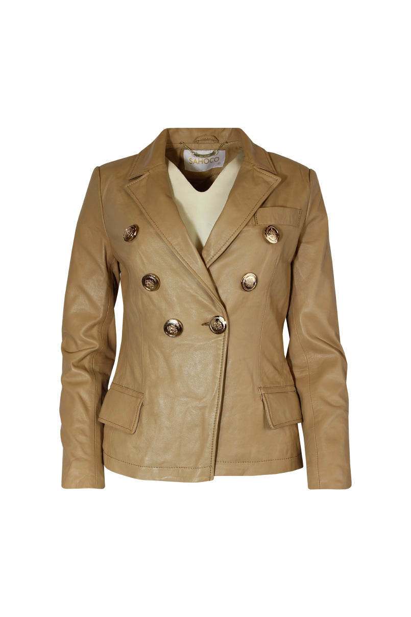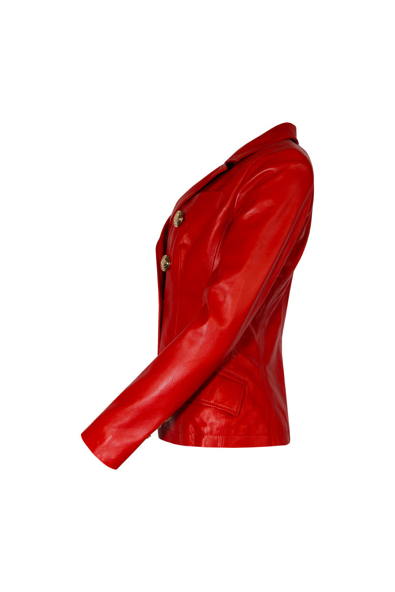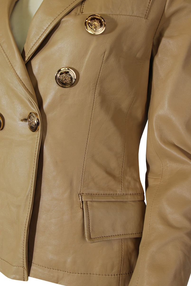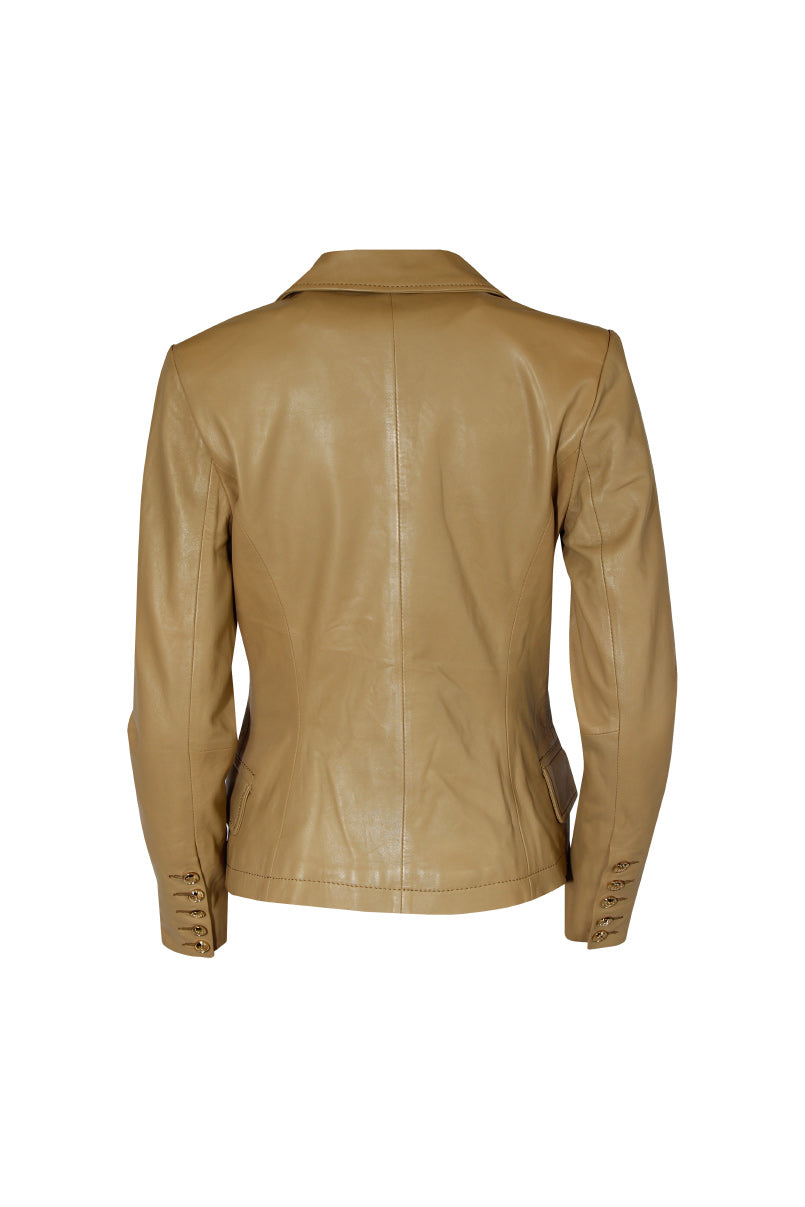 Blazer confeccionado em pele. Gola de abas e manga comprida com ombreiras.