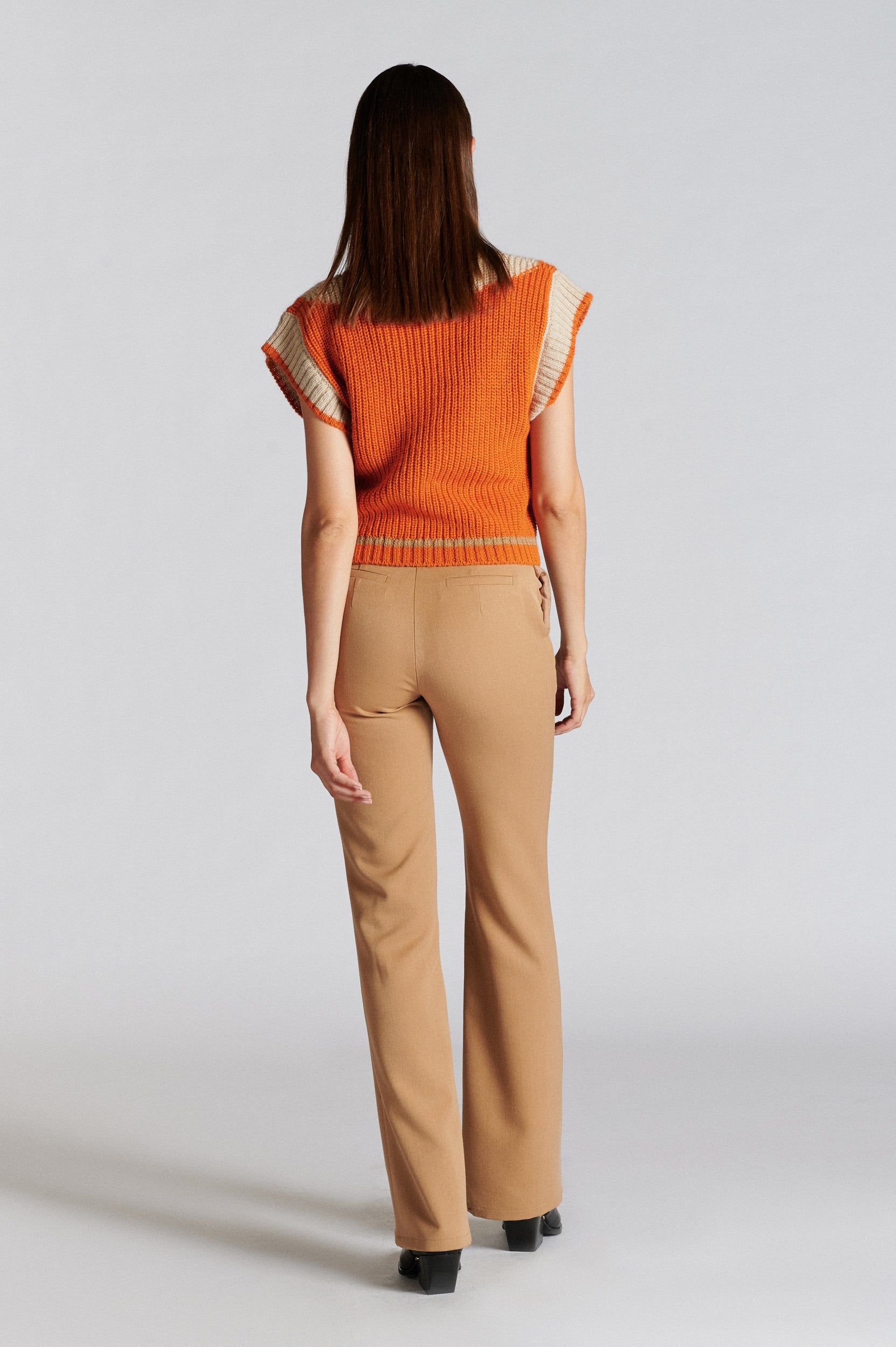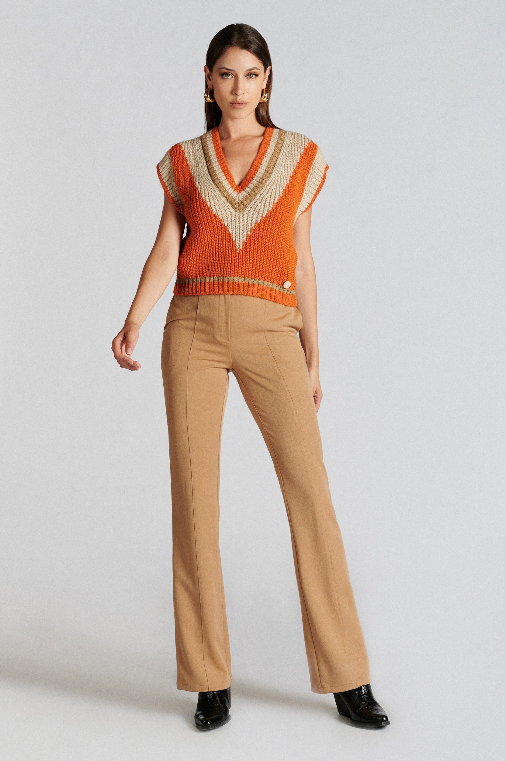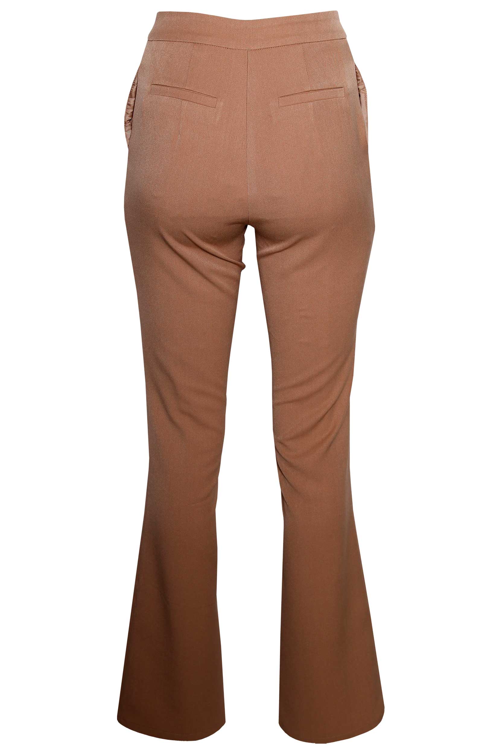 Calças de cintura subida corte flare de fitting justo. Bolsos laterais e bolsos de faca de 1 vivo atrás. Fecho à frente com fecho de correr à frente.
