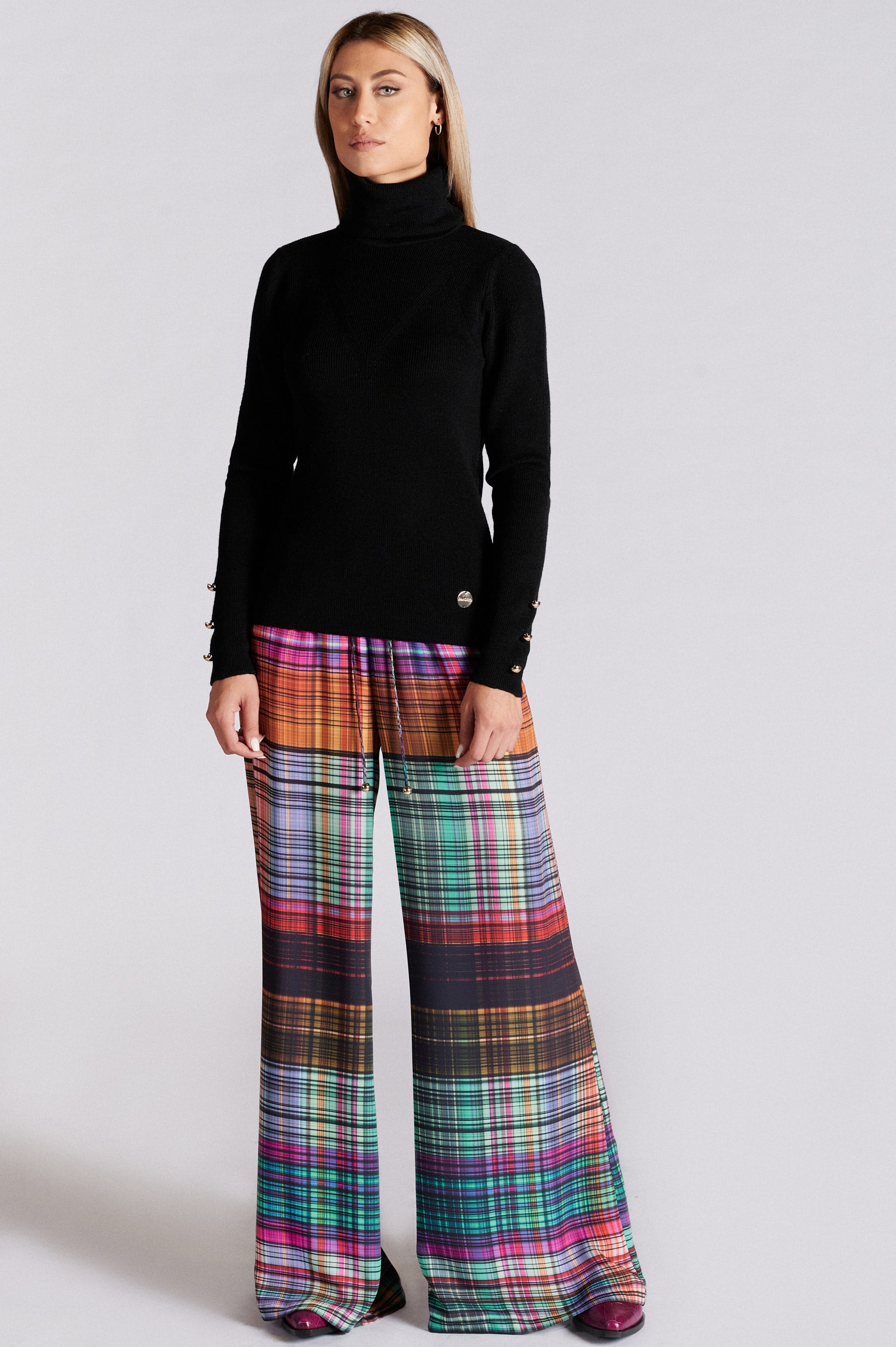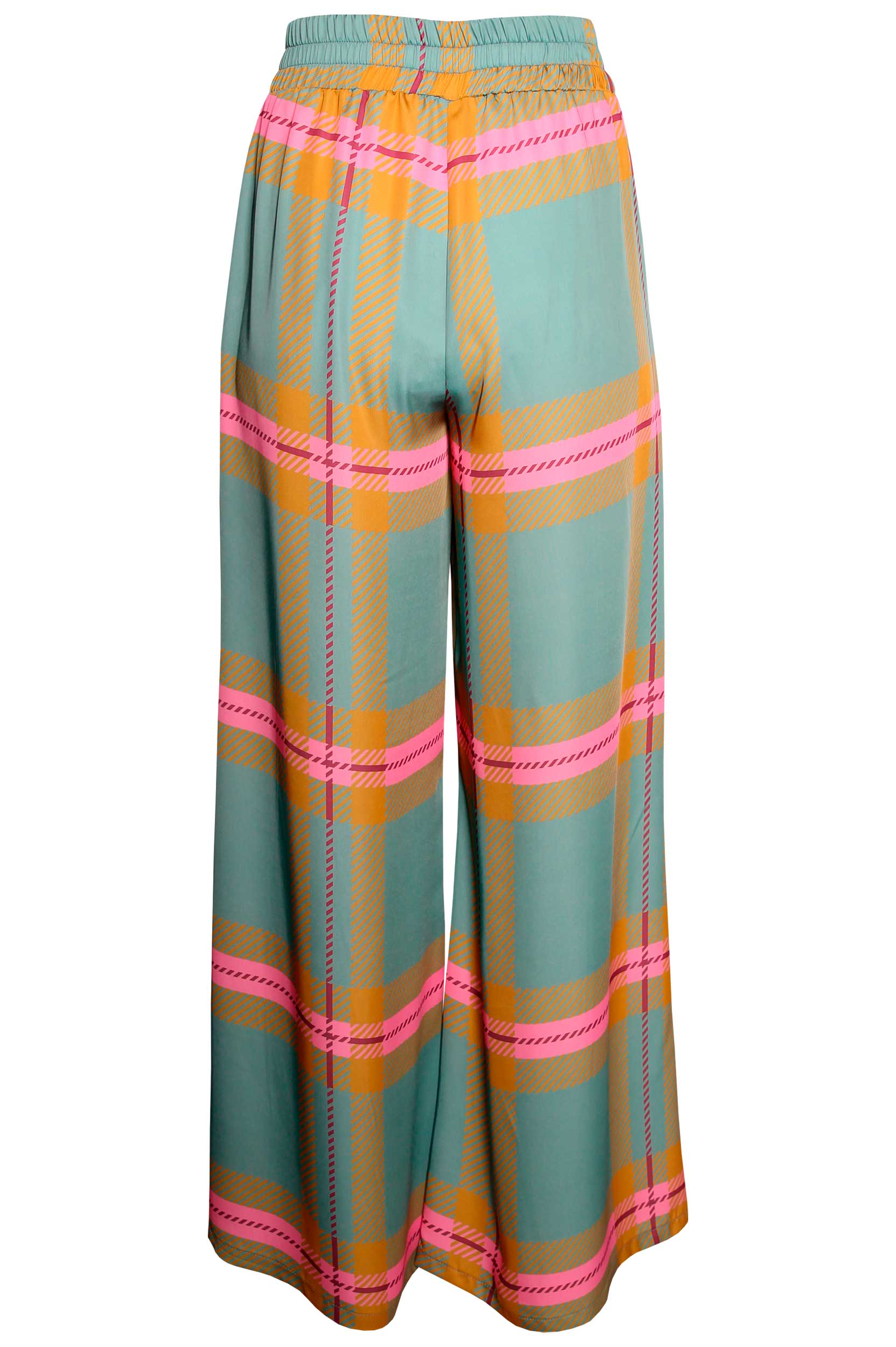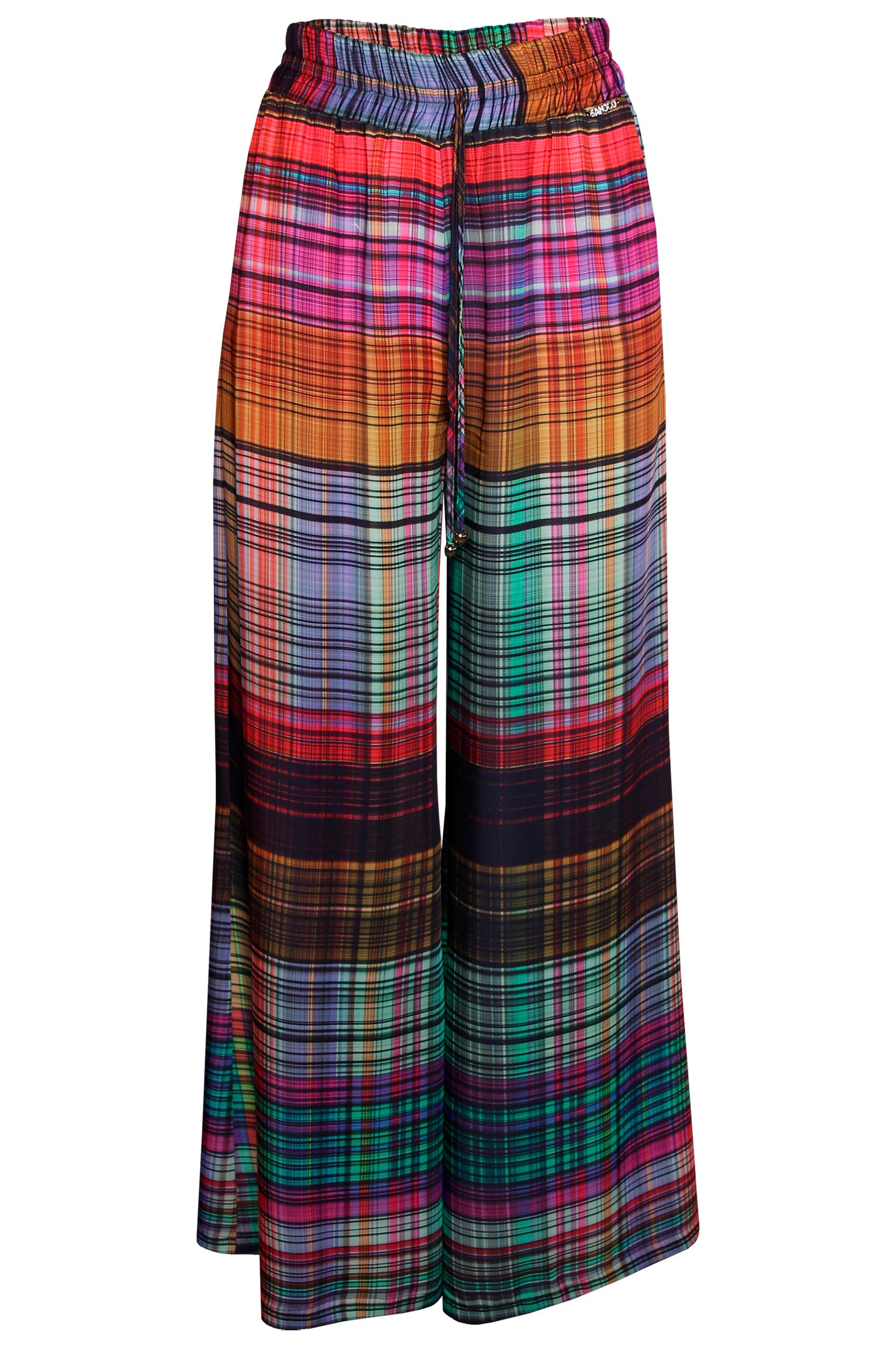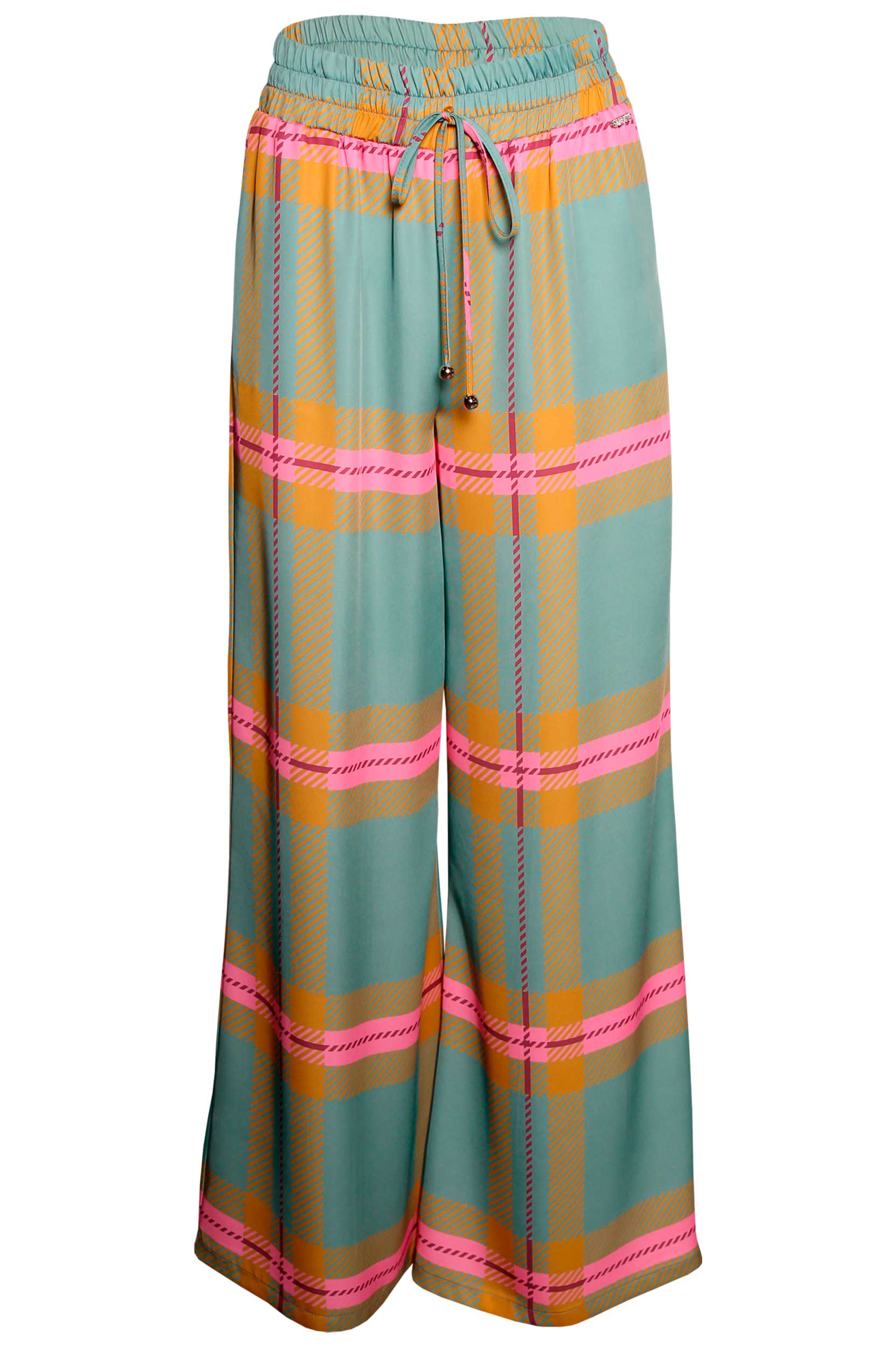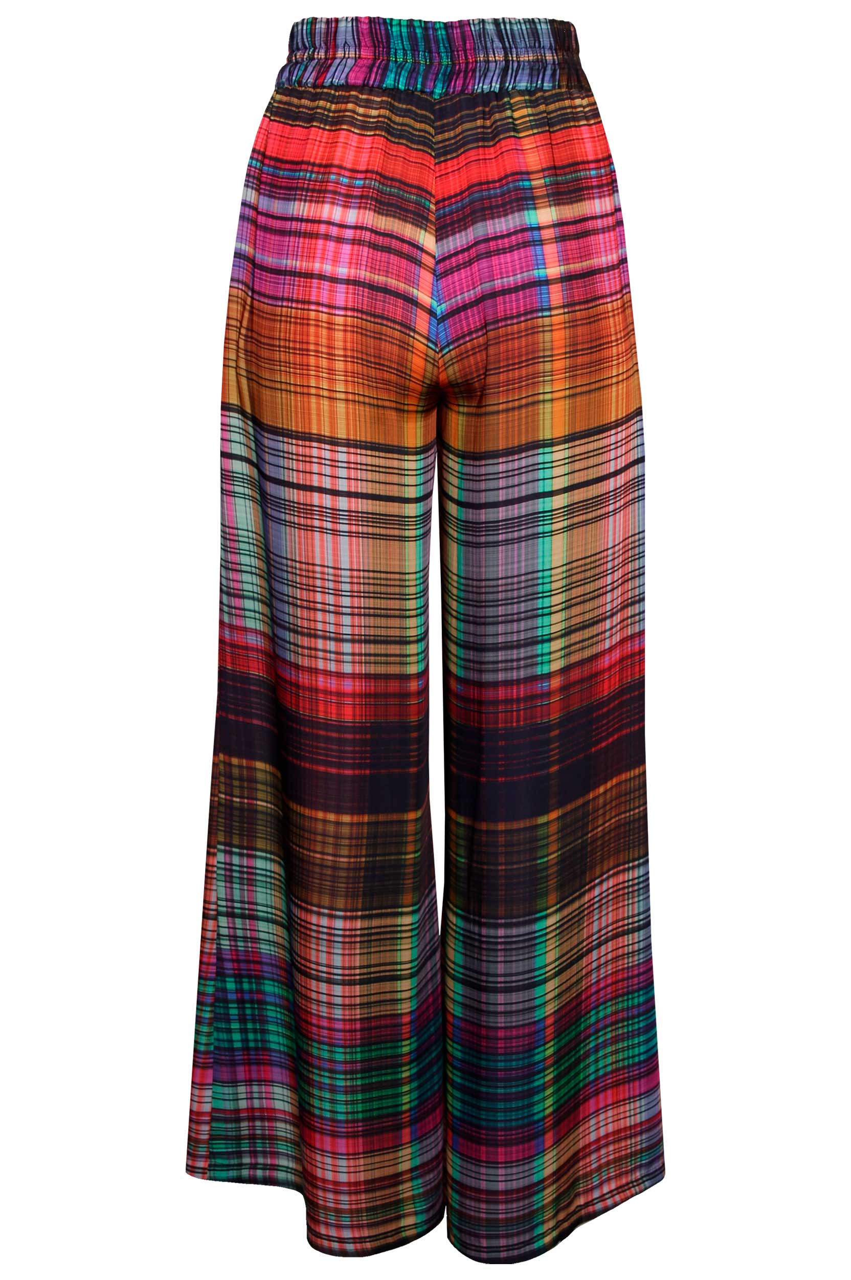 Calças fluídas de cintura subida elástica. Detalhe de estampado exclusivo e cordão no mesmo tecido.