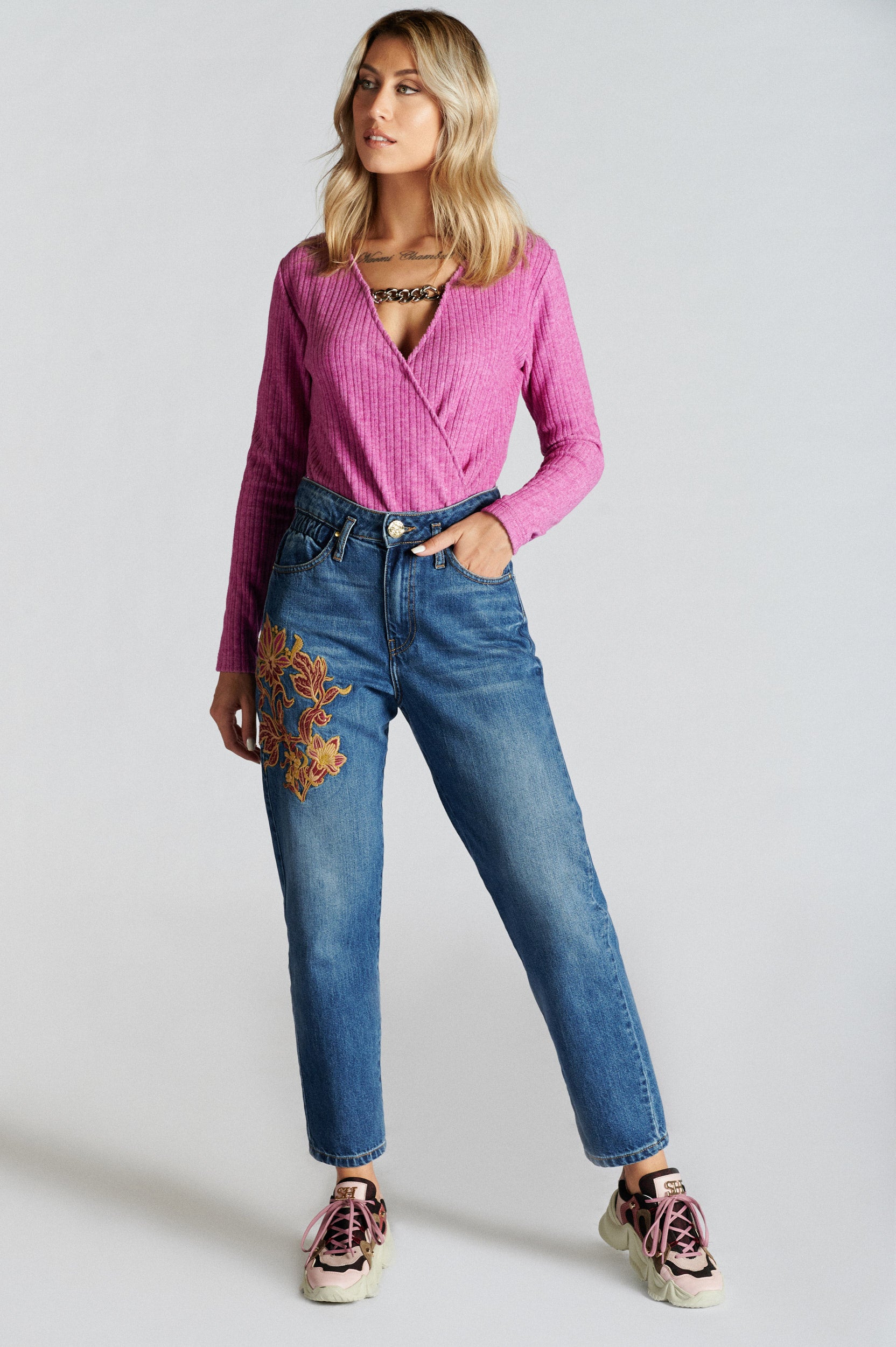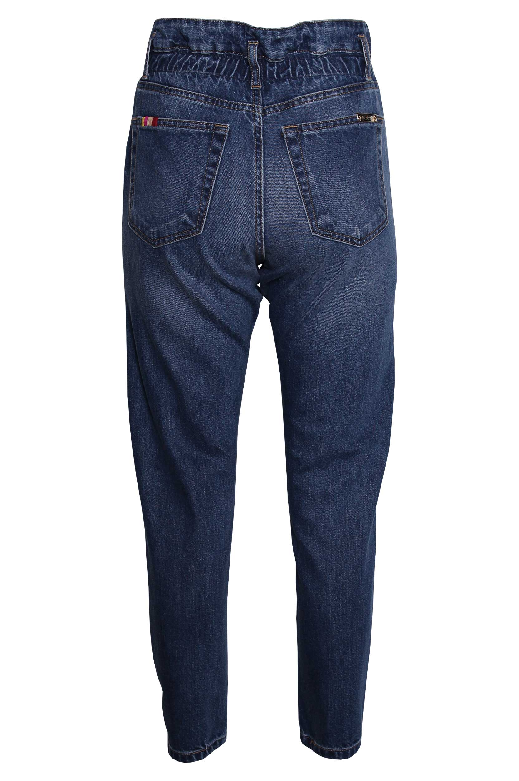 Calças de ganga cintura subida, com bolsos laterais e atrás e, cintura elástica. Detalhe bordado na perna direita e no bolso atrás. Fecho mediante fecho de correr e botão.