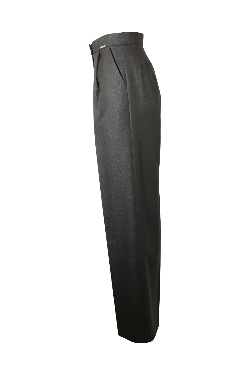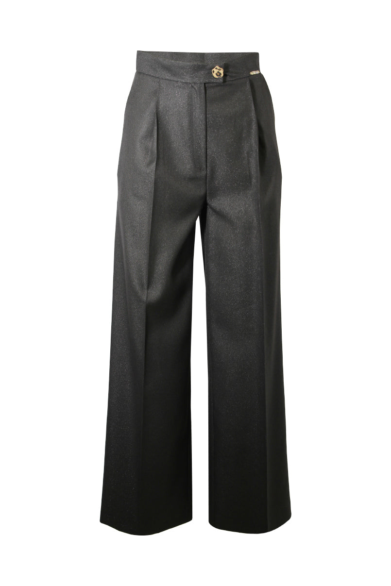 Calças de corte reto com cintura média e presilhas na cintura. Bolsos laterais e debruados atrás. Pormenor de pregas à frente. Fecho frontal com fecho de correr e presilha com botão.