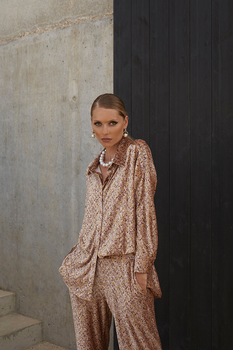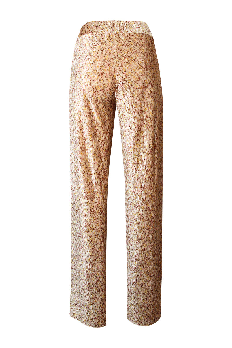 Calças de cintura subida e cós elástico. Pormenor combinado de tecidos aveludado no mesmo tom. Perna ampla. Bolsos laterais. Total Look.