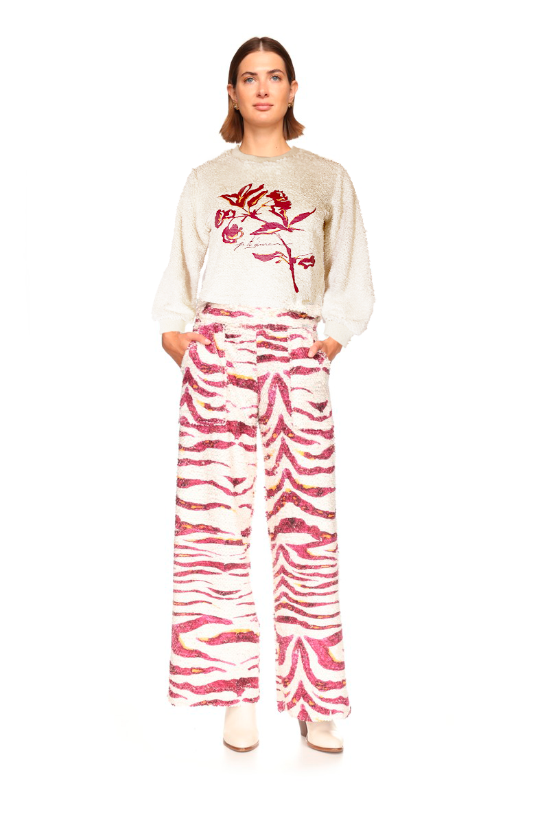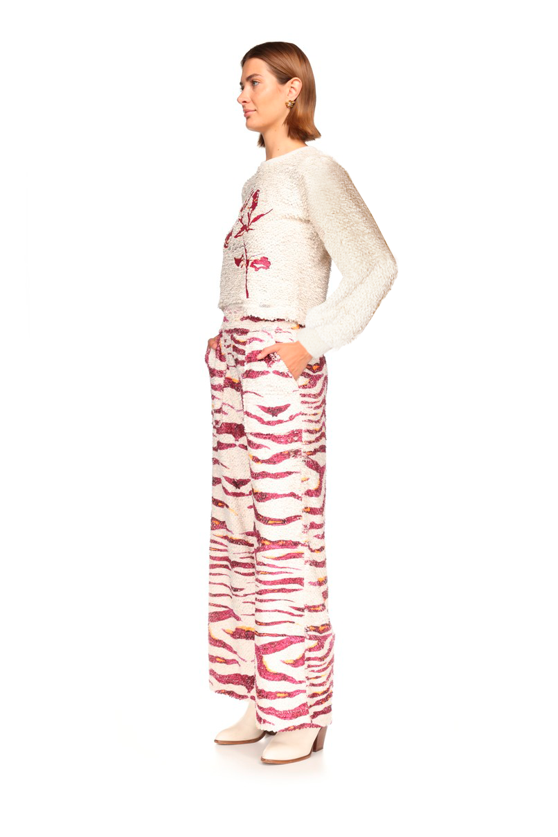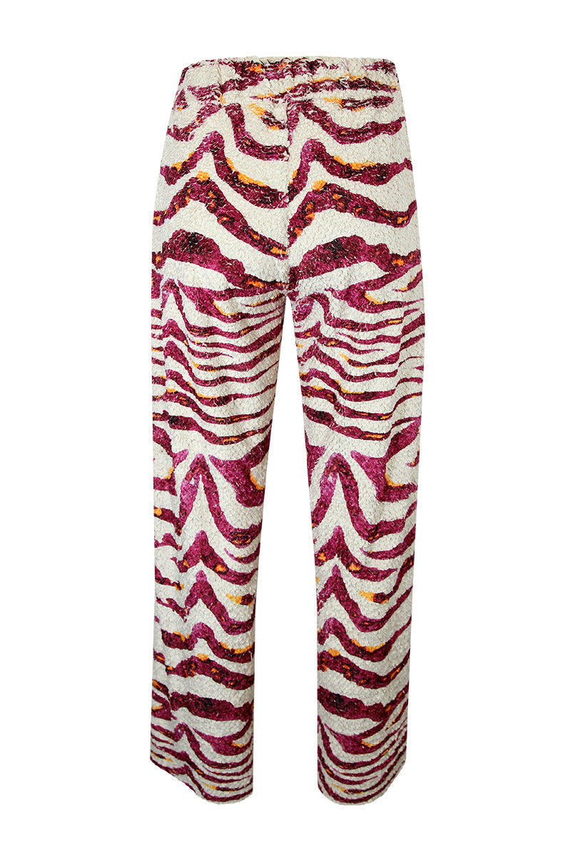 Calças relaxed fit. Cintura com cós elástico com pregas frontais. Malha fantasia estampada.