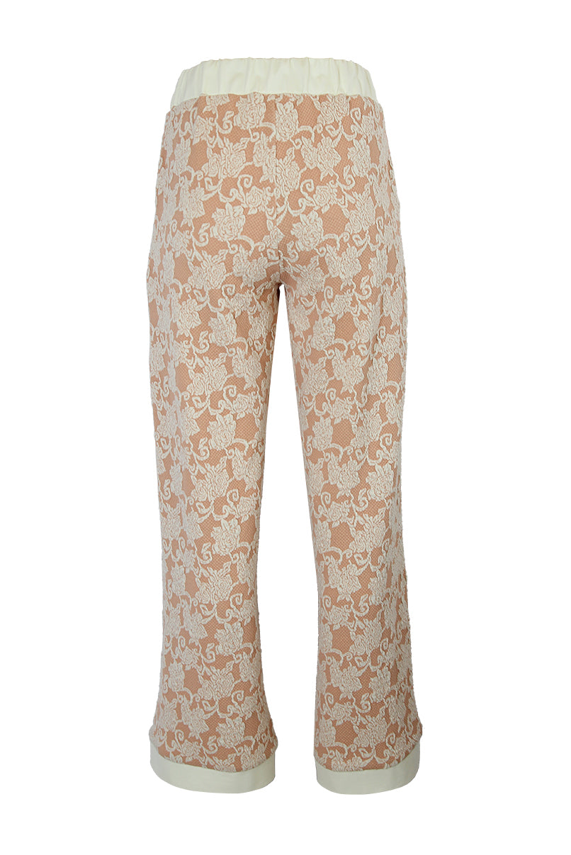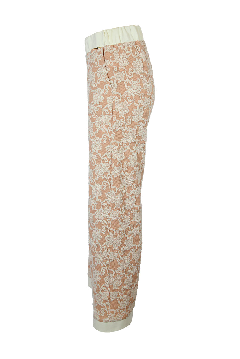 Calças de cintura média confecionadas em tecido com algodão. Pormenor de tecido jacquard brocado. Cintura elástica. Total look.