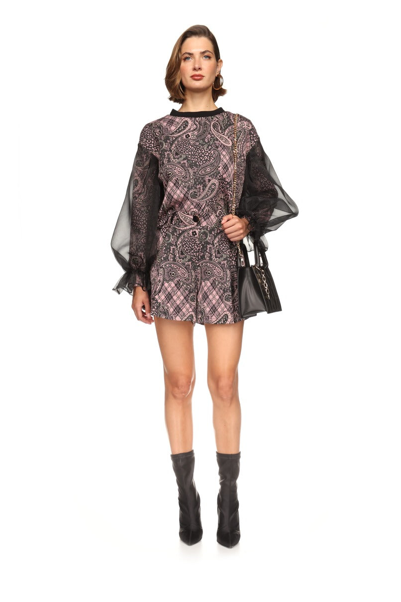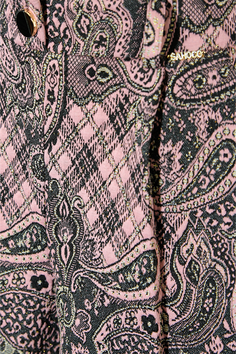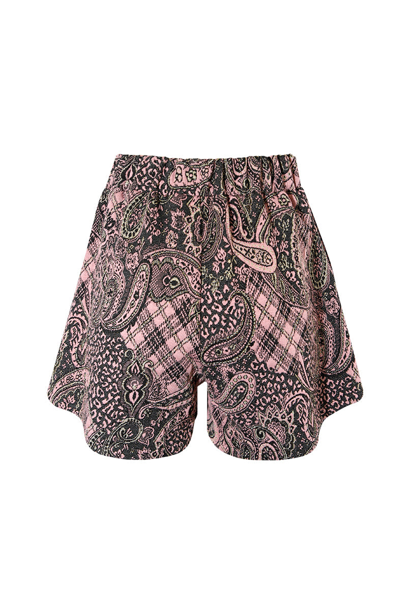 Calções confecionado em tecido jacquard. Corte fluído evasé. Cintura alta com elástico na parte de trás. Bolsos laterais. Fecho frontal com botão e fecho de correr.