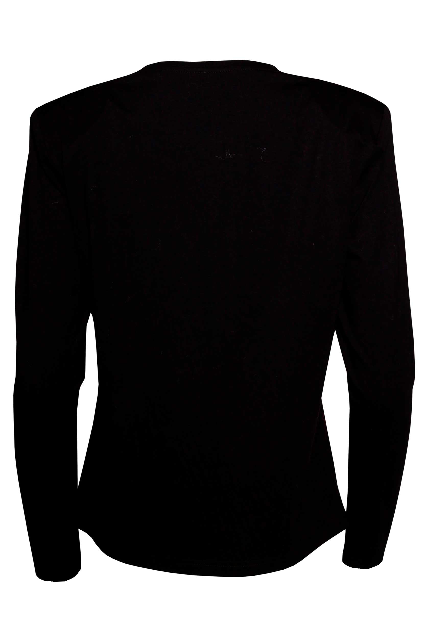 Camisola de manga comprida e decote redondo com ombreiras. Detalhe aplicações à frente.
