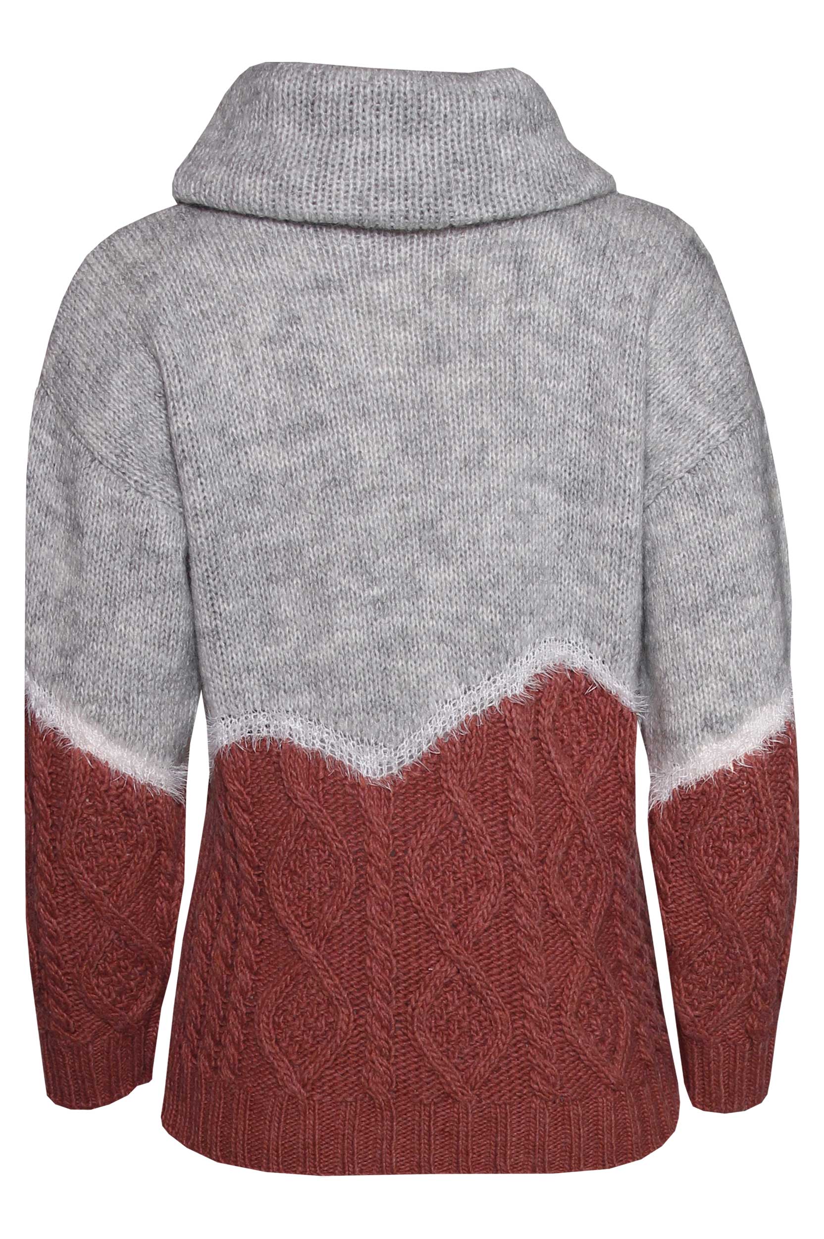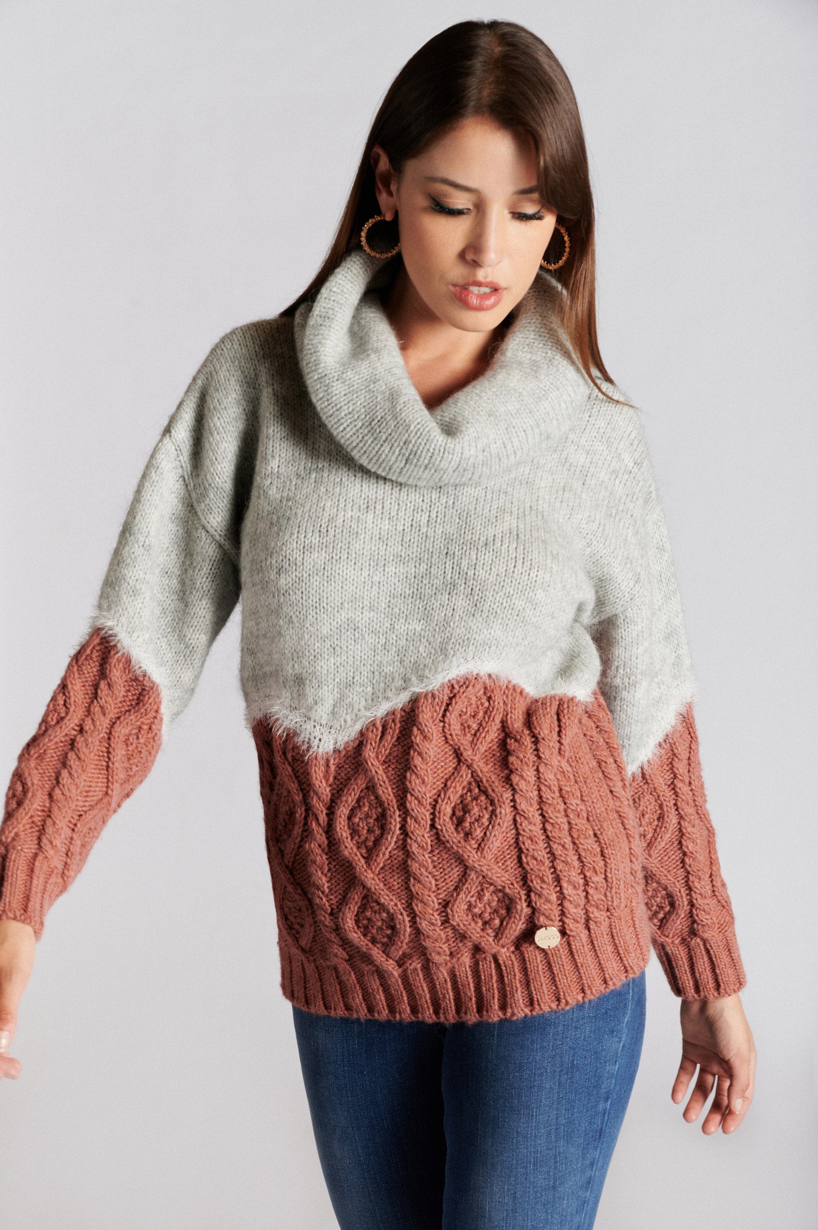 Camisola de gola alta e de mangas compridas com malha de dois tons. Apresenta uma linha de efeito peludo no tronco e nas mangas.