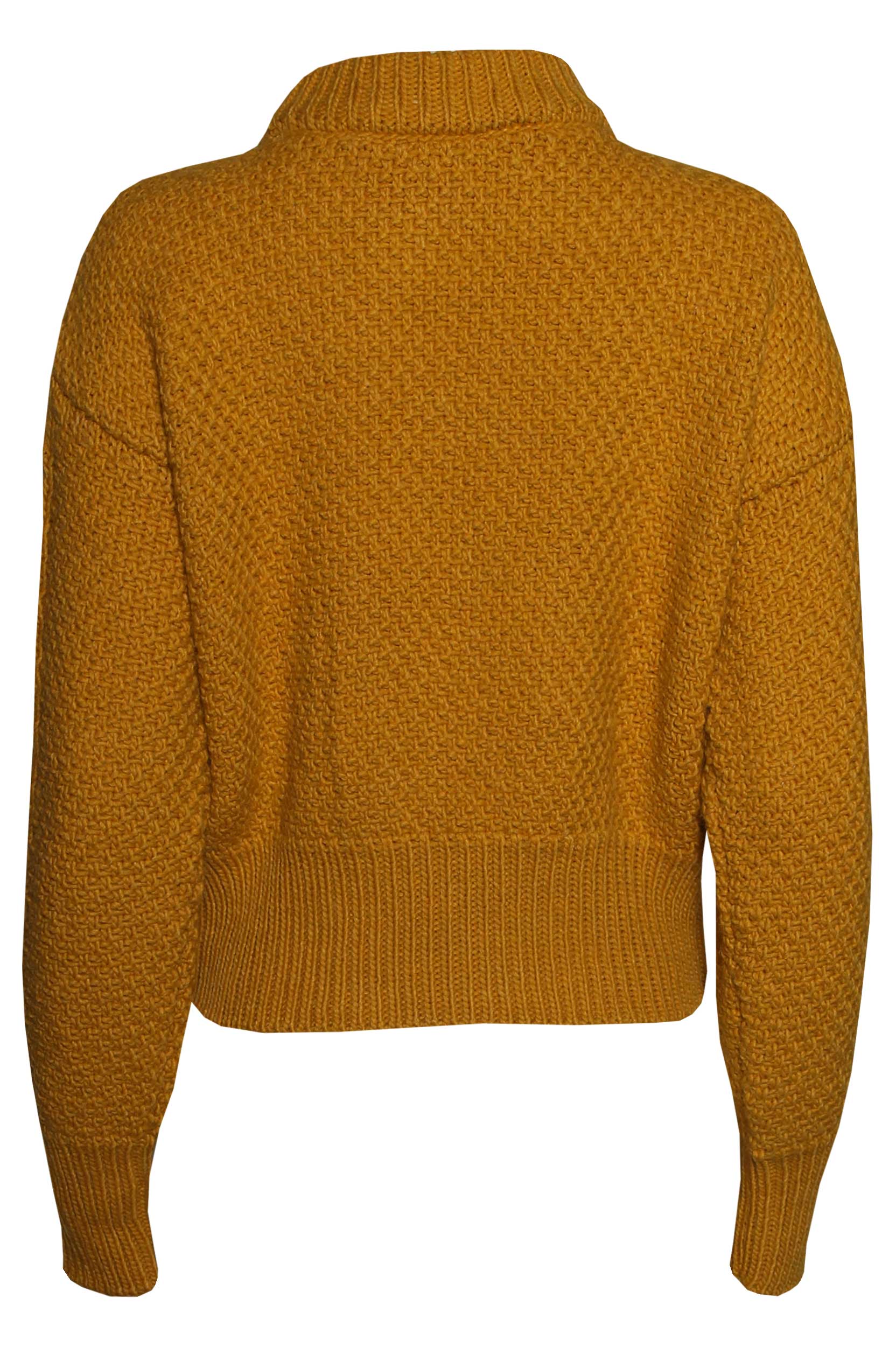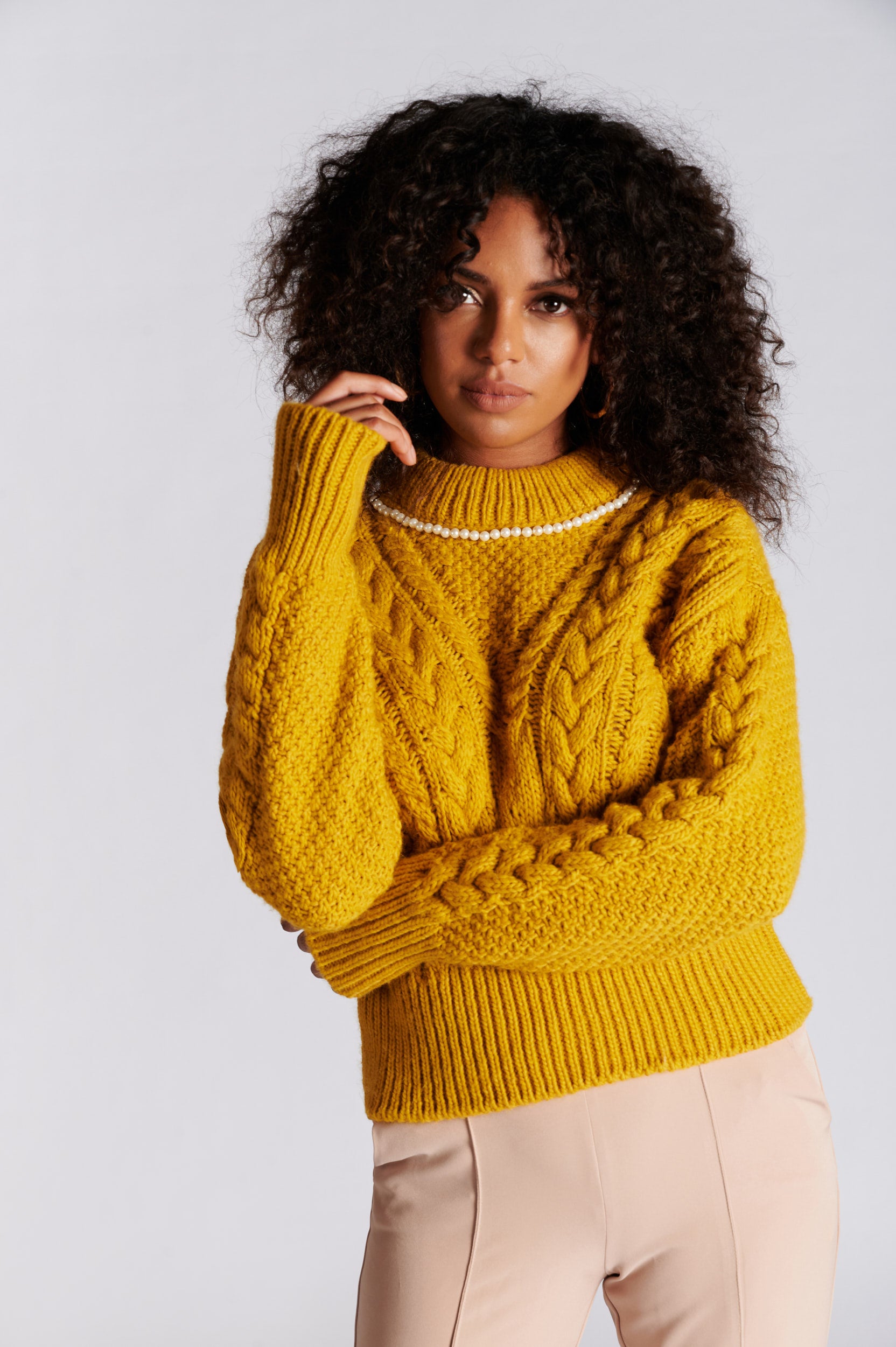 Camisola de malha jacquard efeito entrançado, de manga comprida e gola alta. Gola com detalhe de pérolas.
