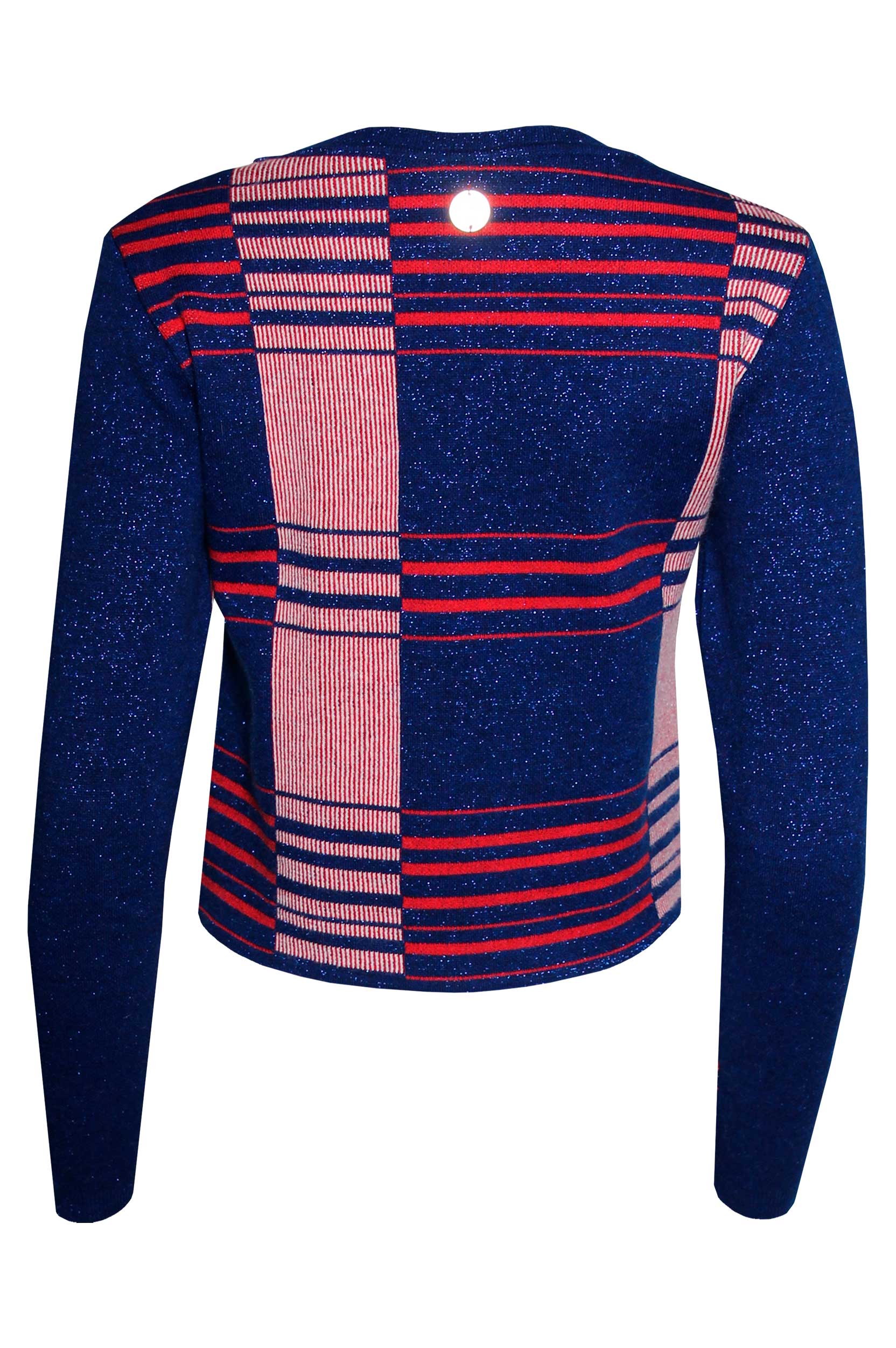 Camisola de malha padrão geométrico com lurex. Manga comprida e decote redondo.