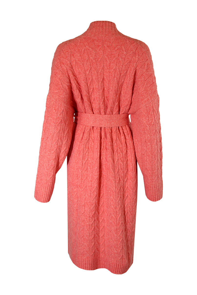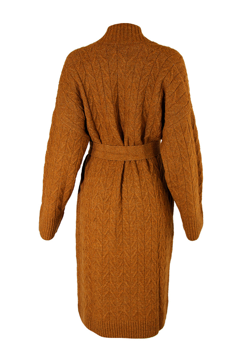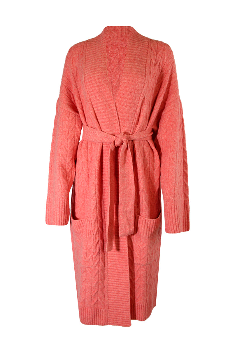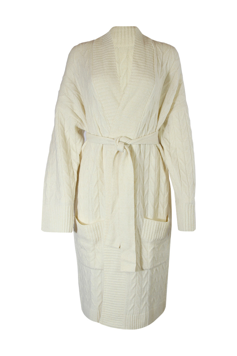 Casaco comprido de malha. Fecho frontal traçado com cinto no mesmo tecido. Manga comprida larga. Bolsos frontais de chapa.