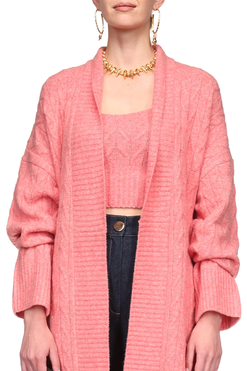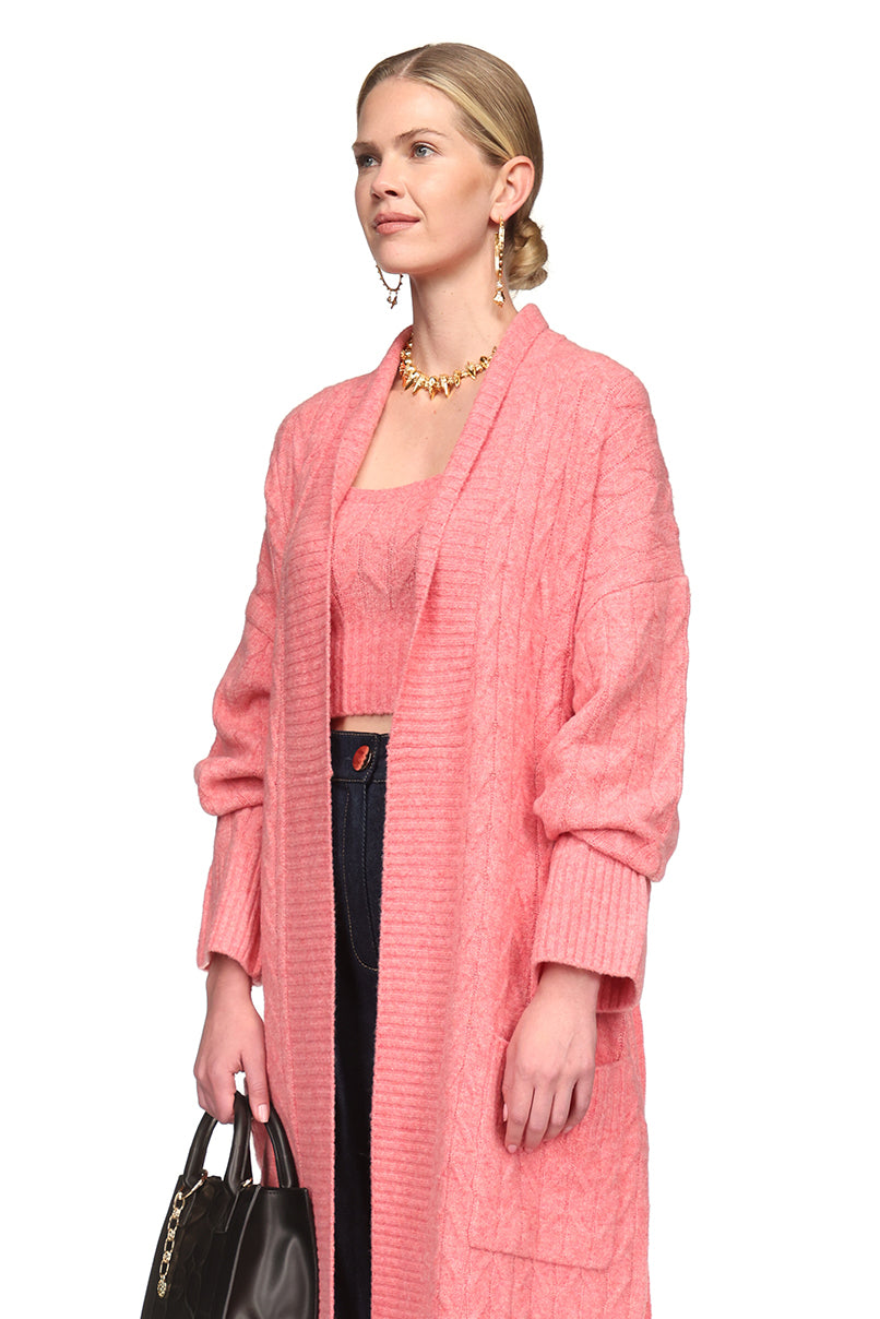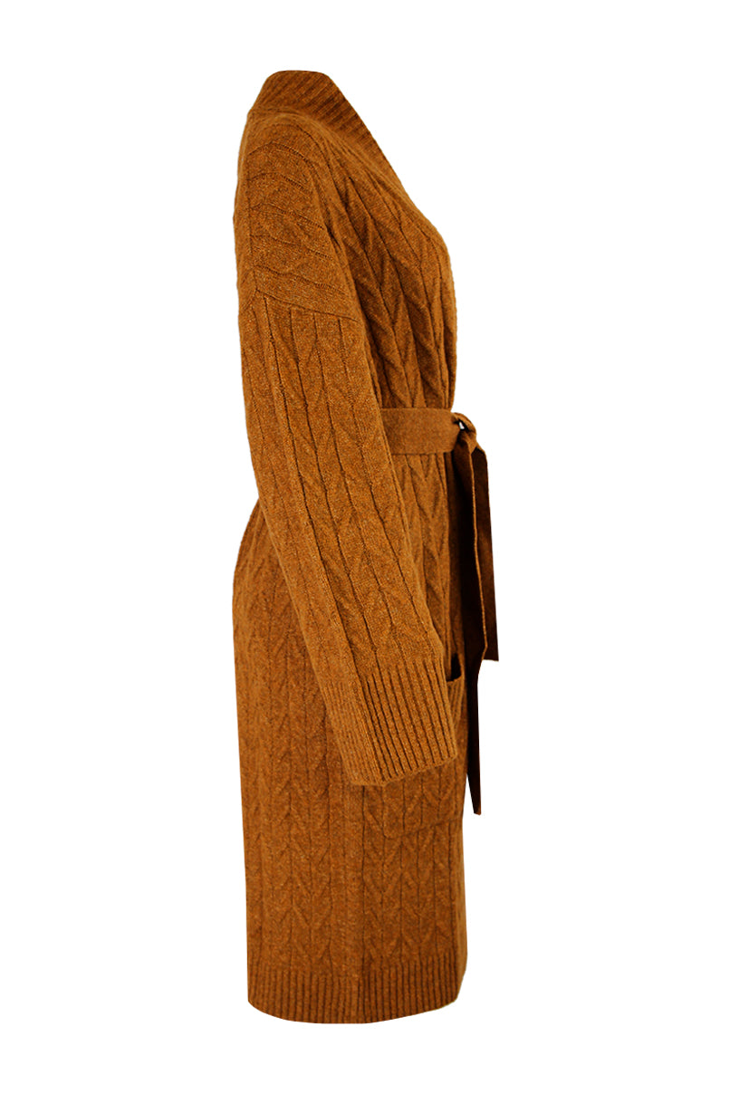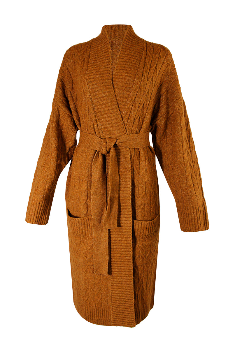 Casaco comprido de malha. Fecho frontal traçado com cinto no mesmo tecido. Manga comprida larga. Bolsos frontais de chapa.