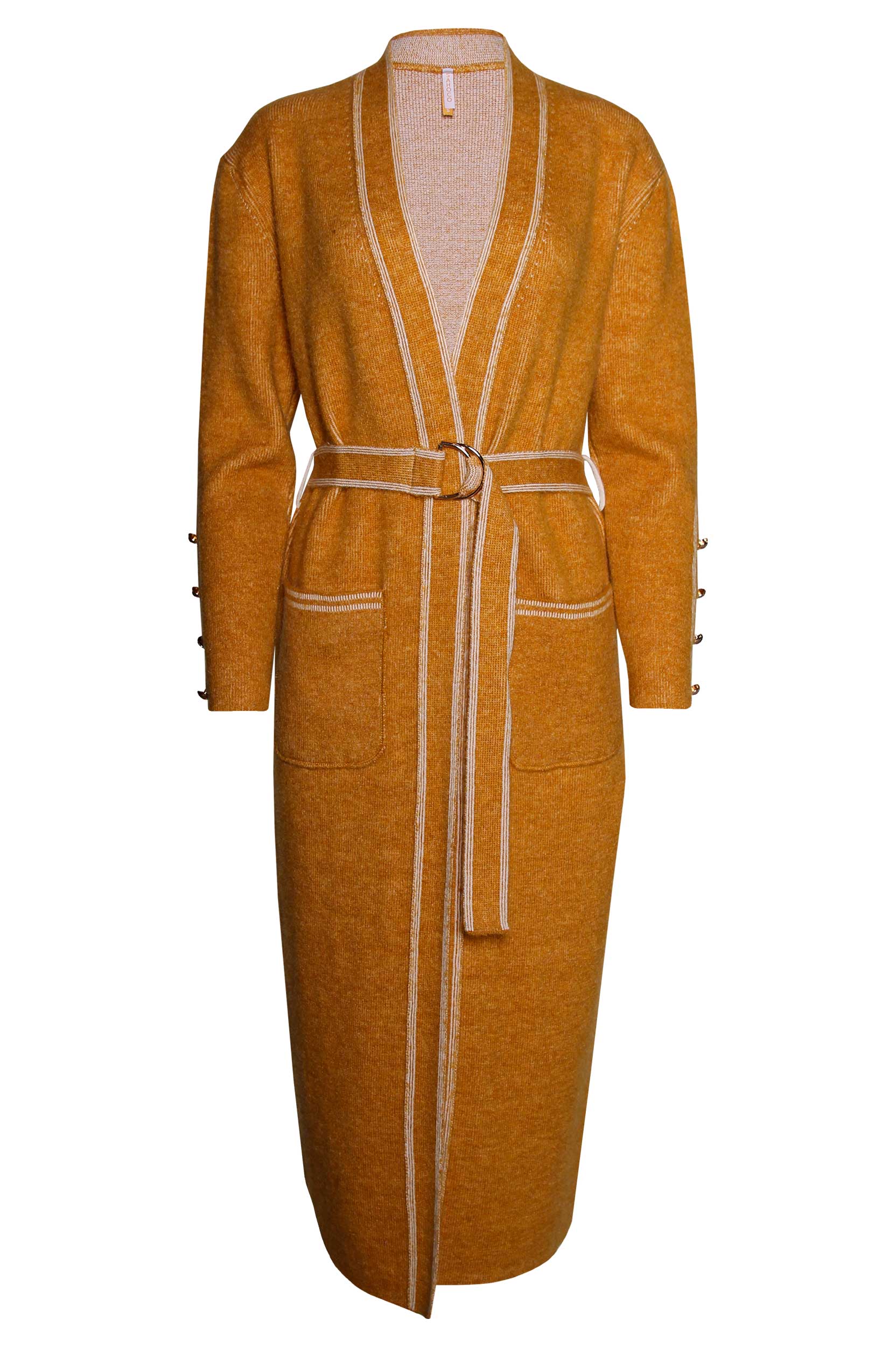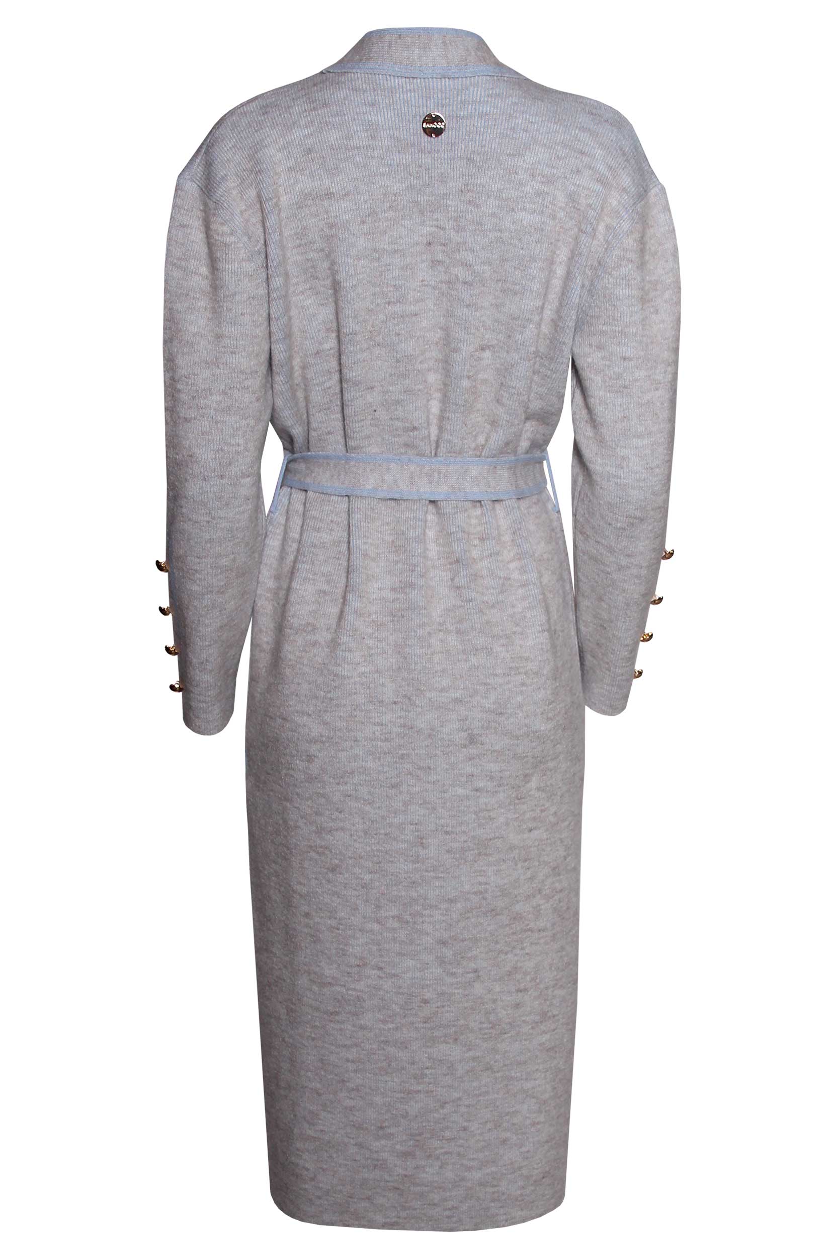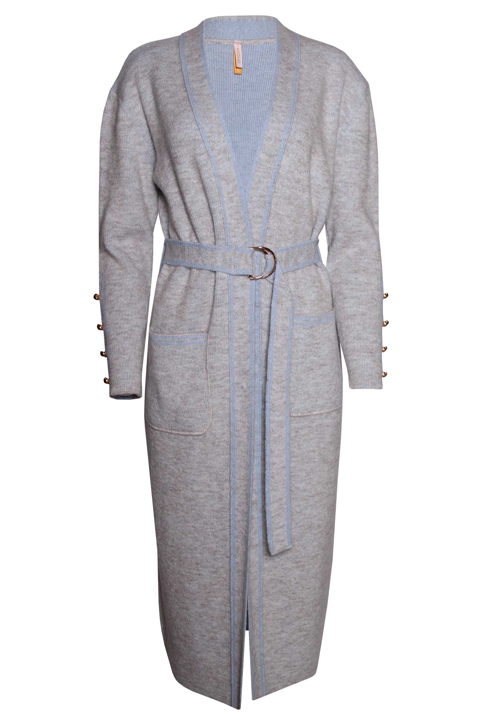 Casaco de malha comprido com cinto. Detalhe de botões nas laterais dos punhos e bolsos de chapa à frente. Acompanha cinto no mesmo tecido com fivela metálica.