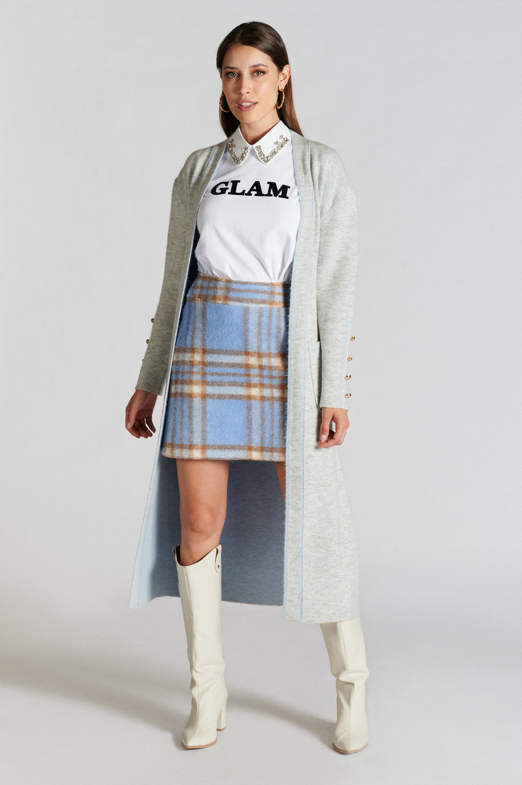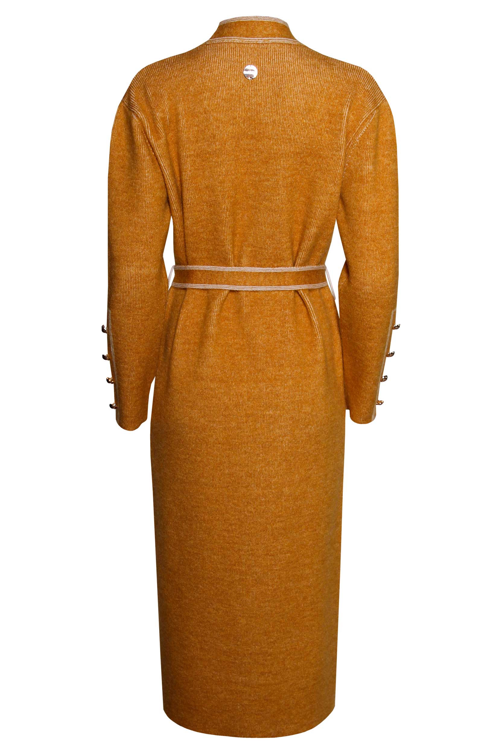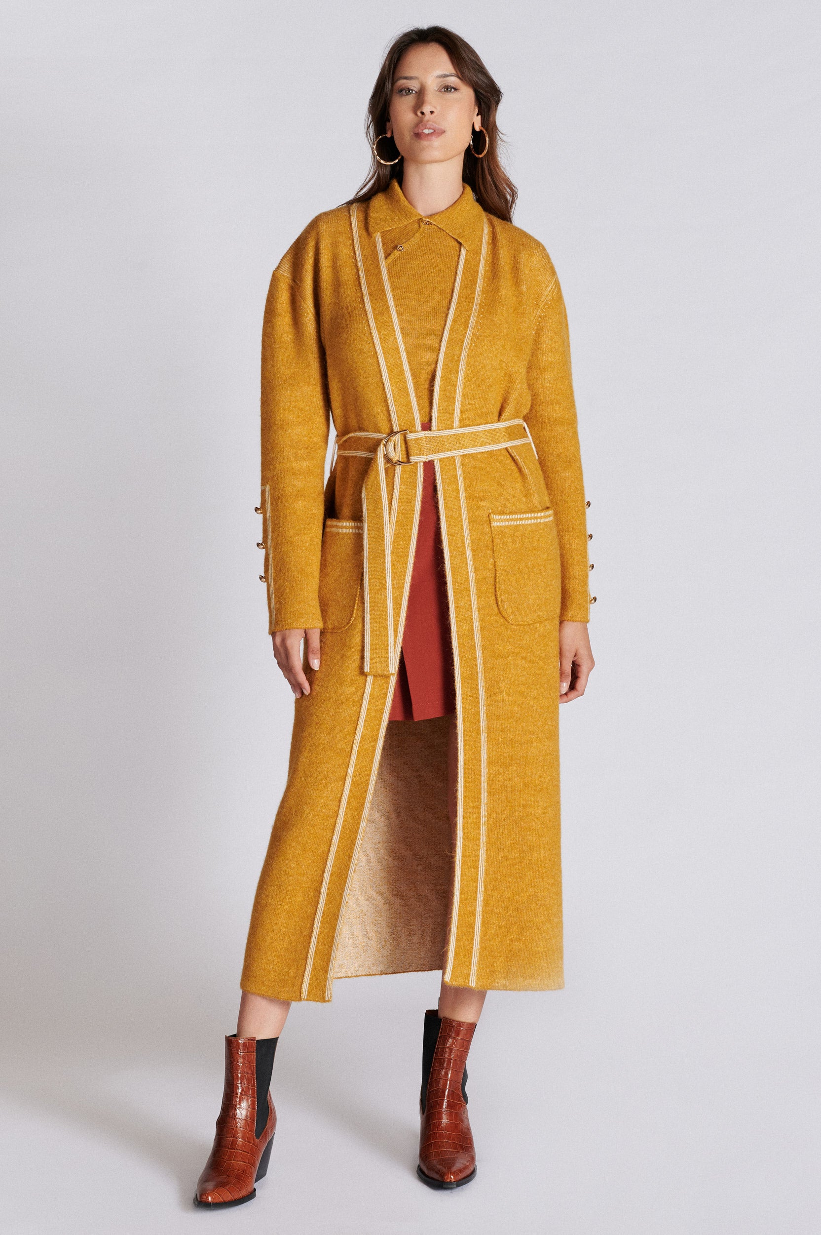 Casaco de malha comprido com cinto. Detalhe de botões nas laterais dos punhos e bolsos de chapa à frente. Acompanha cinto no mesmo tecido com fivela metálica.