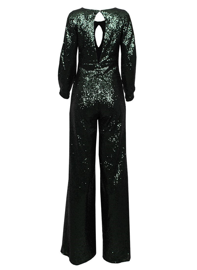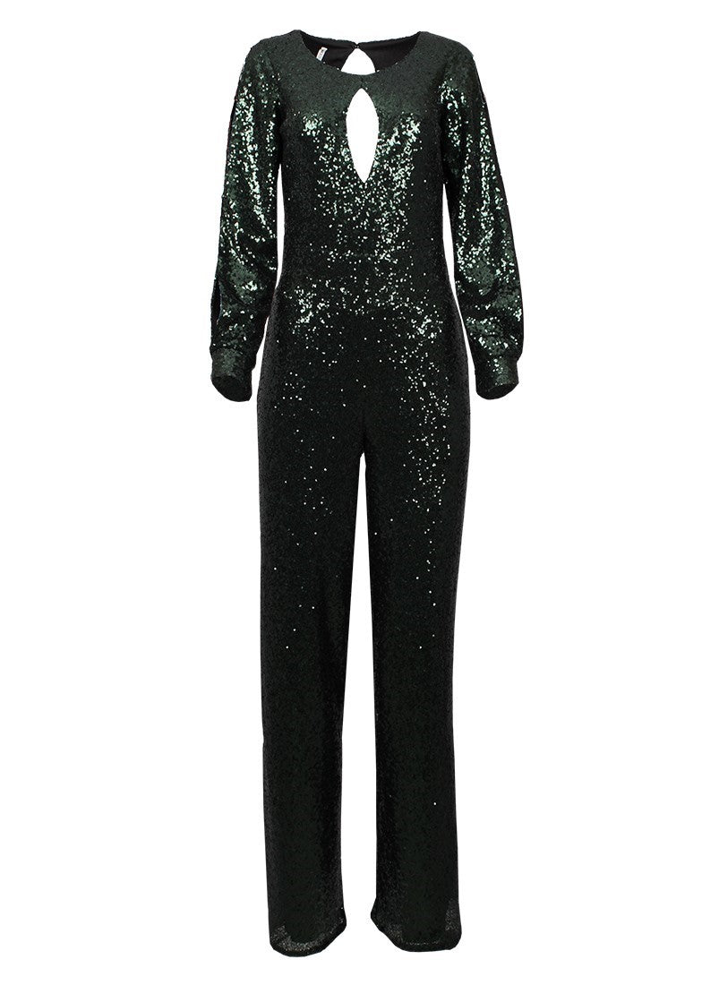 Macacão comprido de lantejoulas. Bolsos ocultos na costura. Abertura nas mangas e à frente. Decote profundo atrás. Fecho de botão atrás.