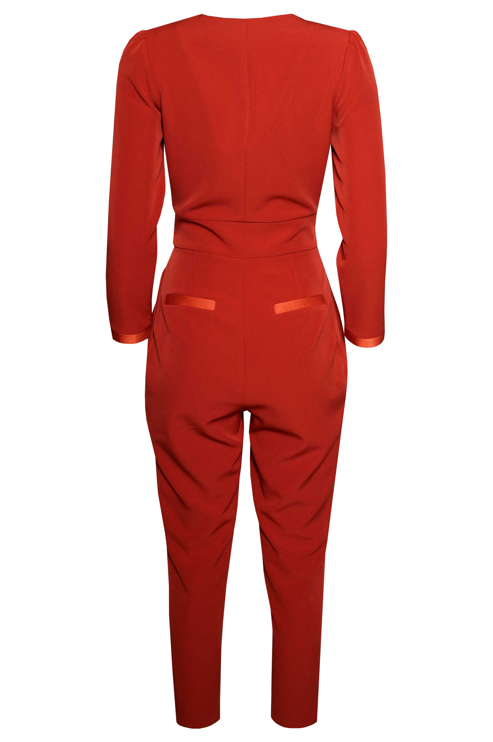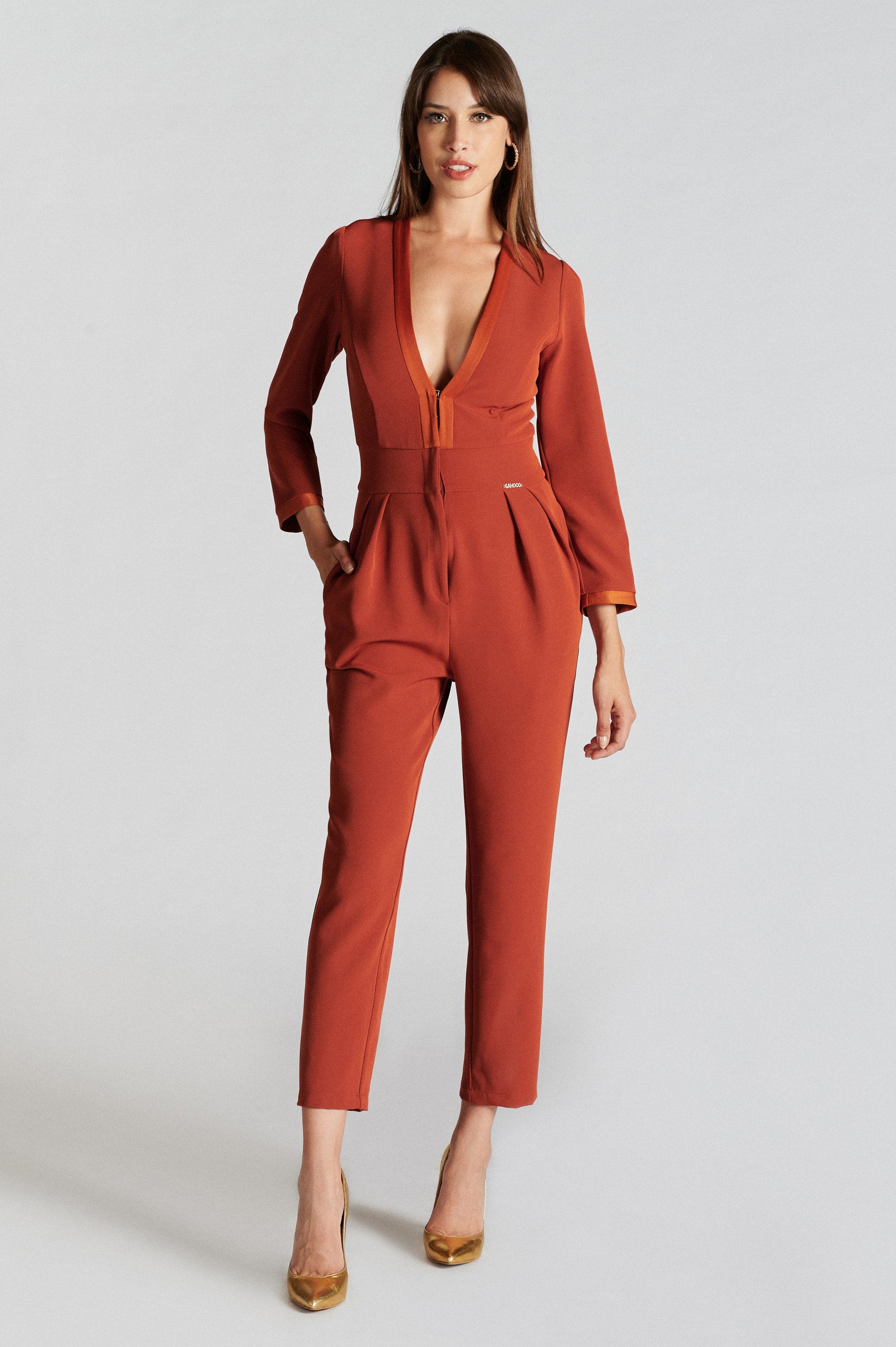 Macacão de fitting justo de manga comprida e decote em V. Bolsos falsos de 1 vivo atrás. Peça avivada com tecido acetinado no decote, punhos e bolsos.