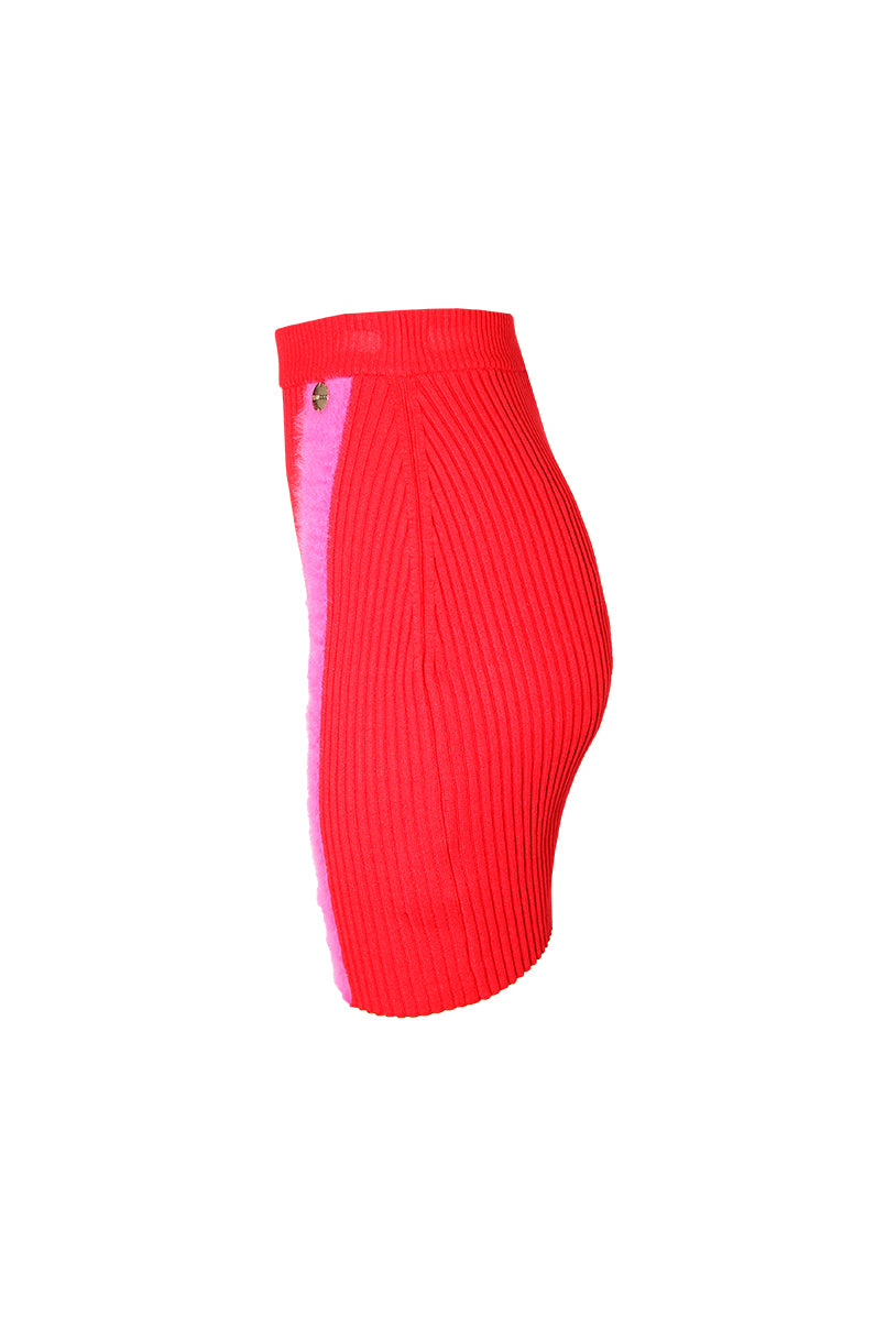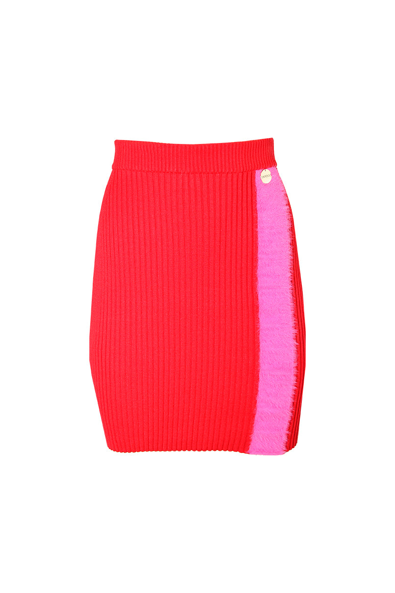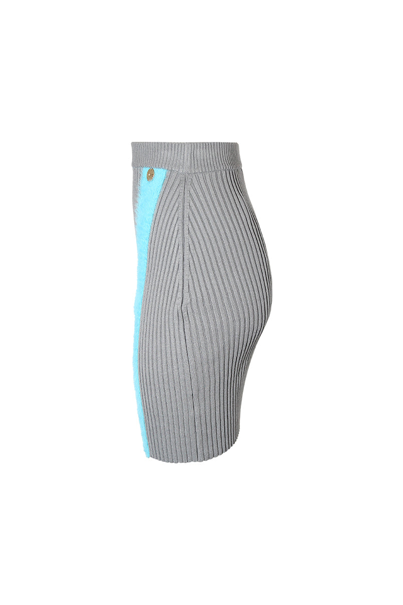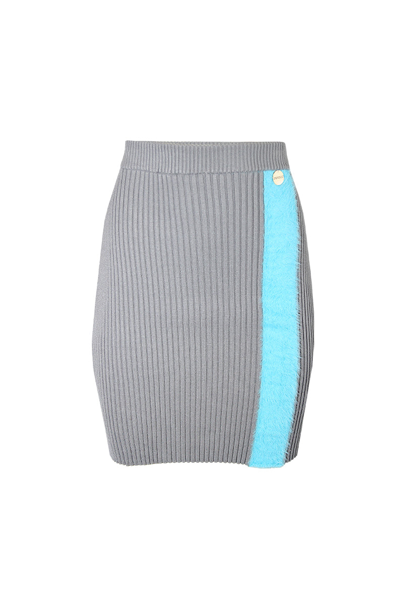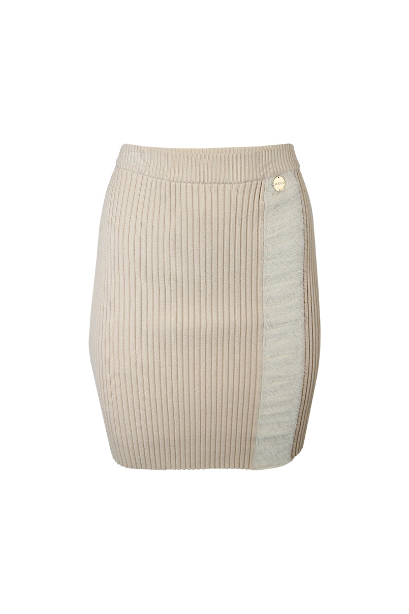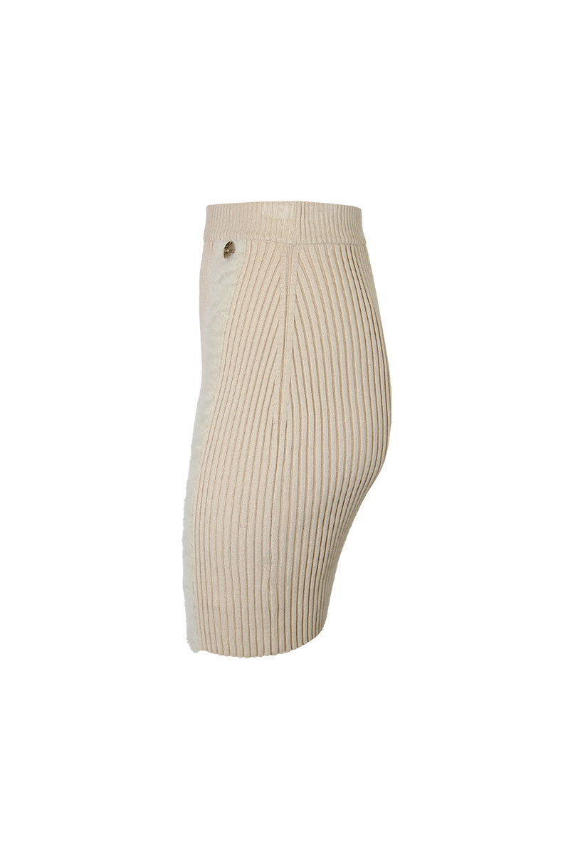 Saia curta de malha. Efeito nervuras. Cós elástico. Pormenor de aplicação em pelo.