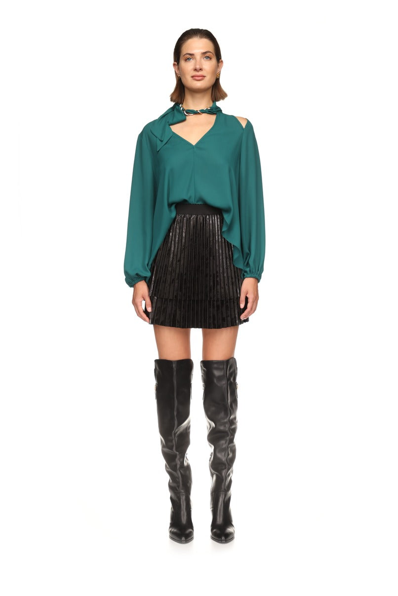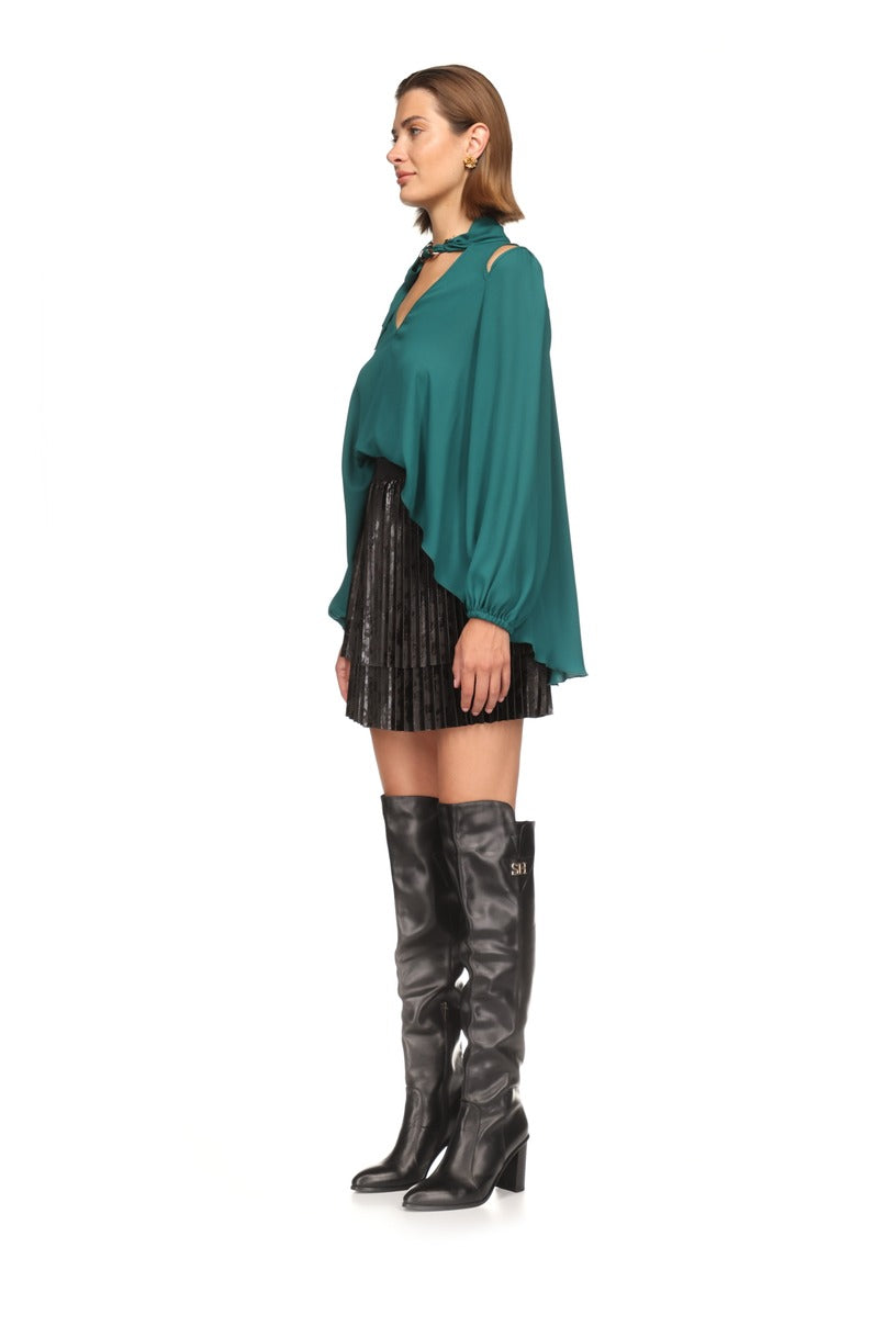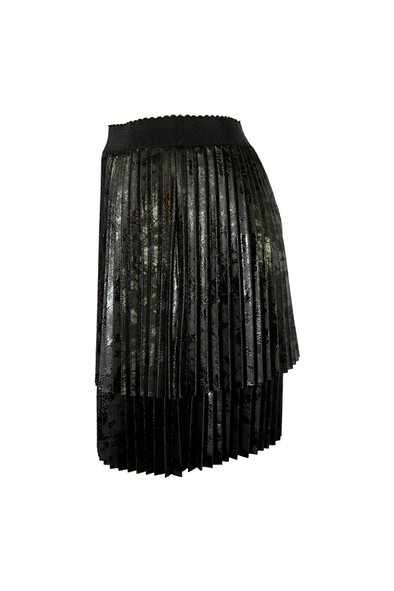 Saia curta plissada confecionada em tecido com efeito couro. Cós elástico. Design em camadas e pregas profundas.