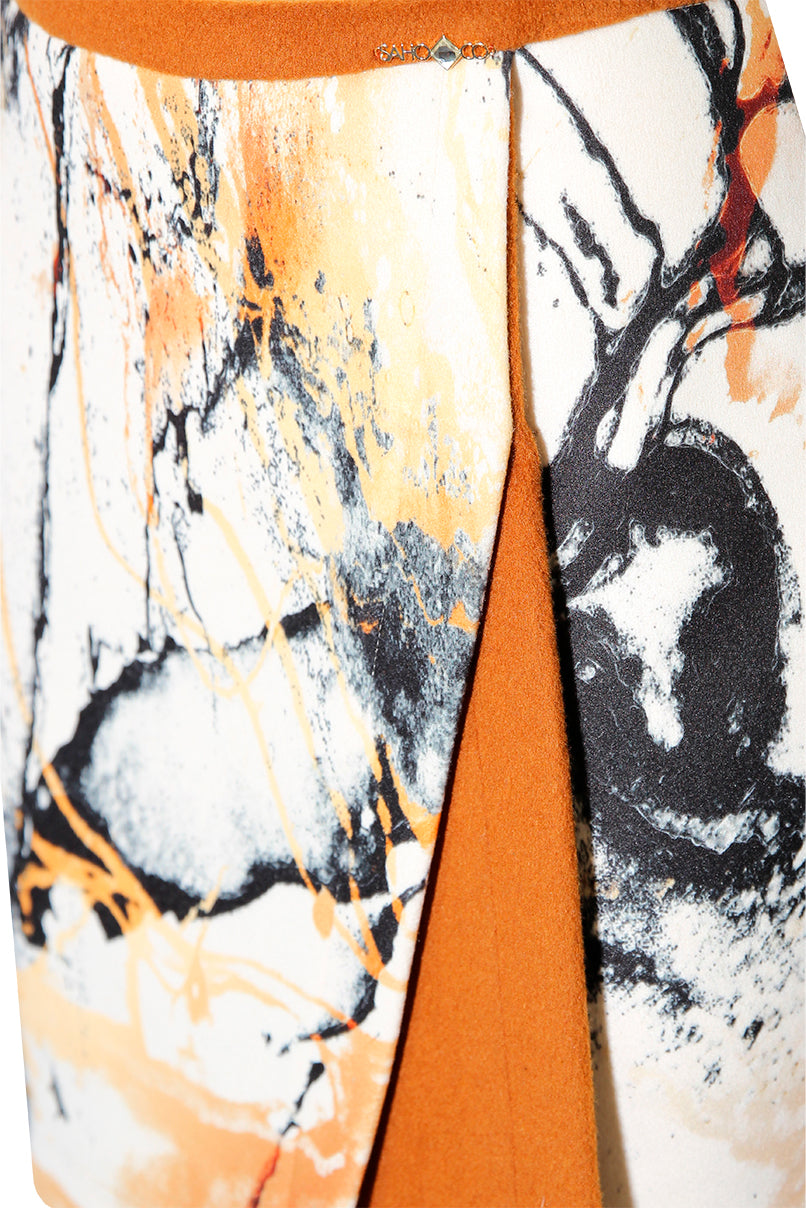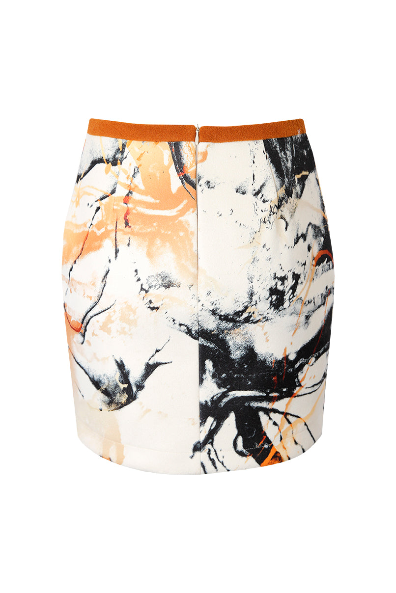 Saia curta confecionada em tecido estampado. Efeito cruzado com abertura lateral. Cós em contraste. Fecho atrás com fecho de correr. Forro no tom. Total look.