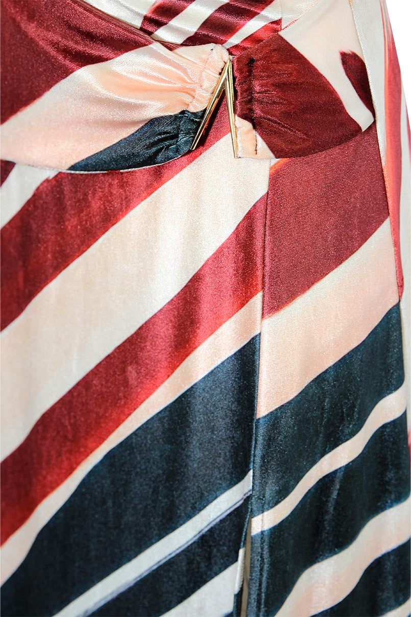 Saia confecionada em tecido estampado aveludado. Corte evasé. Pormenor de efeito traçado com peça metálica na cintura.