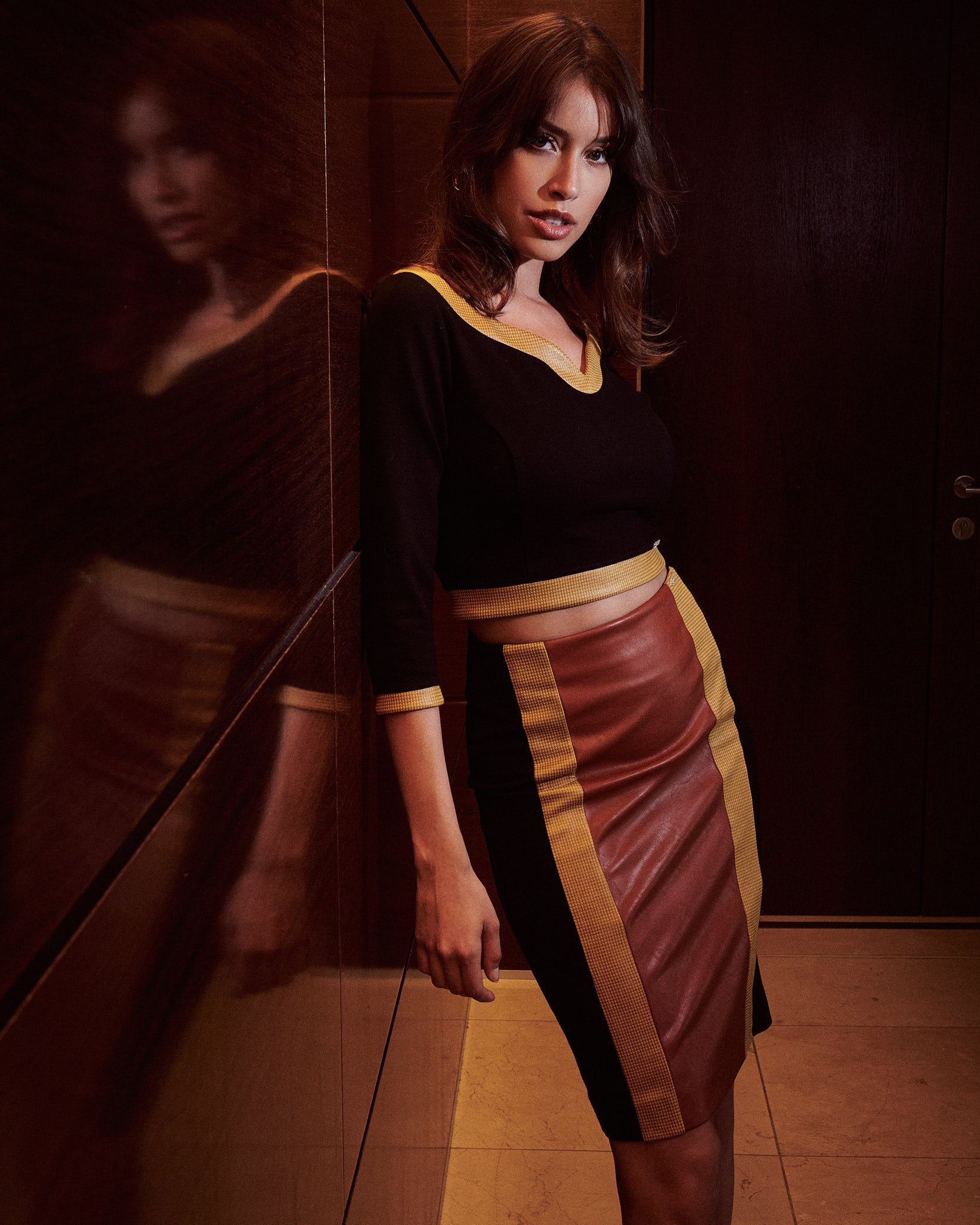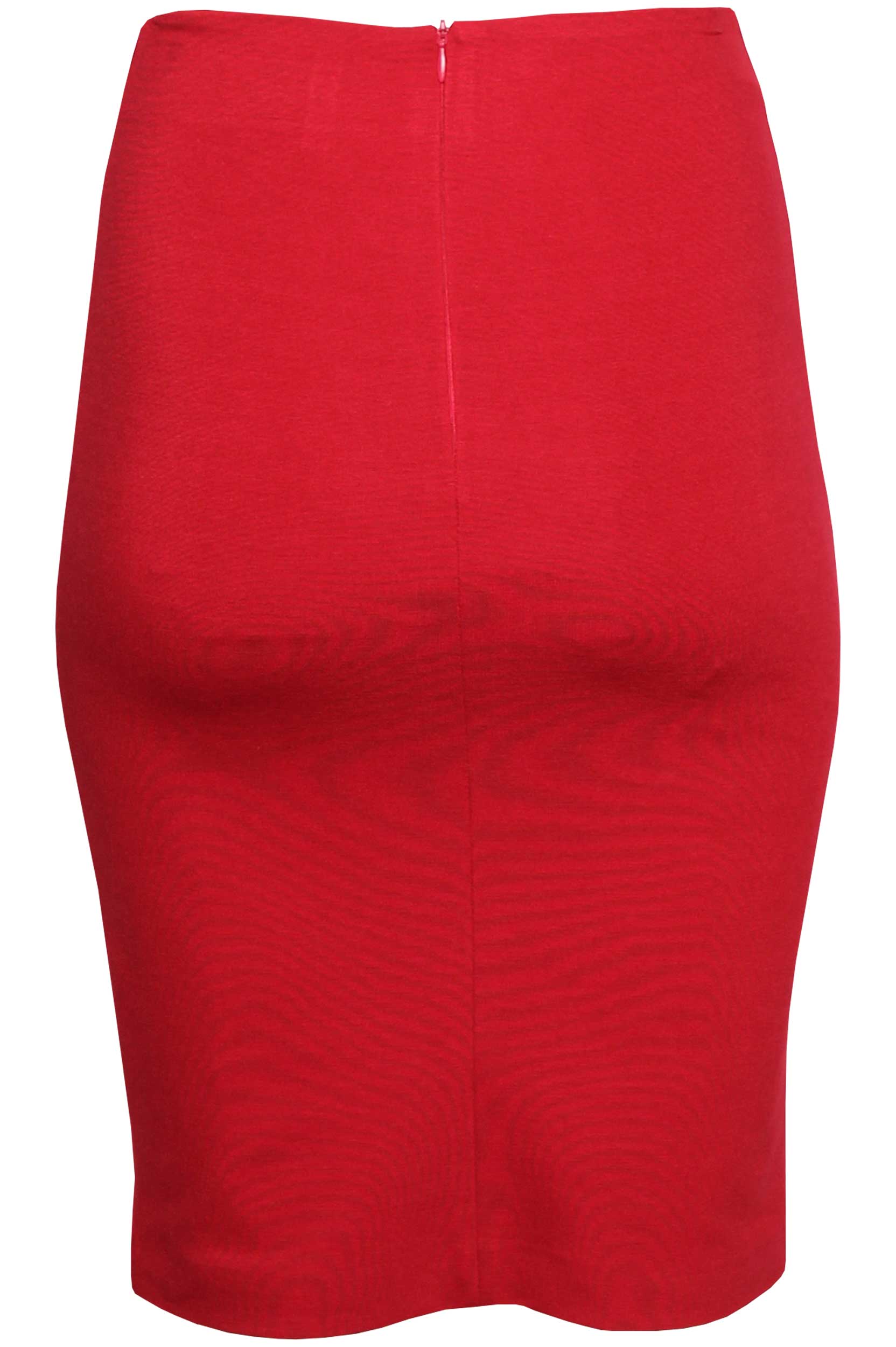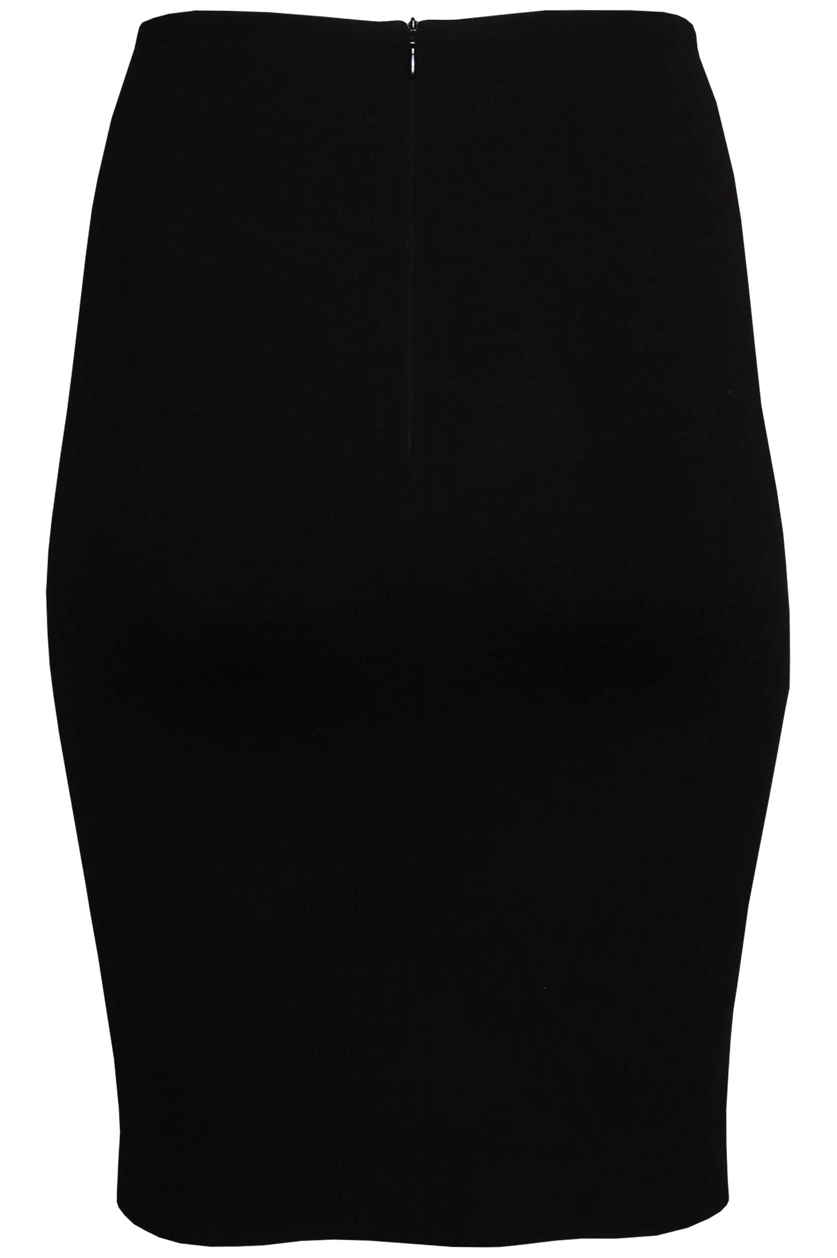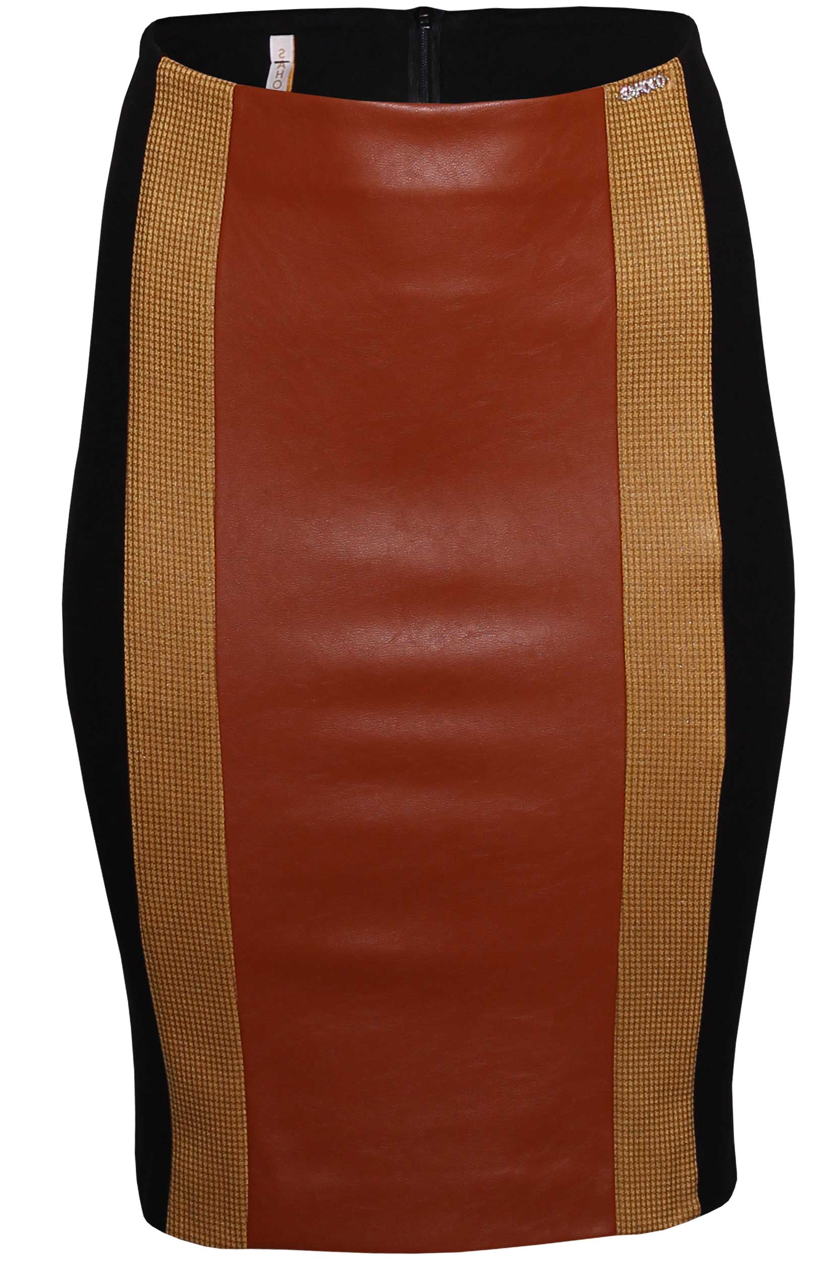 Saia lápis de comprimento midi. Detalhe em napa à frente. Fecho de correr invisível atrás.