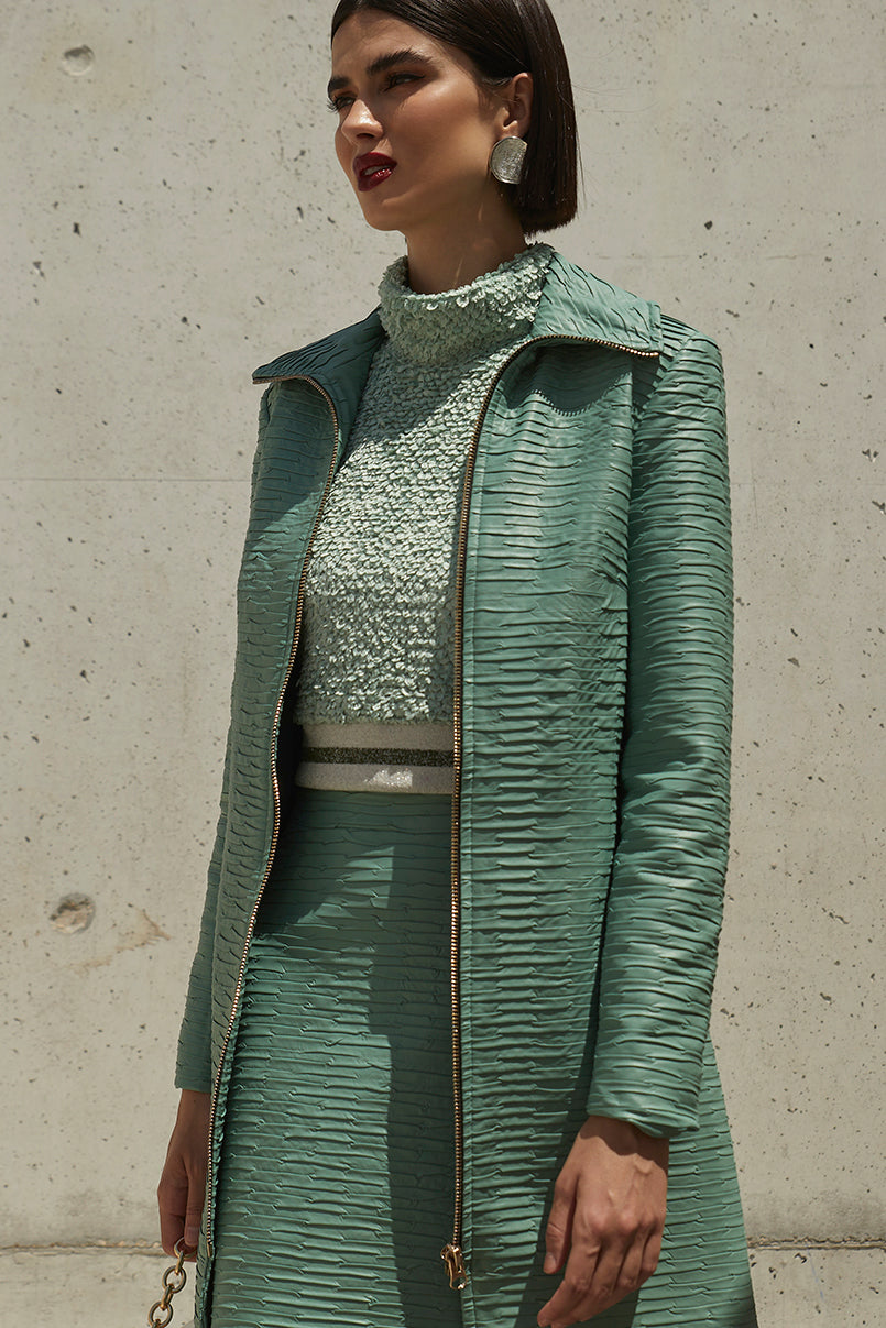 Corte direito e justo. Fecho atrás com fecho de correr invisível.