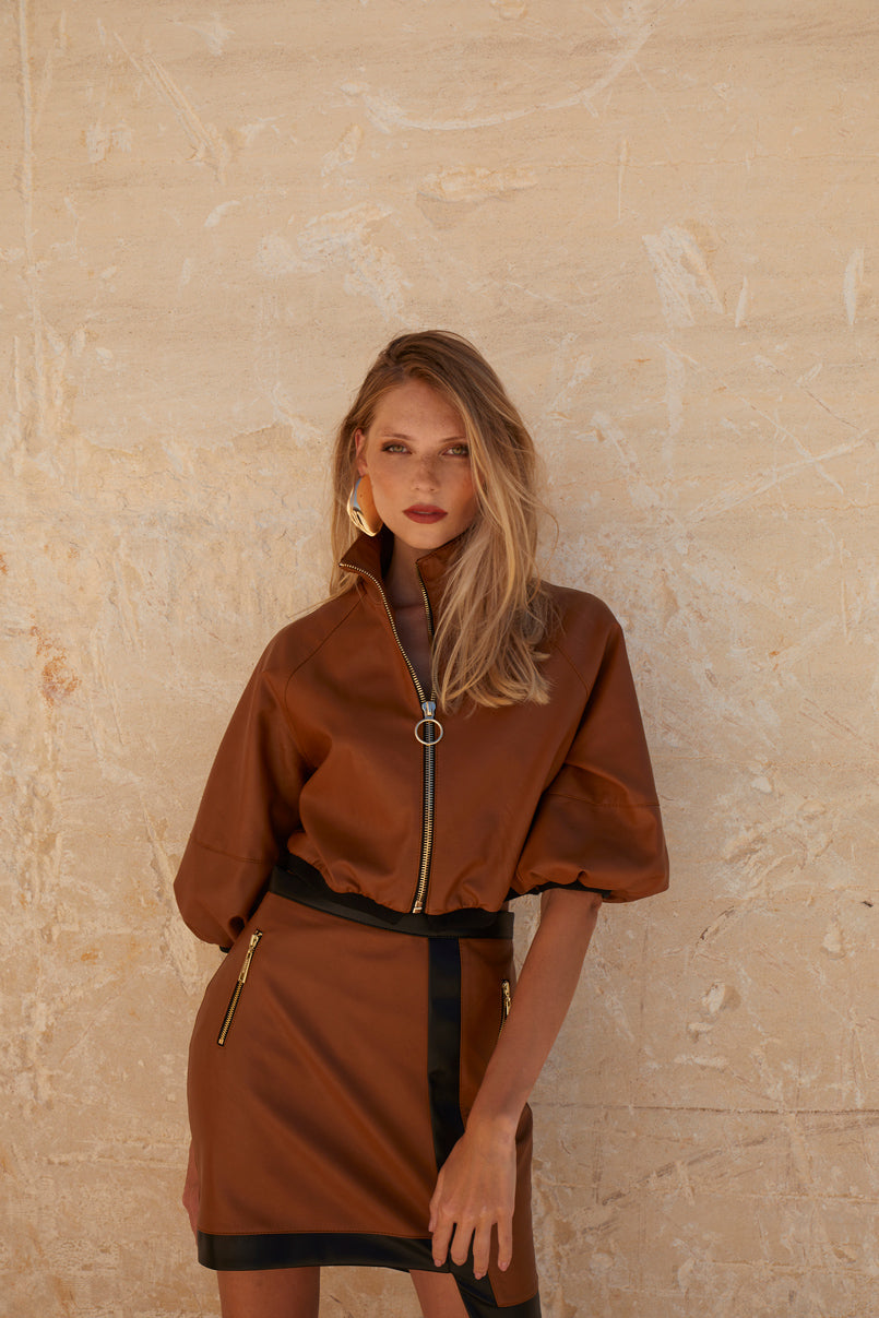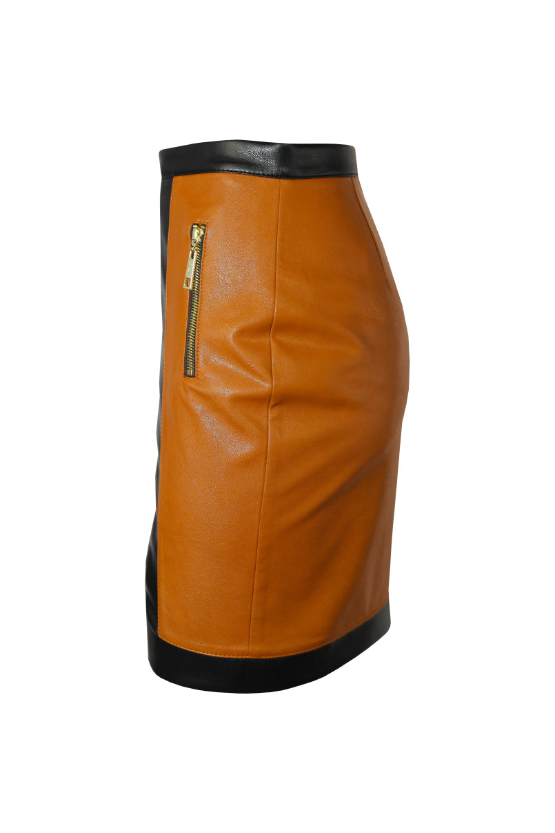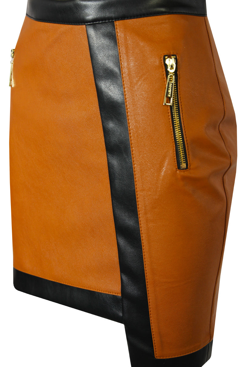 Minissaia curta em tecido efeito pele. Bainha assimétrica. Cós e efeito debruado em contraste no mesmo tecido. Fecho atrás com fecho de correr invisível.