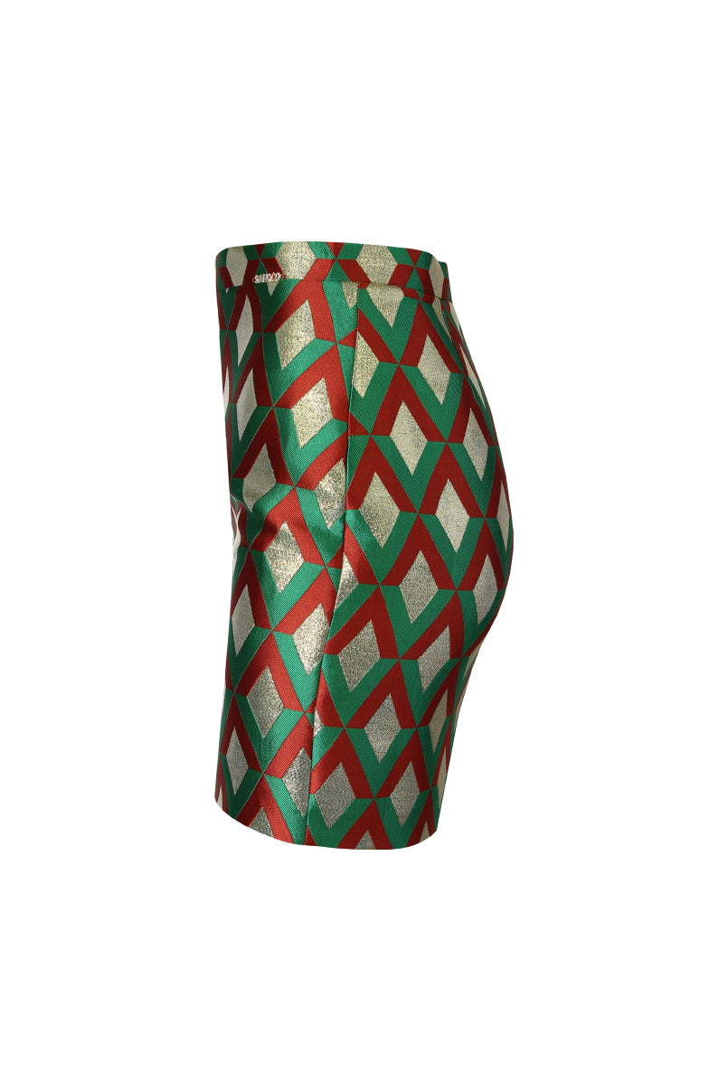Saia curta jacquard de cintura subida. Fecho atrás com fecho de correr oculto na costura.