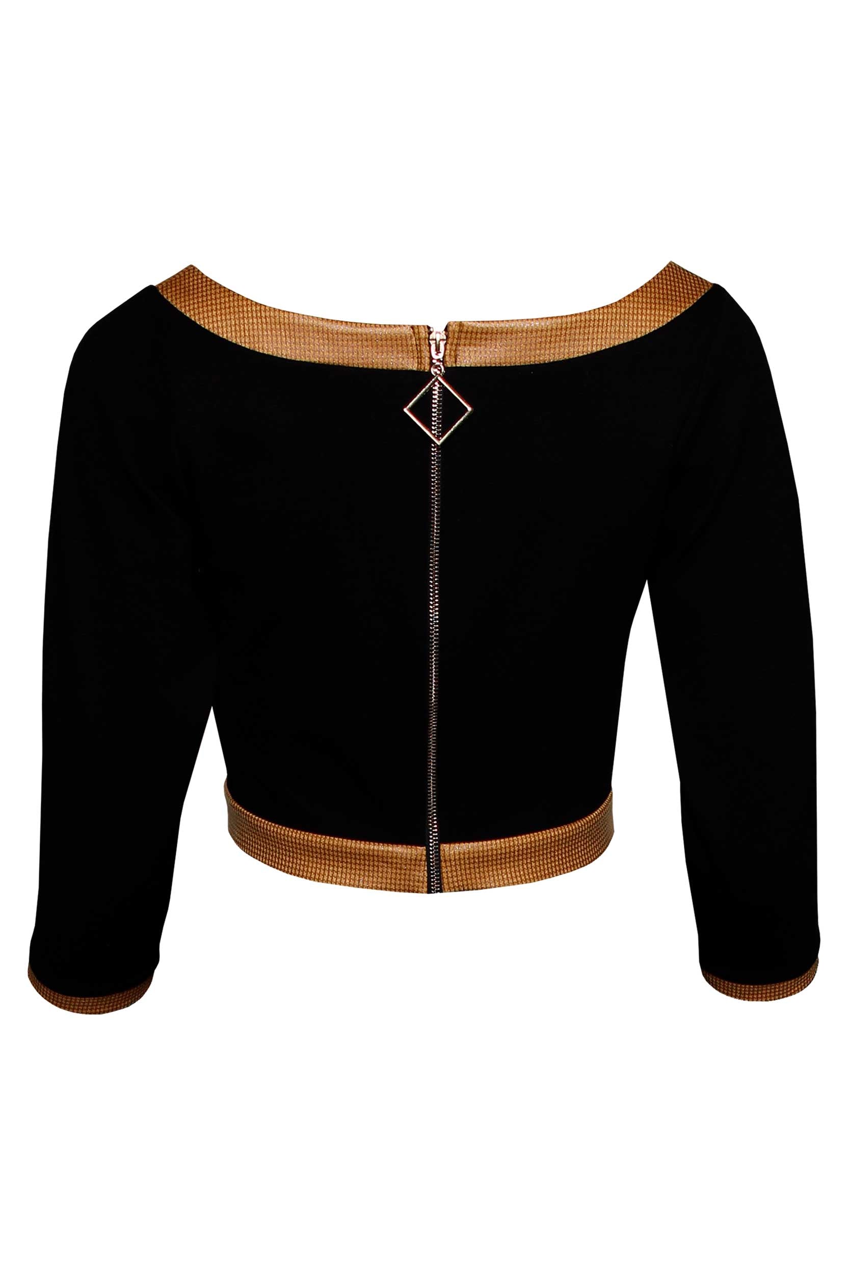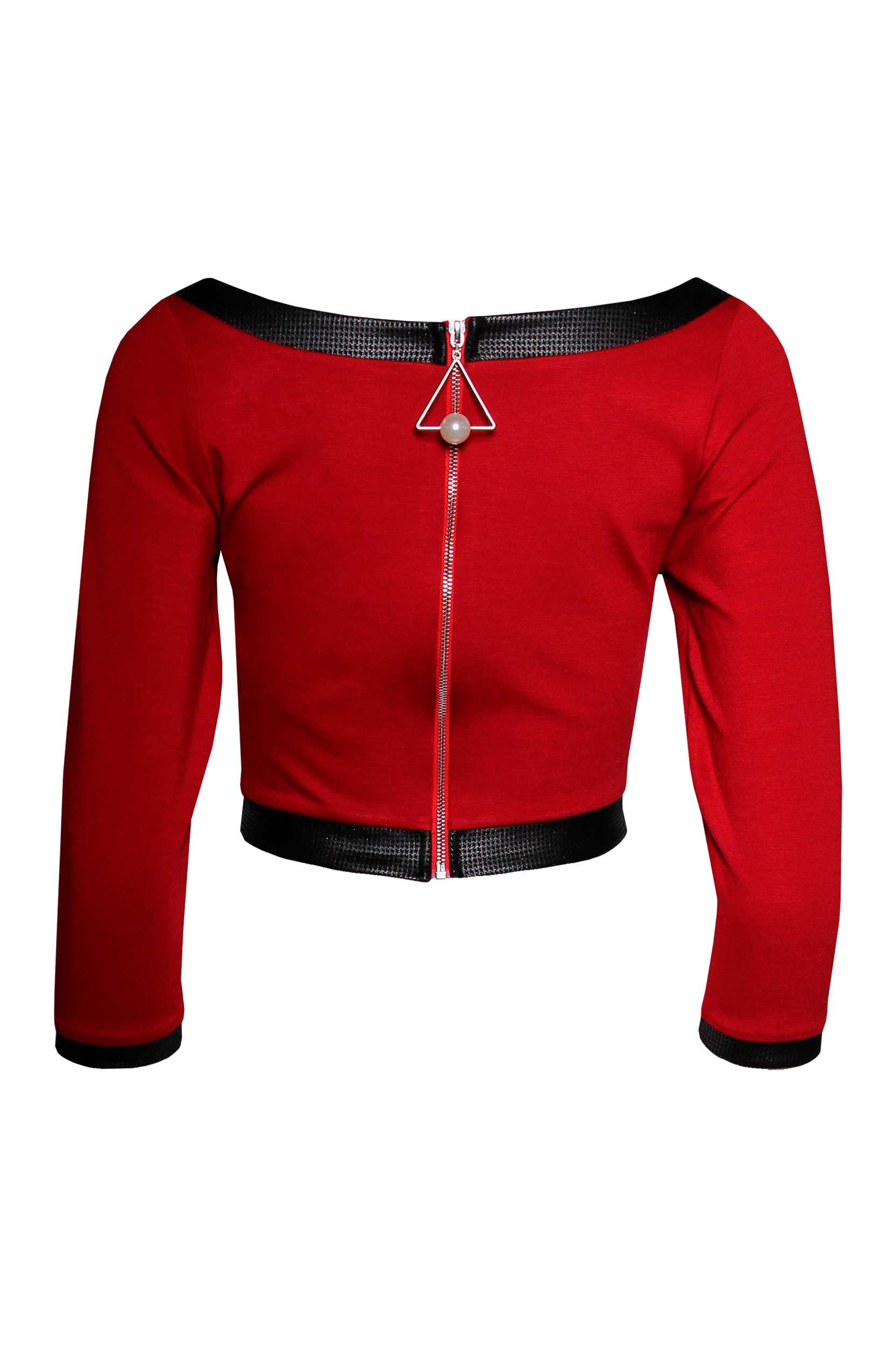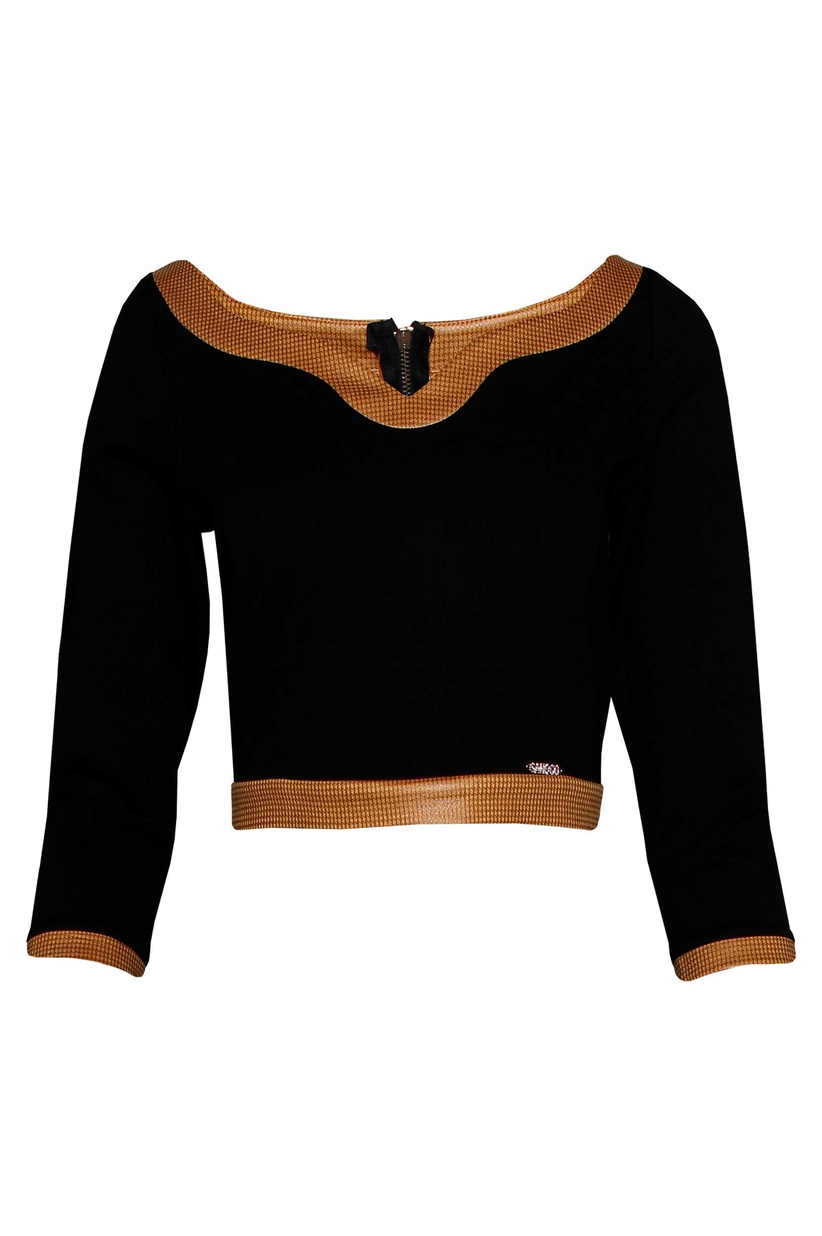Top cropped com decote efeito coração, de manga comprida. A peça é avivada em napa no decote, punhos e cintura. Fecho atrás mediante fecho de correr.
