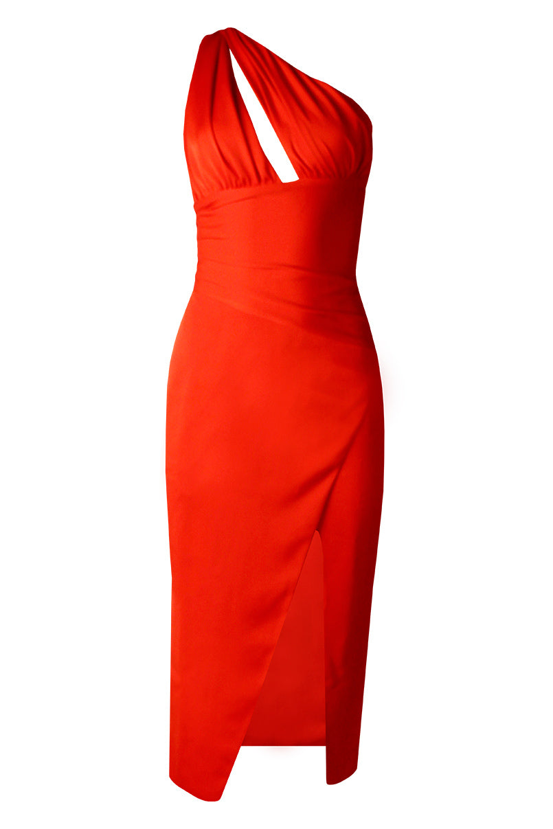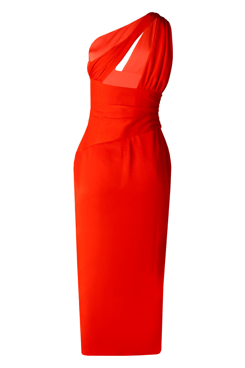 Vestido comprido acetinado de ombro descoberto com abertura na zona do peito e nas costas. Pormenor de rufos na zona da cintura. Abertura lateral na base. Fecho invisível lateral.