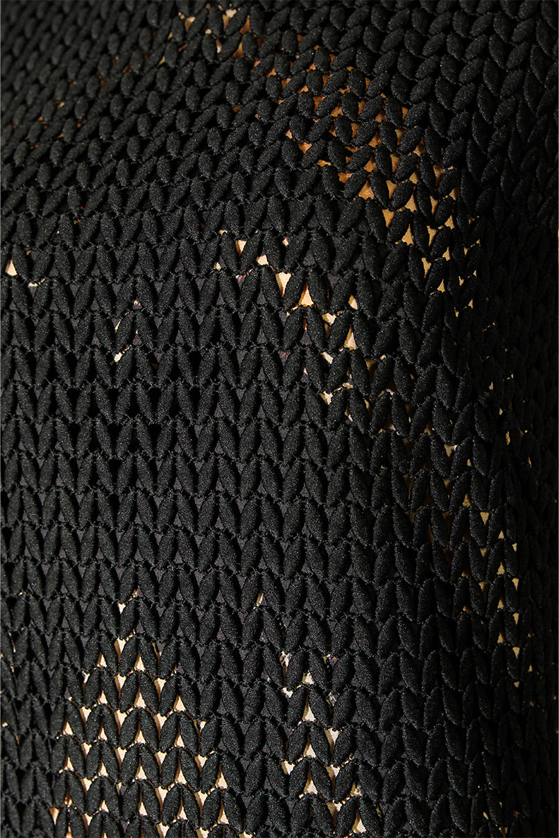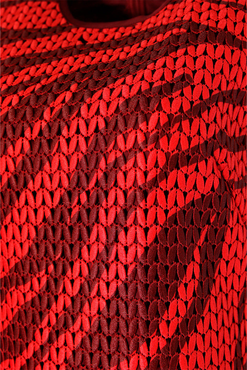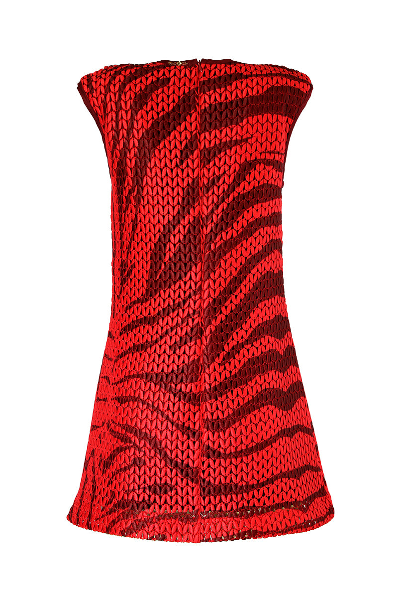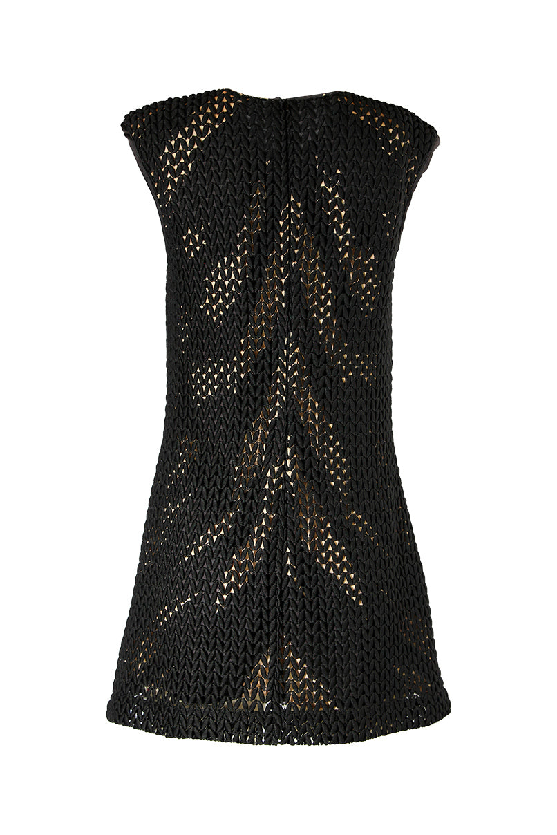 Vestido corte reto, de malha com padrão geométrico recortado. Forro estampado, criando um contraste com o tecido recortado. Manga cava e decote redondo.
