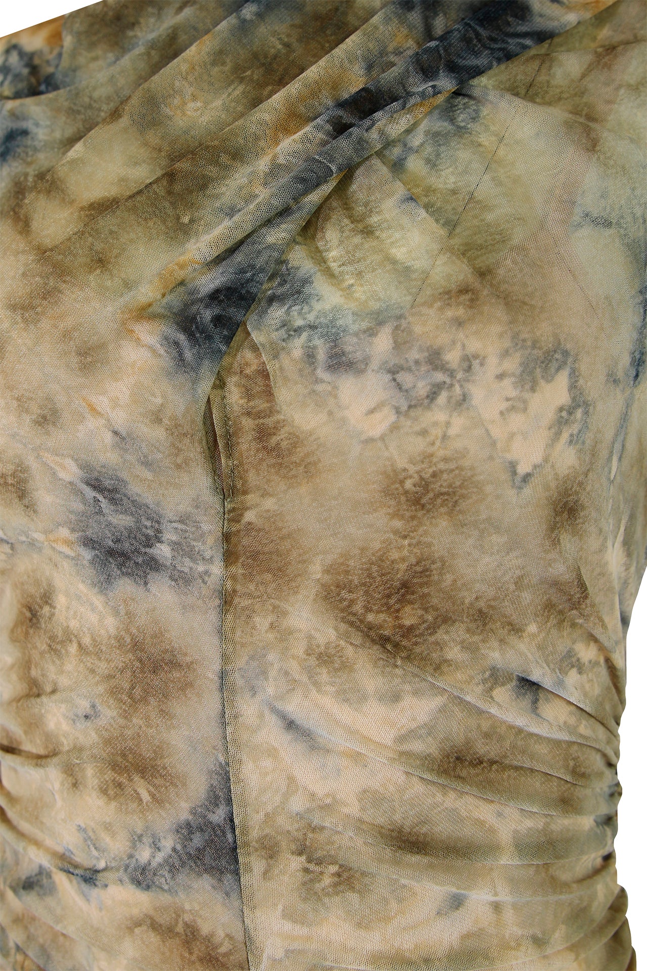 Vestido midi em tule estampado. Gola alta. Efeito drapeado. Com lining. Abertura lateral.